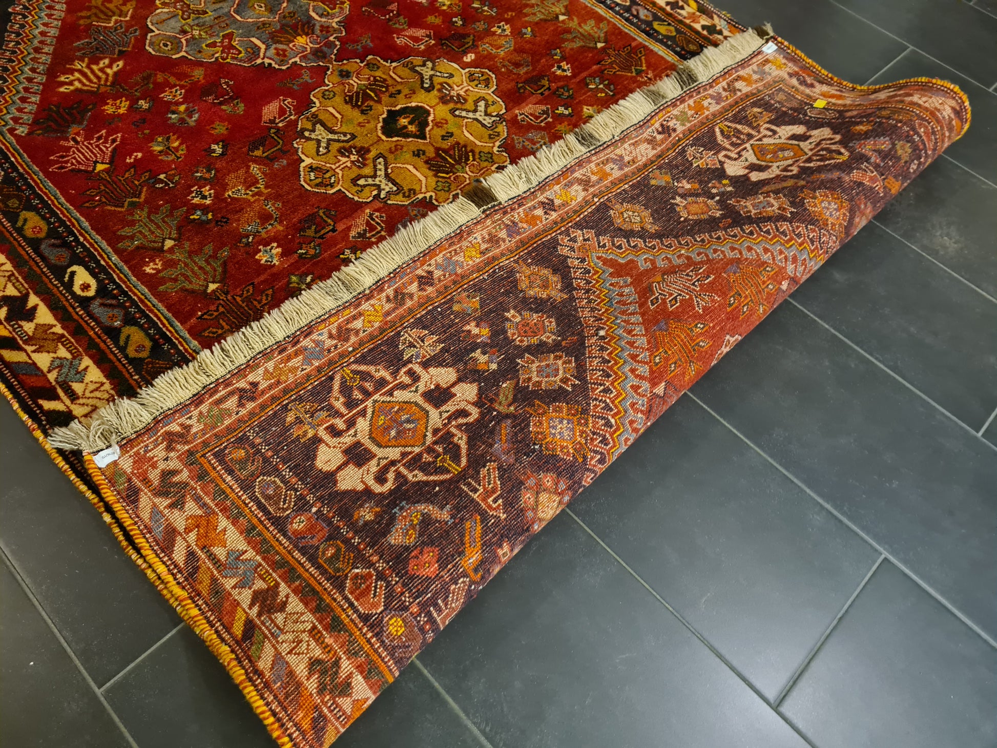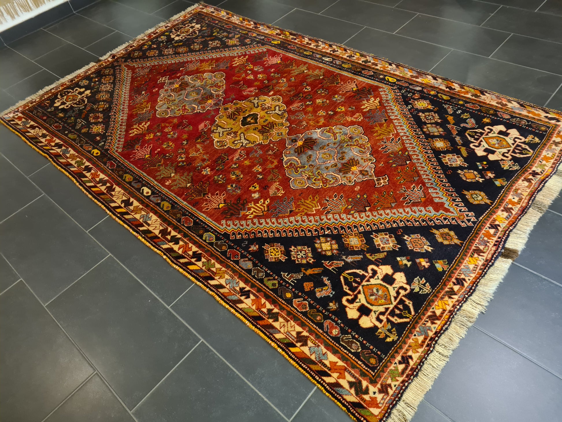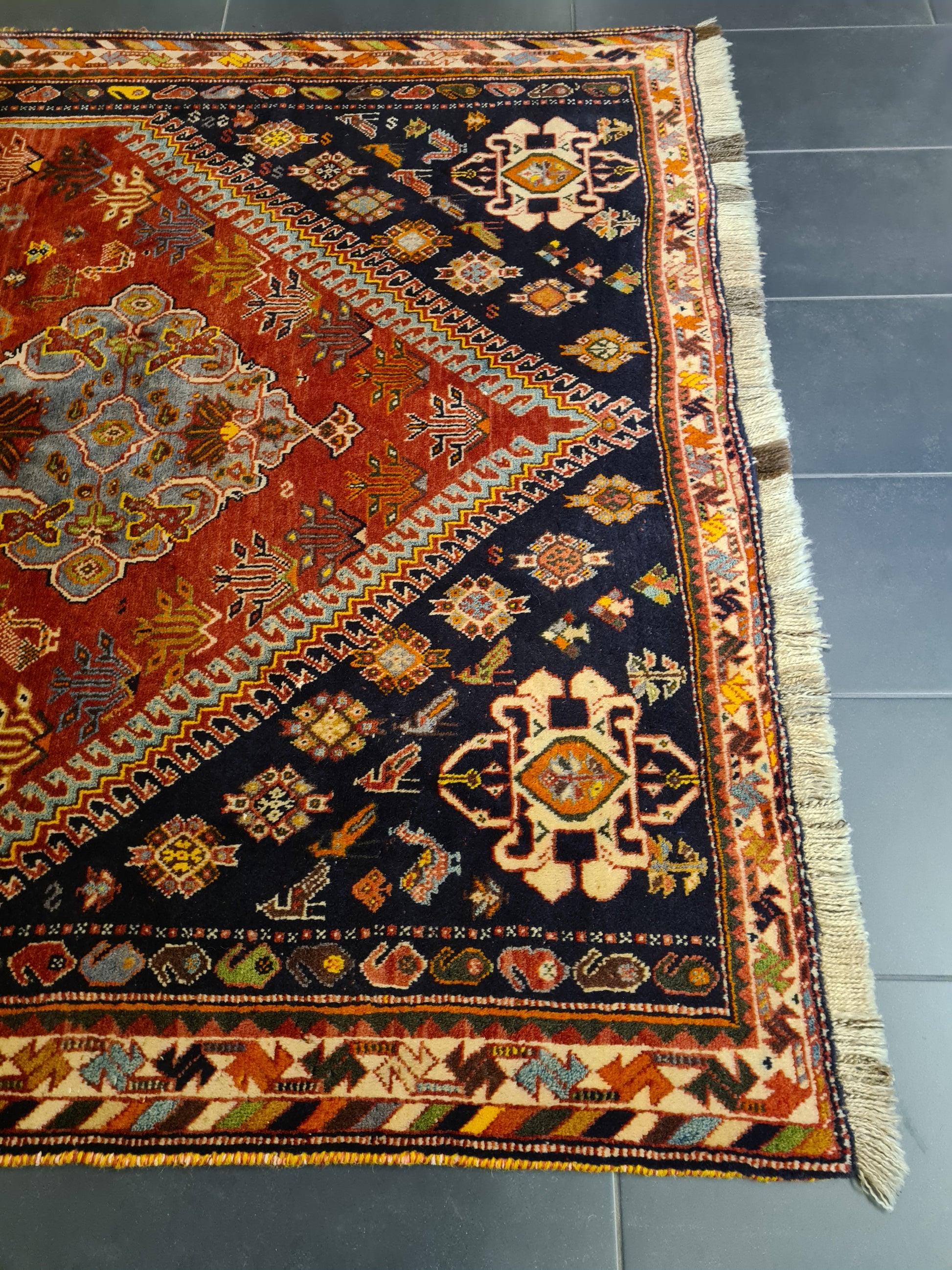 • Motiv: Geometrische und florale Muster, typisch für Shiraz-Knüpfkunst