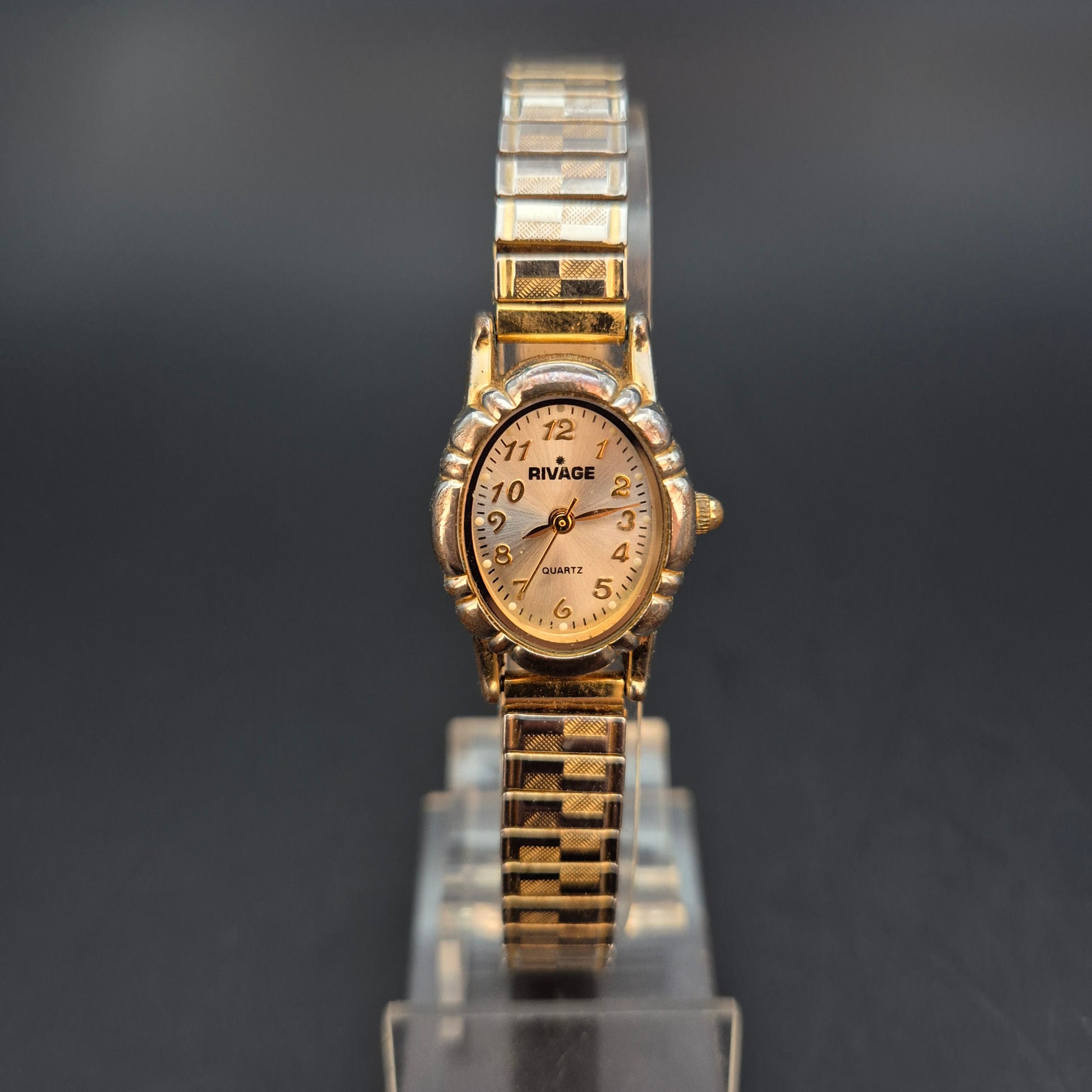 Diese charmante Rivage Damen Uhr vereint Eleganz mit hohem Tragekomfort. Das ovale, goldfarbene Gehäuse harmoniert perfekt mit dem schimmernden Zifferblatt, auf dem schwarze arabische Ziffern die Zeit anzeigen. Das flexible Stretcharmband in Gold und Silber mit strukturierter Oberfläche passt sich mühelos jedem Handgelenk an.
