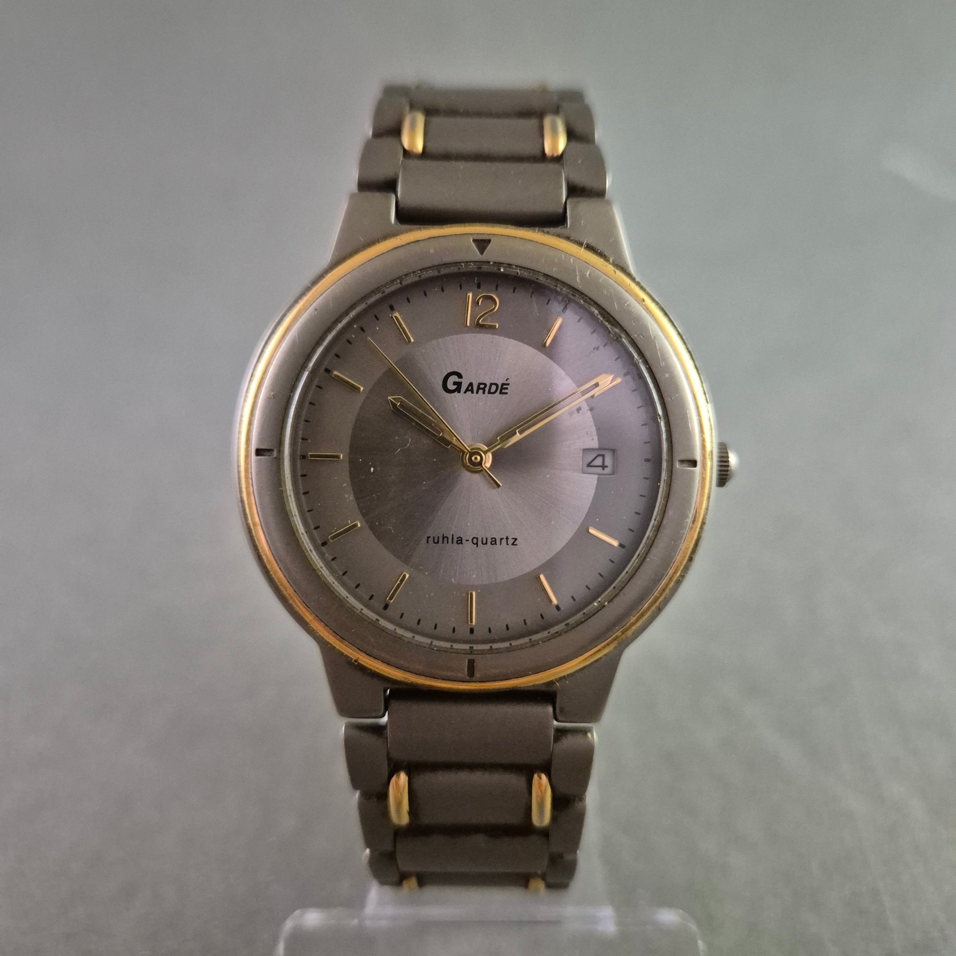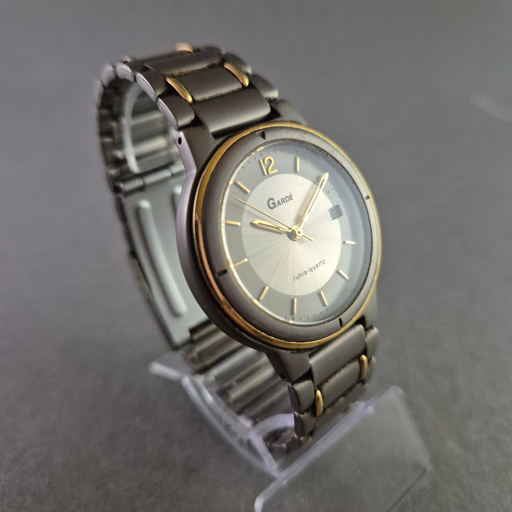 Diese hochwertige Unisex Uhr der Marke GARDÉ verbindet Funktionalität mit einem ansprechenden Design. Das Gehäuse und das Gliederarmband sind aus leichtem und robustem Titanium gefertigt und werden durch elegante goldfarbene Akzente stilvoll ergänzt, was einen attraktiven Bicolor-Look erzeugt. Das schlichte graue Zifferblatt mit goldenen Indizes und einem praktischen Datumsfenster bei 3 Uhr sorgt für eine klare Ablesbarkeit. Ausgestattet mit einem zuverlässigen ruhla-quartz Uhrwerk und wasserdicht bis 5 ATM, ist diese Uhr ein idealer Begleiter für den Alltag.
