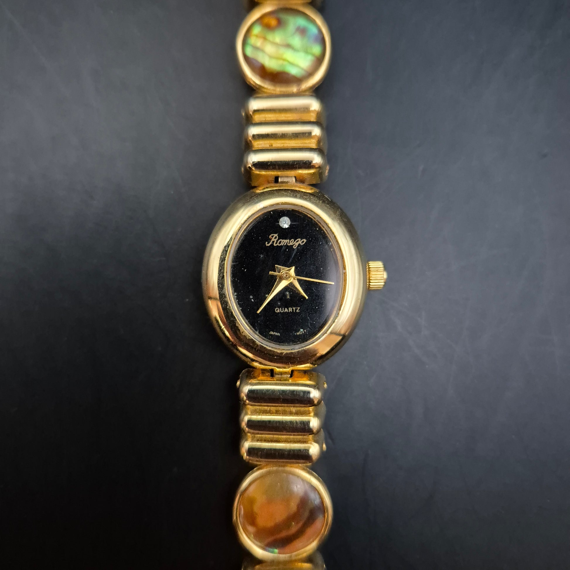 Diese stilvolle Damen Uhr der Marke Romago verbindet klassische Eleganz mit luxuriösen Details. Das ovale Gehäuse in goldener Optik wird durch ein schwarzes Zifferblatt mit goldfarbenen Zeigern und einem funkelnden Stein auf 12 Uhr ergänzt. Besonderes Highlight ist das Armband mit kunstvoll eingearbeiteten Perlmutt-Elementen, das der Uhr einen edlen, auffälligen Look verleiht. Hinweis: Das Armband ist beschädigt.