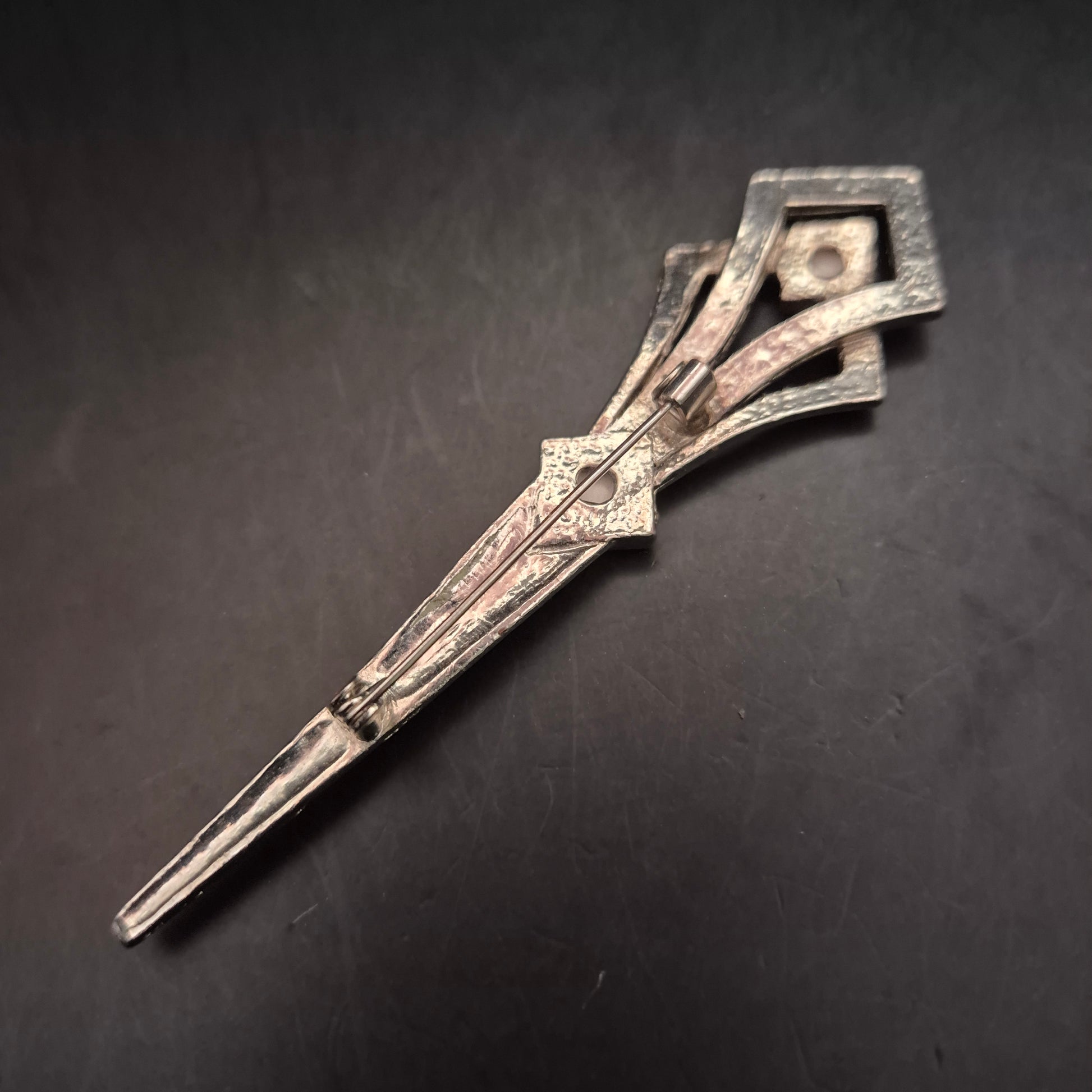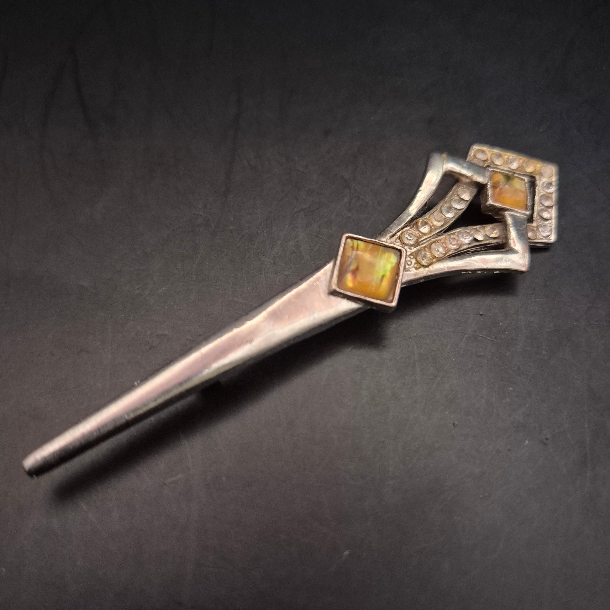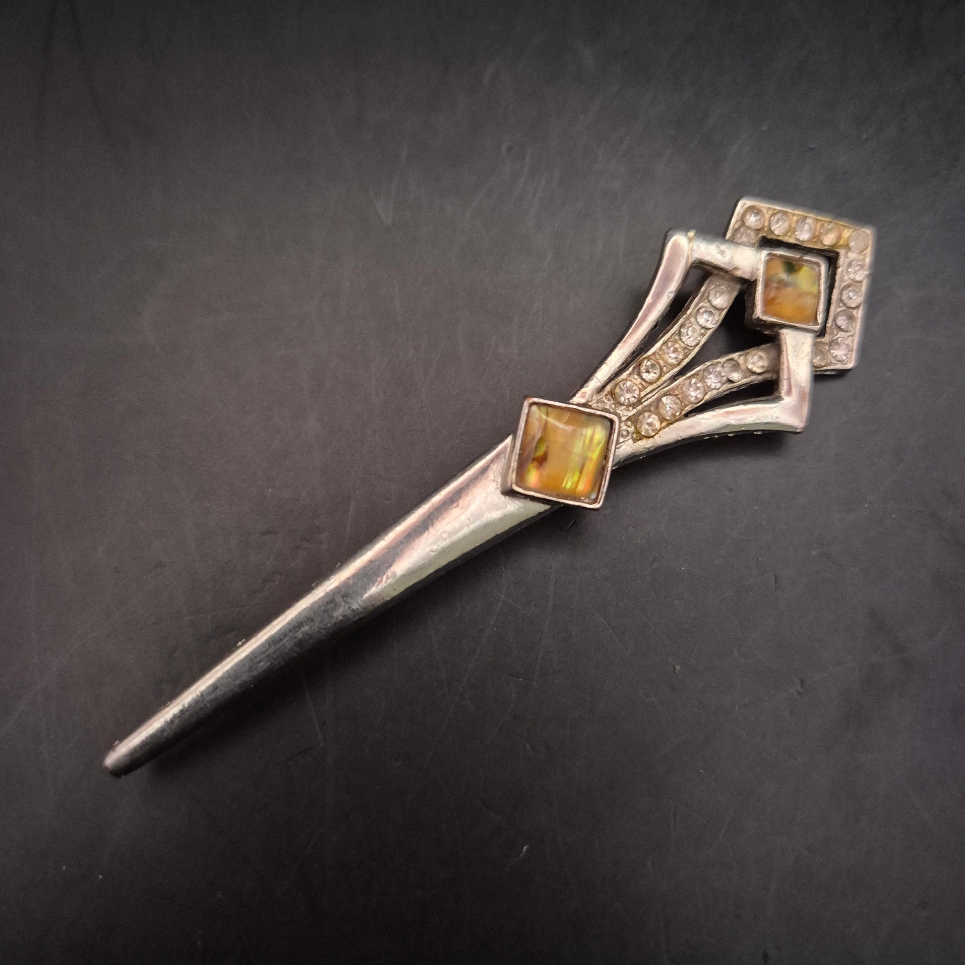 Diese schlanke, spitze Damenbrosche besticht durch ihr elegantes und stilvolles Design mit deutlichen Anleihen an den Art-Déco-Stil. Die silbern glänzende Metallbasis läuft spitz zu und wird im oberen Bereich durch ein geometrisches Arrangement hervorgehoben. Zwei quadratische Einlagen in schimmernden Braun- und Goldtönen (vermutlich Kunststoff oder Abalone-Imitat) bilden die zentralen Akzente. Sie werden flankiert von funkelnden Strasssteinen, die in geschwungenen Linien gefasst sind und dem Stück einen glamourösen Touch verleihen. Durch ihre längliche Form eignet sich diese Brosche ideal zur Verzierung von Revers, Schals oder Hüten. Auf der Rückseite befindet sich ein einfacher Nadelverschluss.