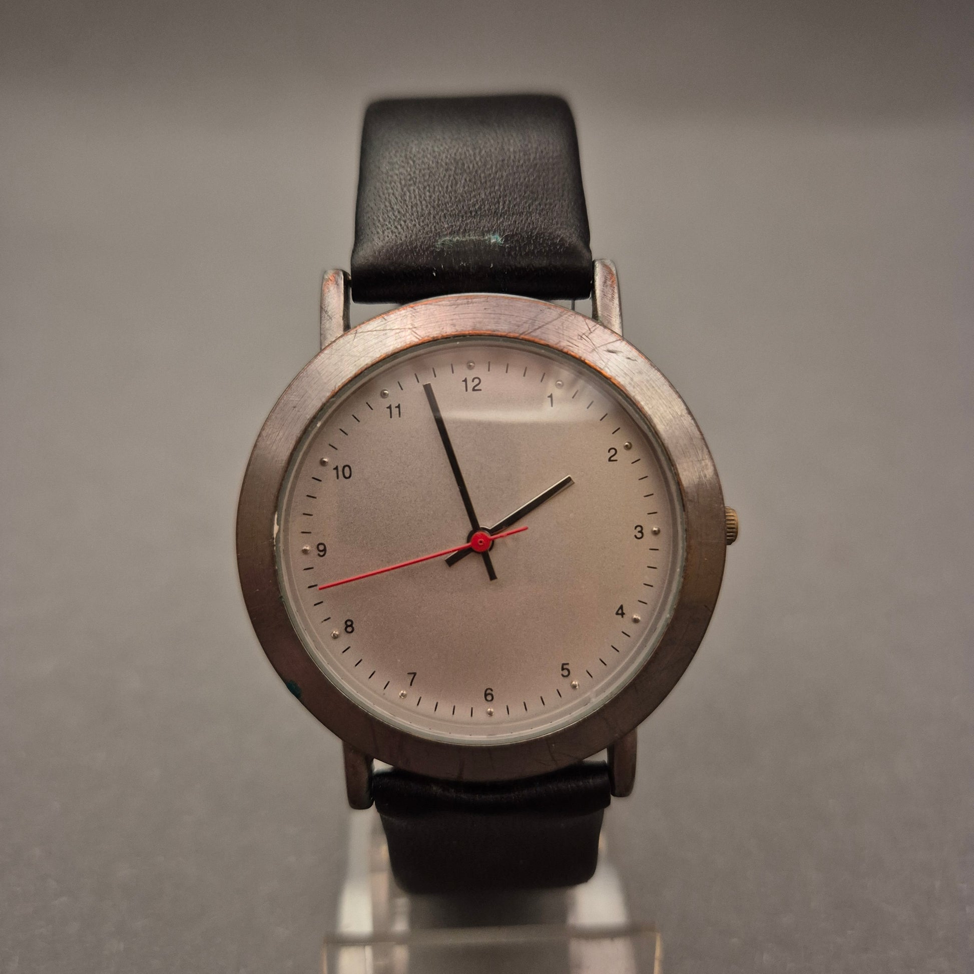Diese Herren Armbanduhr überzeugt durch ein klares und funktionales Design. Das runde Gehäuse in Silberoptik rahmt ein helles, weißes Zifferblatt ein, das mit schwarzen arabischen Ziffern und feinen Minuterien sehr gut ablesbar ist. Der auffällige rote Sekundenzeiger setzt einen modernen Akzent zum ansonsten minimalistischen Schwarz-Weiß-Design. Das klassische schwarze Kunstlederarmband sorgt für einen angenehmen Tragekomfort und macht diese Uhr zu einem unaufdringlichen, aber stilvollen Begleiter für den täglichen Gebrauch. Details: