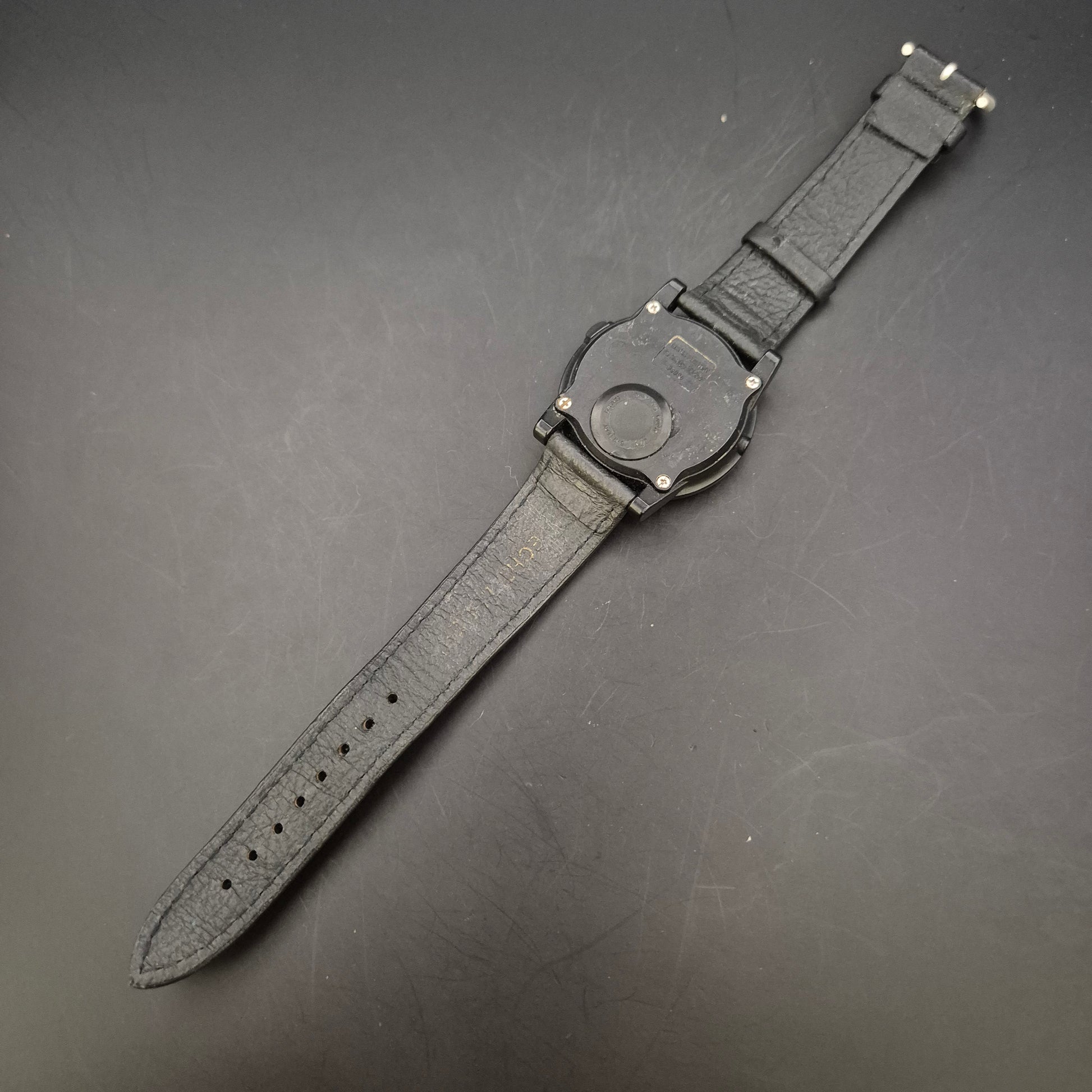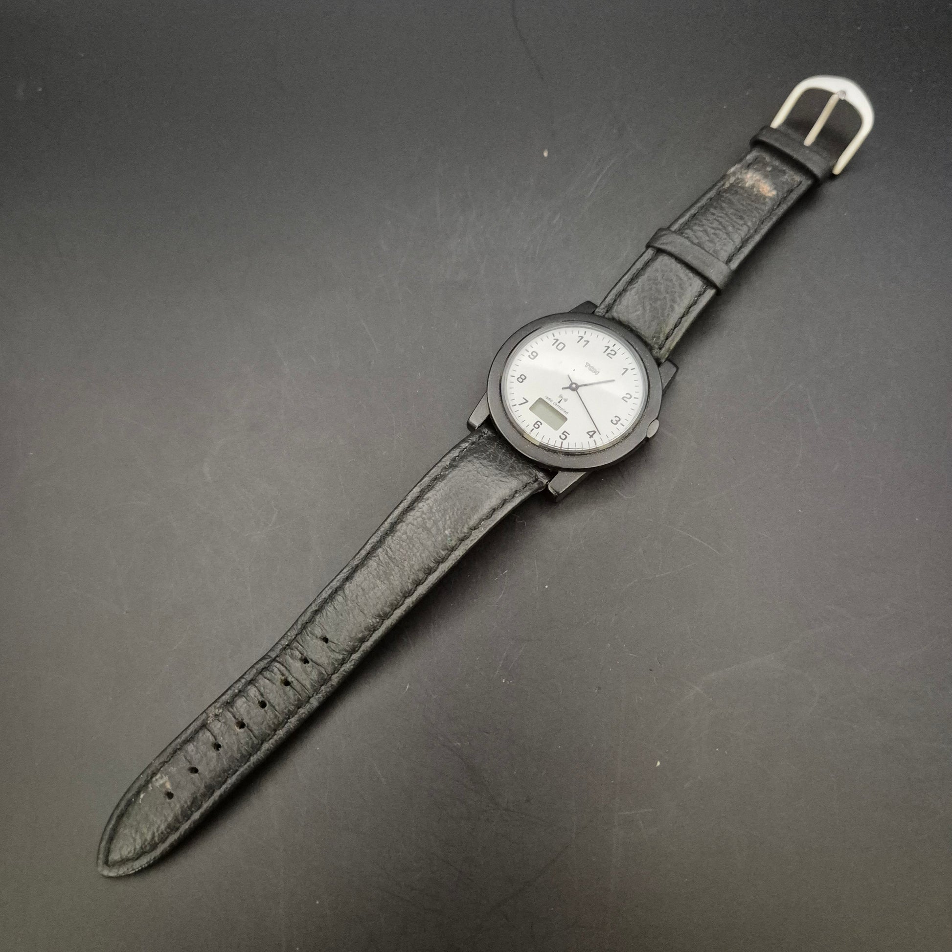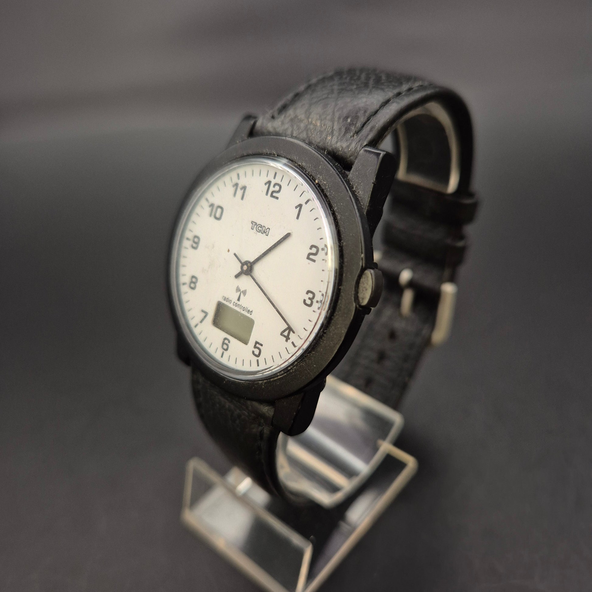 Diese TCM Herrenuhr kombiniert analoge Zeiger mit einem kleinen digitalen Display, gesteuert durch Funktechnologie („radio controlled“), was eine präzise Zeitanzeige sicherstellt. Das Zifferblatt ist schlicht gehalten mit klaren Zahlen und Minutenstrichen, das Gehäuse wirkt matt-schwarz und robust. Das Armband scheint aus Leder oder Lederimitat zu sein und zeigt Gebrauchsspuren, was auf längere Nutzung hindeutet. Auf der Rückseite ist vermerkt, dass die Batterie eine CR1220 Knopfzelle ist und das Gehäuse „Stainless Steel“ sein soll.