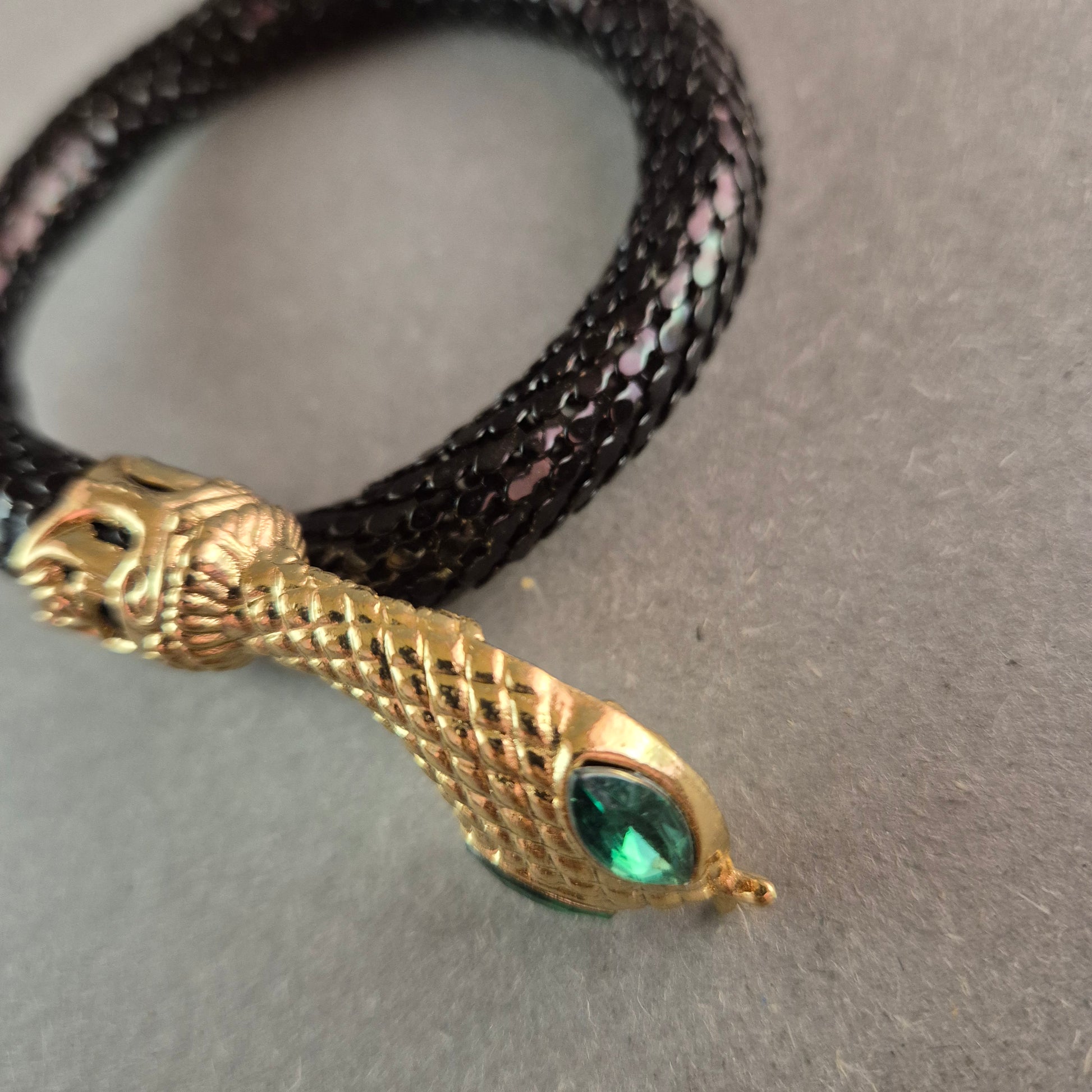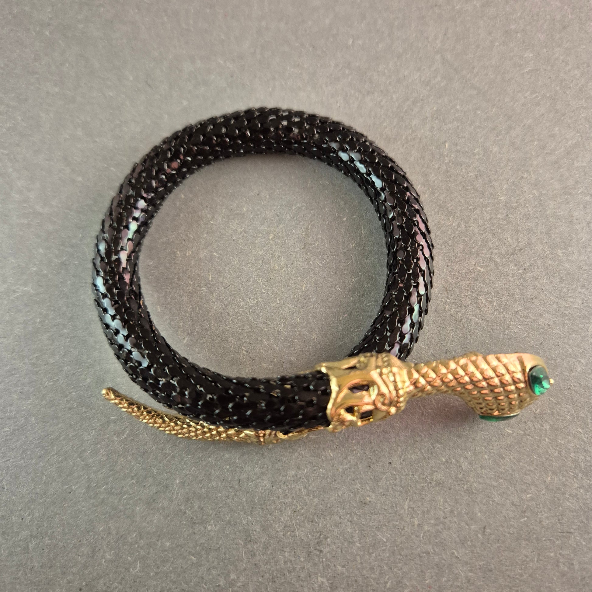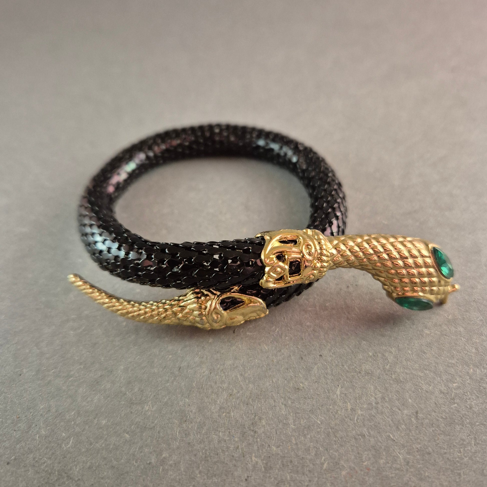 Schwarzer Vintage-Schlangenarmreif mit goldener Schlangenkopf-Fassung