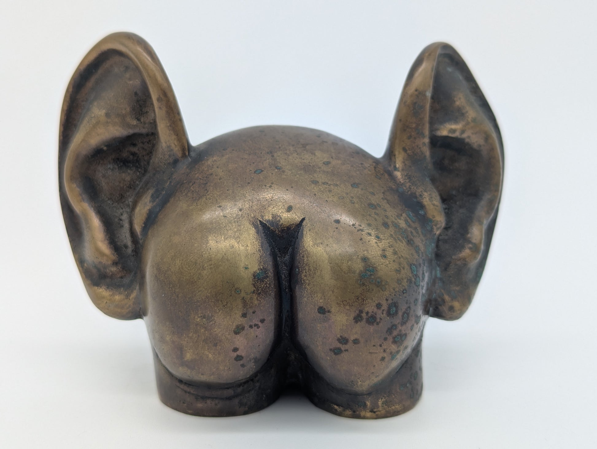 Dieses Set umfasst zwei massive Figuren aus Bronze mit dem humorvollen Namen „Arsch mit Ohren“. Die Skulpturen zeigen ein ungewöhnliches, witziges Design, das jedem Raum eine besondere Note verleiht.