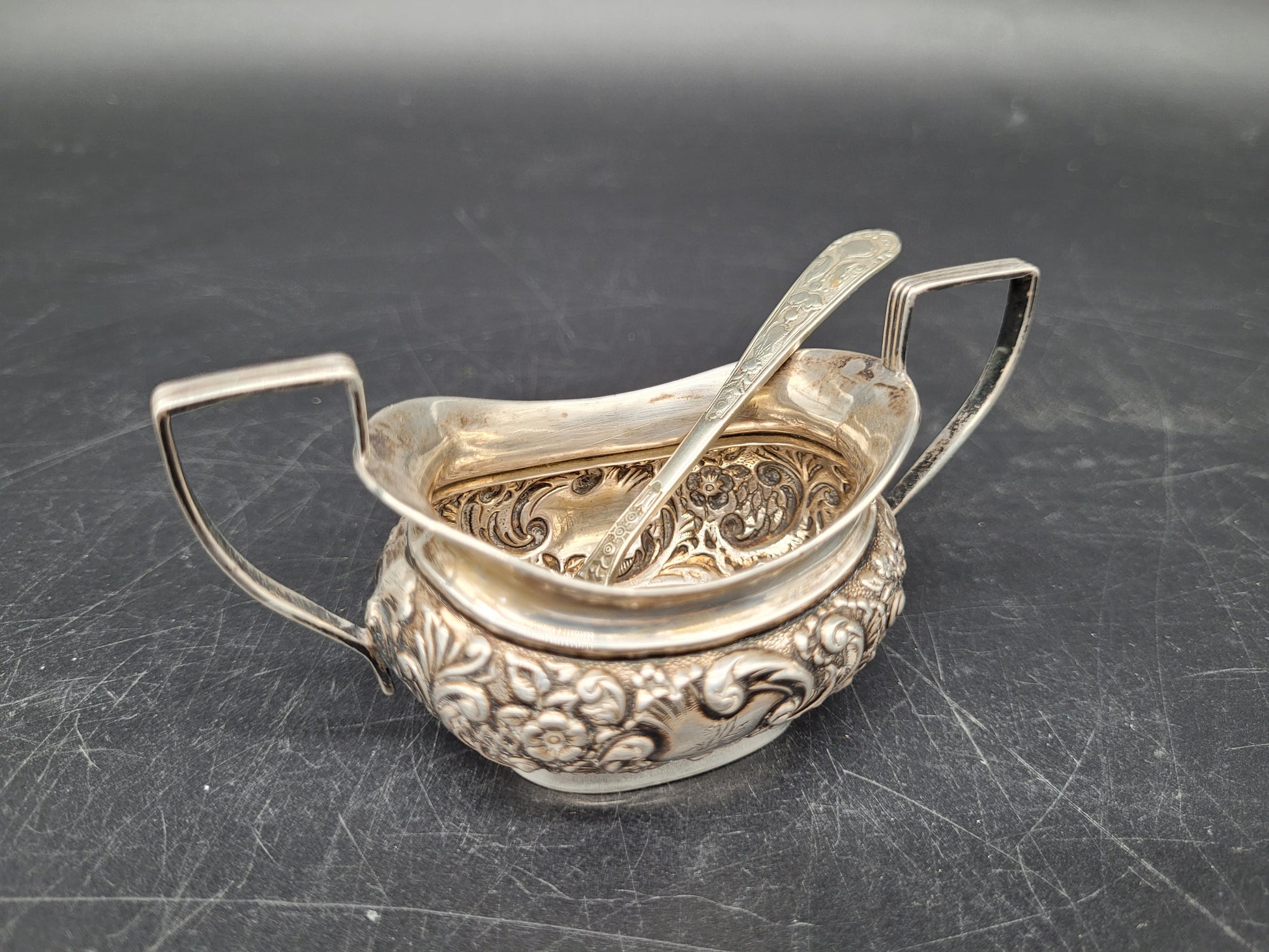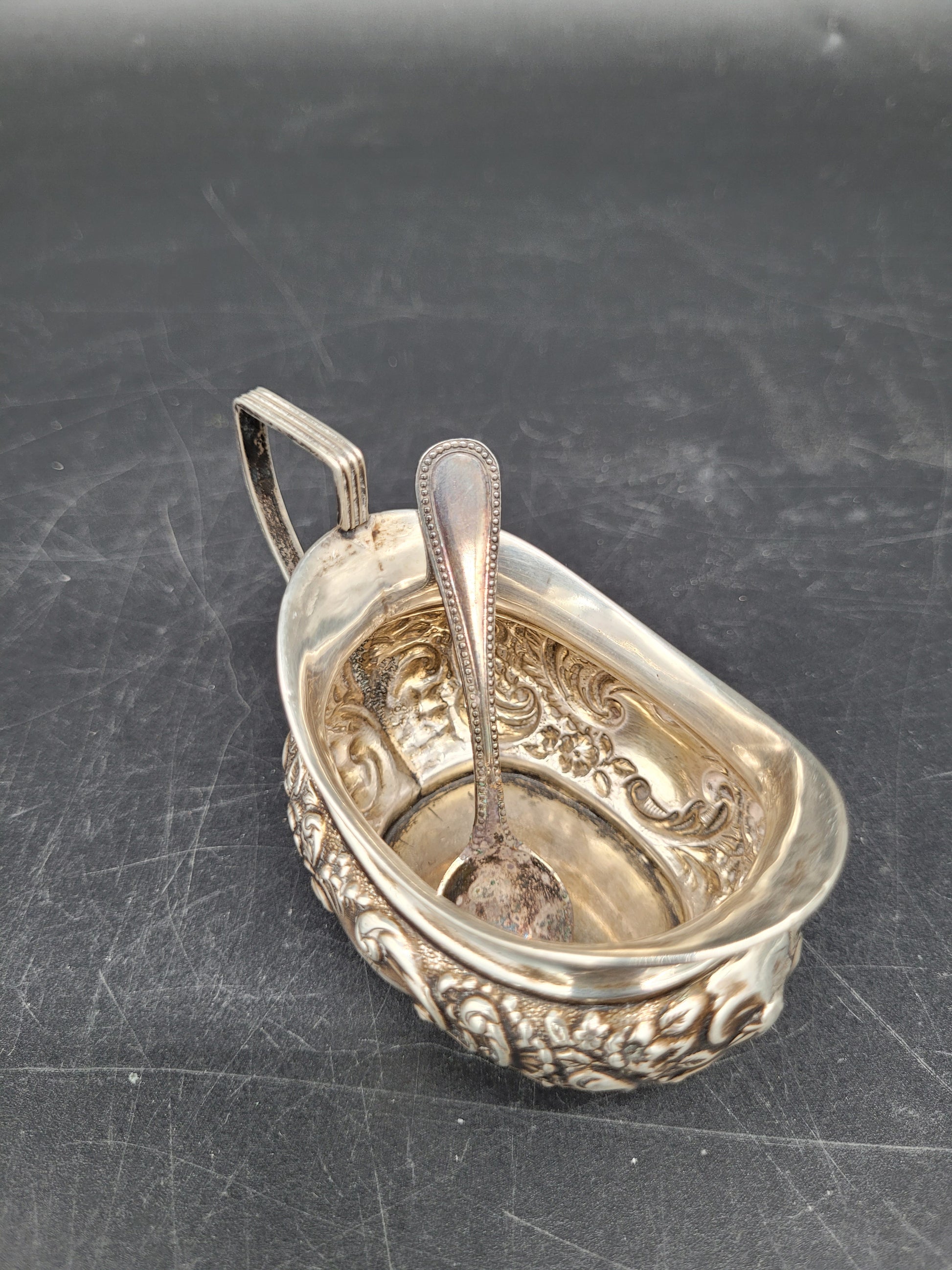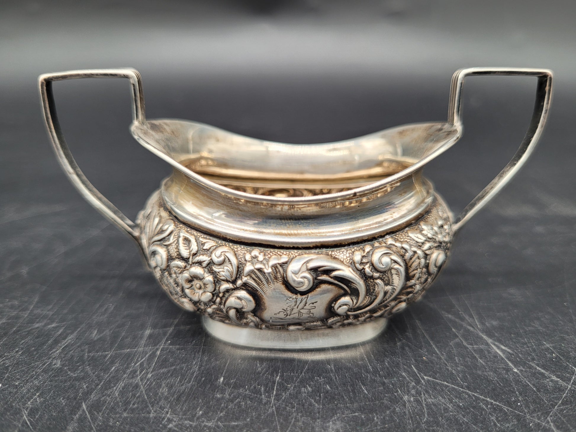 Dieses reizvolle Set besteht aus zwei kunstvoll verzierten Milchkännchen aus 925er Sterling Silber, jeweils ergänzt durch einen passenden Silberlöffel. Die reiche florale Ornamentik und die feine Ausarbeitung verleihen den Stücken eine besondere Eleganz. Durch ihre handliche Größe eignen sie sich perfekt als edles Tafelgeschirr, zugleich aber auch als begehrte Sammlerstücke britischer Silberschmiedekunst.