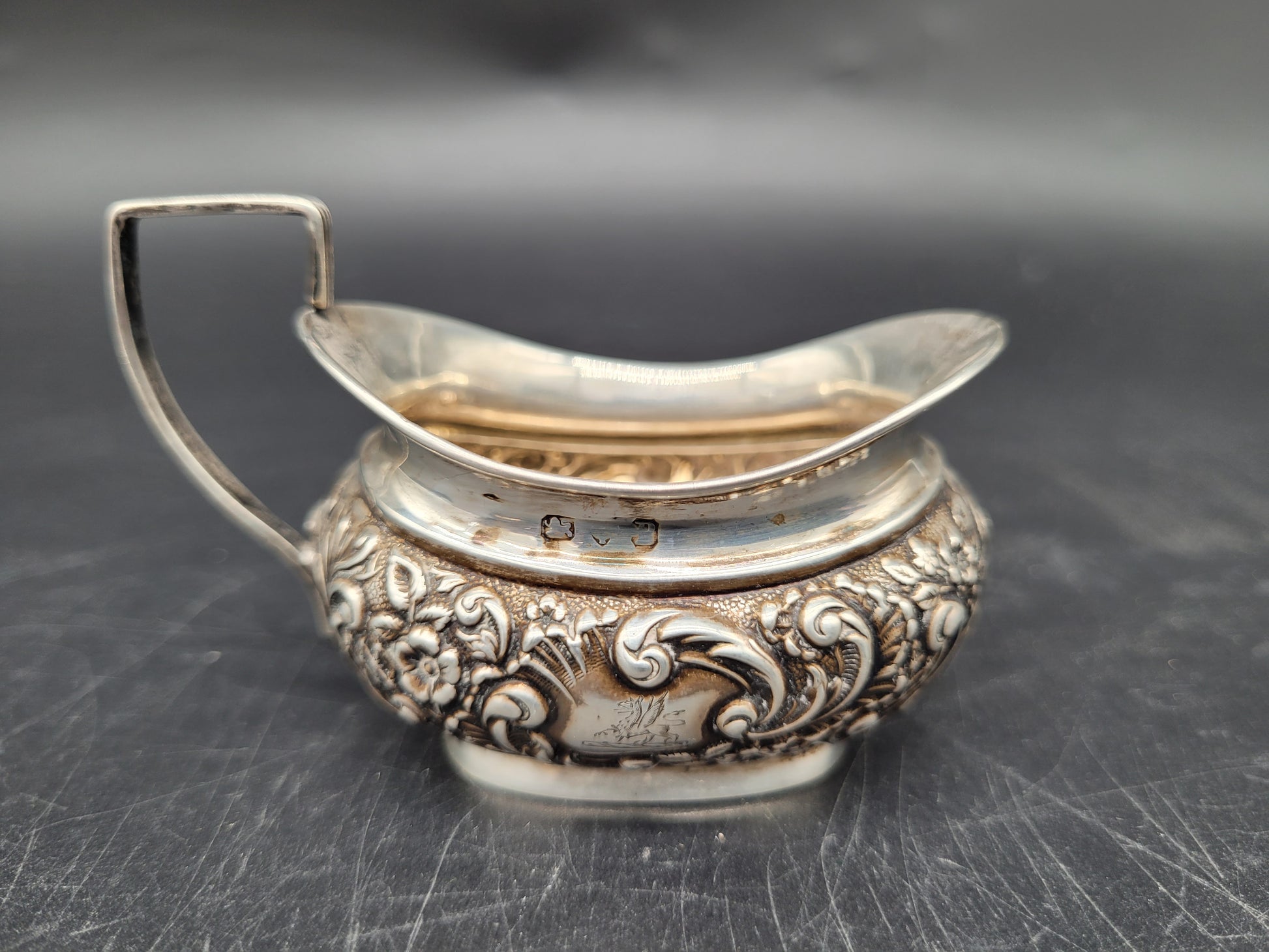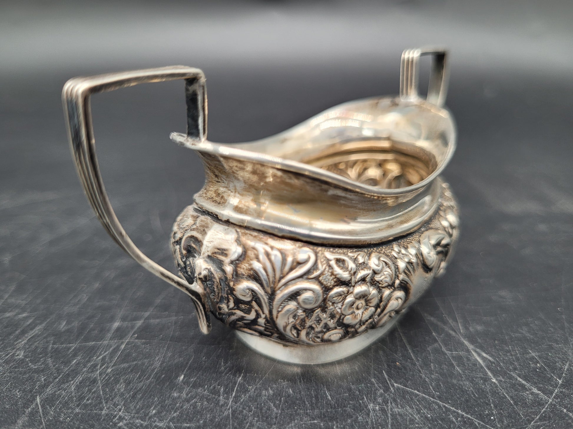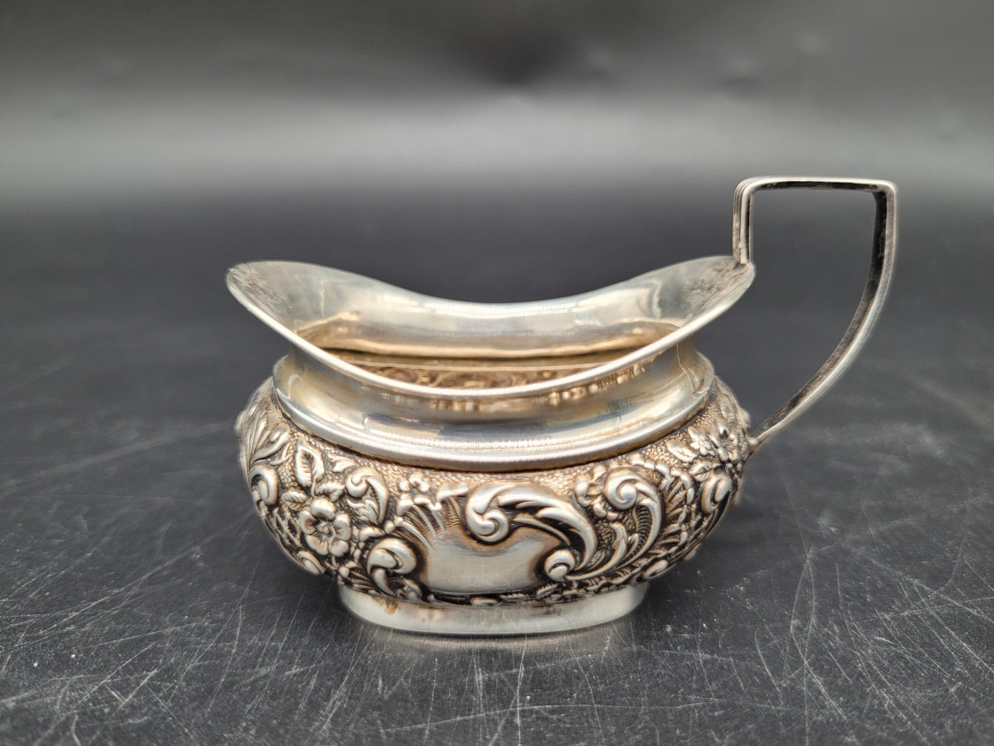 Dieses reizvolle Set besteht aus zwei kunstvoll verzierten Milchkännchen aus 925er Sterling Silber, jeweils ergänzt durch einen passenden Silberlöffel. Die reiche florale Ornamentik und die feine Ausarbeitung verleihen den Stücken eine besondere Eleganz. Durch ihre handliche Größe eignen sie sich perfekt als edles Tafelgeschirr, zugleich aber auch als begehrte Sammlerstücke britischer Silberschmiedekunst.