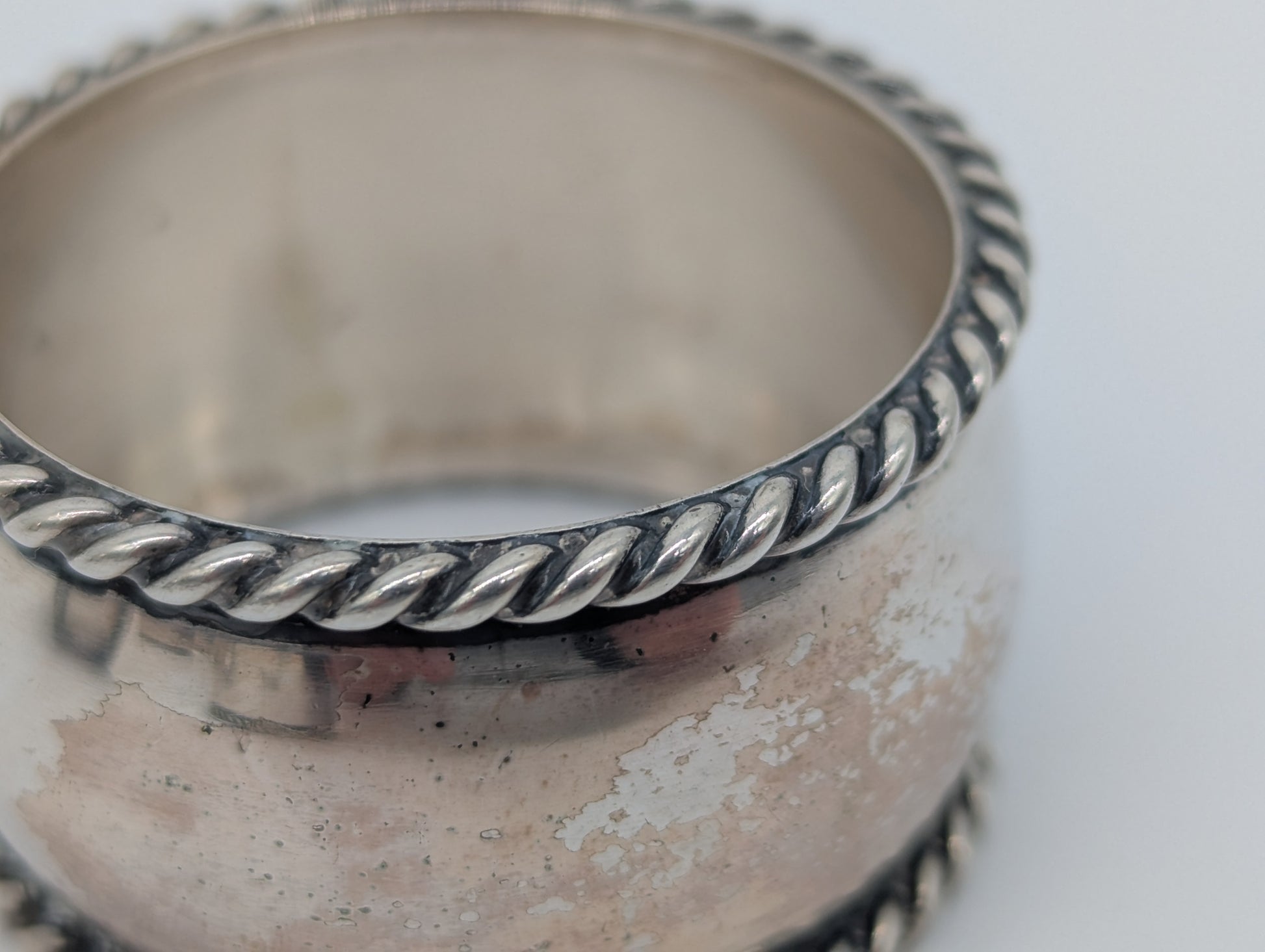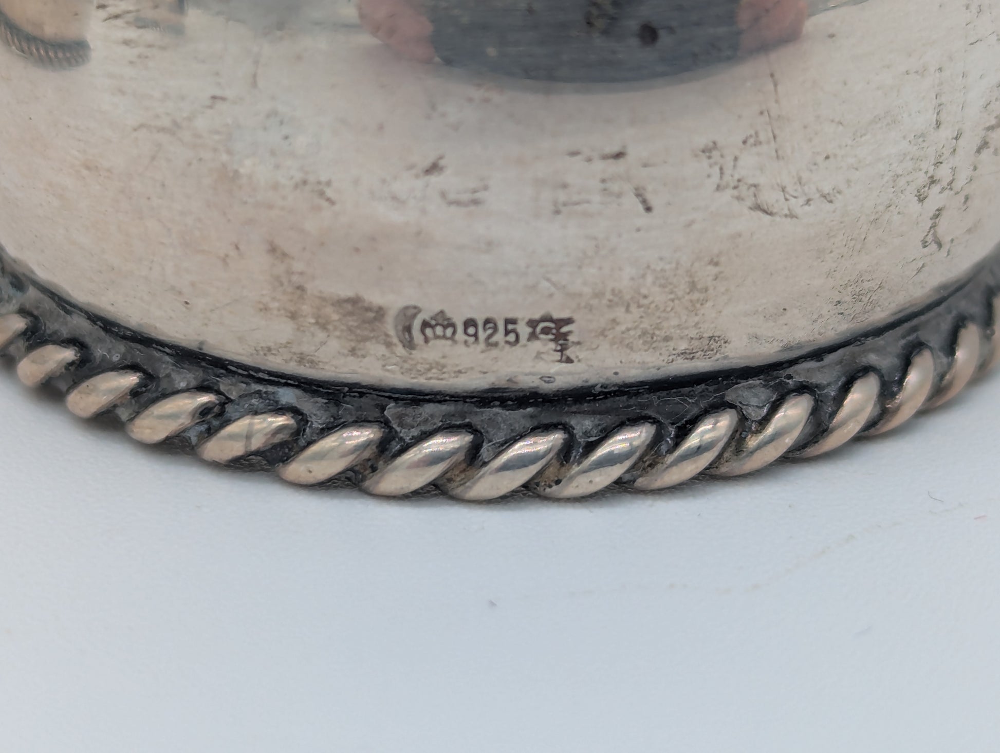 Dieses elegante Set besteht aus sechs Serviettenringen aus 925er Sterling Silber aus Deutschland. Die Ringe sind umlaufend mit einem dekorativen Kordelrand verziert, was ihnen einen edlen und zugleich klassischen Charakter verleiht. Einer der Ringe trägt die Gravur „Gäste“ – ein charmantes Detail mit historischem Bezug.