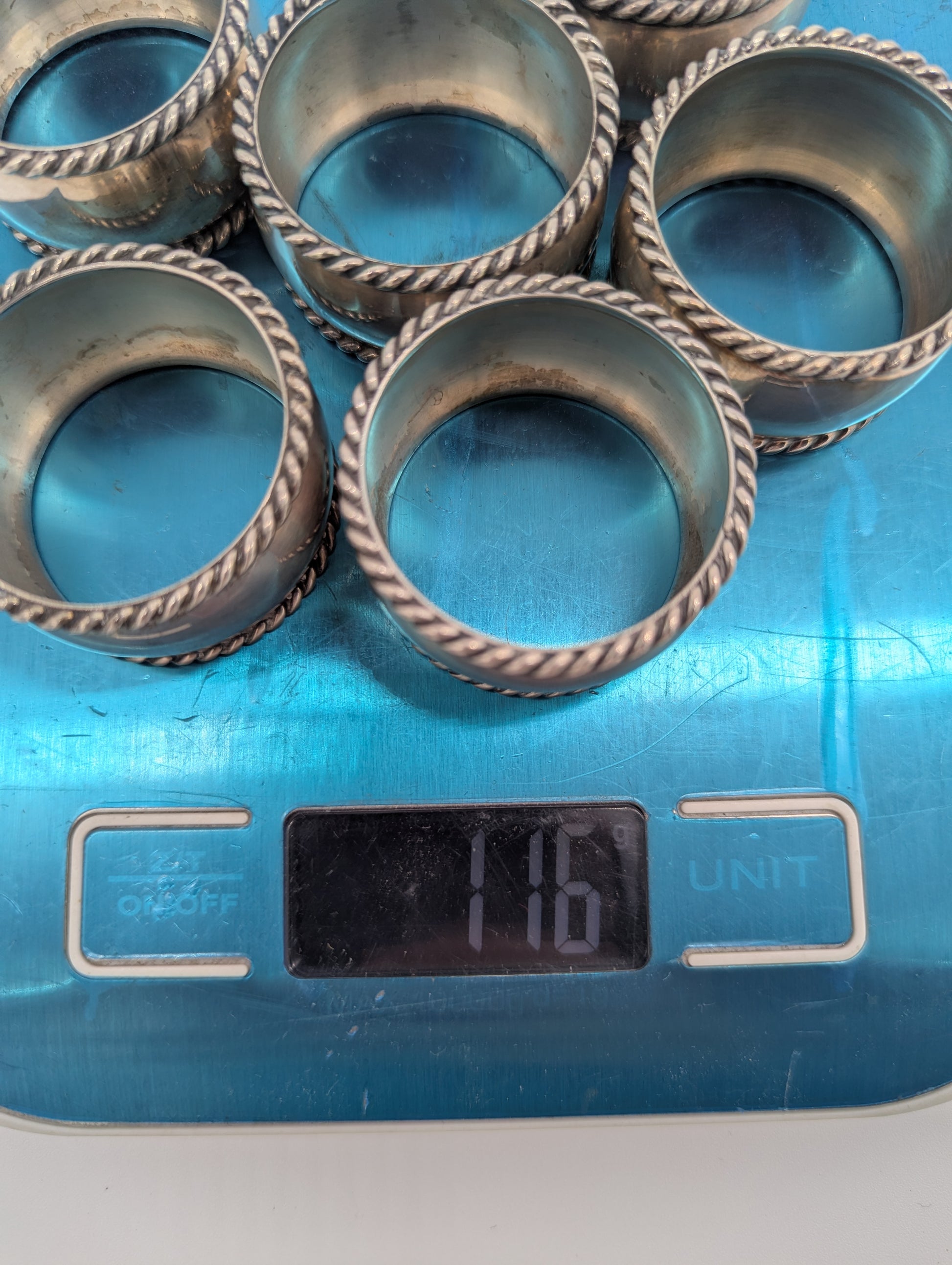 Jeder Ring hat einen Durchmesser von ca. 3,5 cm und liegt mit angenehmer Schwere in der Hand. Das Gesamtgewicht beträgt 116 g. Die Punzen „Halbmond & Krone“ sowie „925“ bestätigen die Herkunft aus Deutschland und die Ausführung in Sterling Silber. Leichte Gebrauchsspuren und Patina unterstreichen die Authentizität und den Vintage-Charakter dieser Stücke.