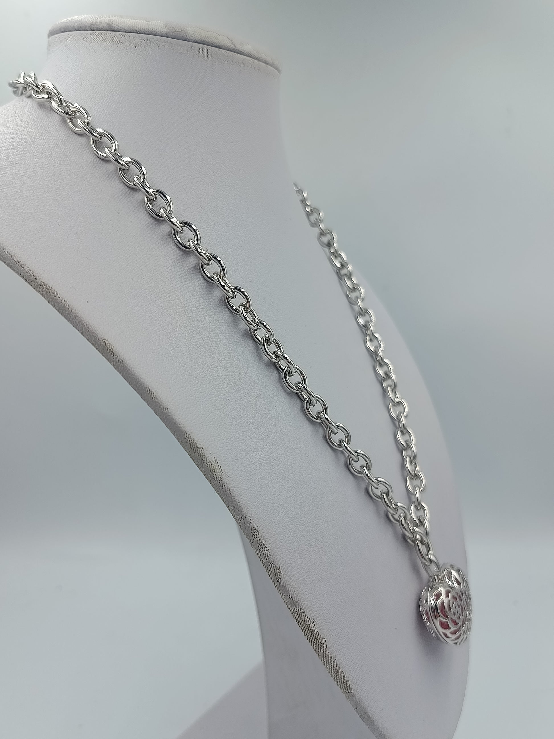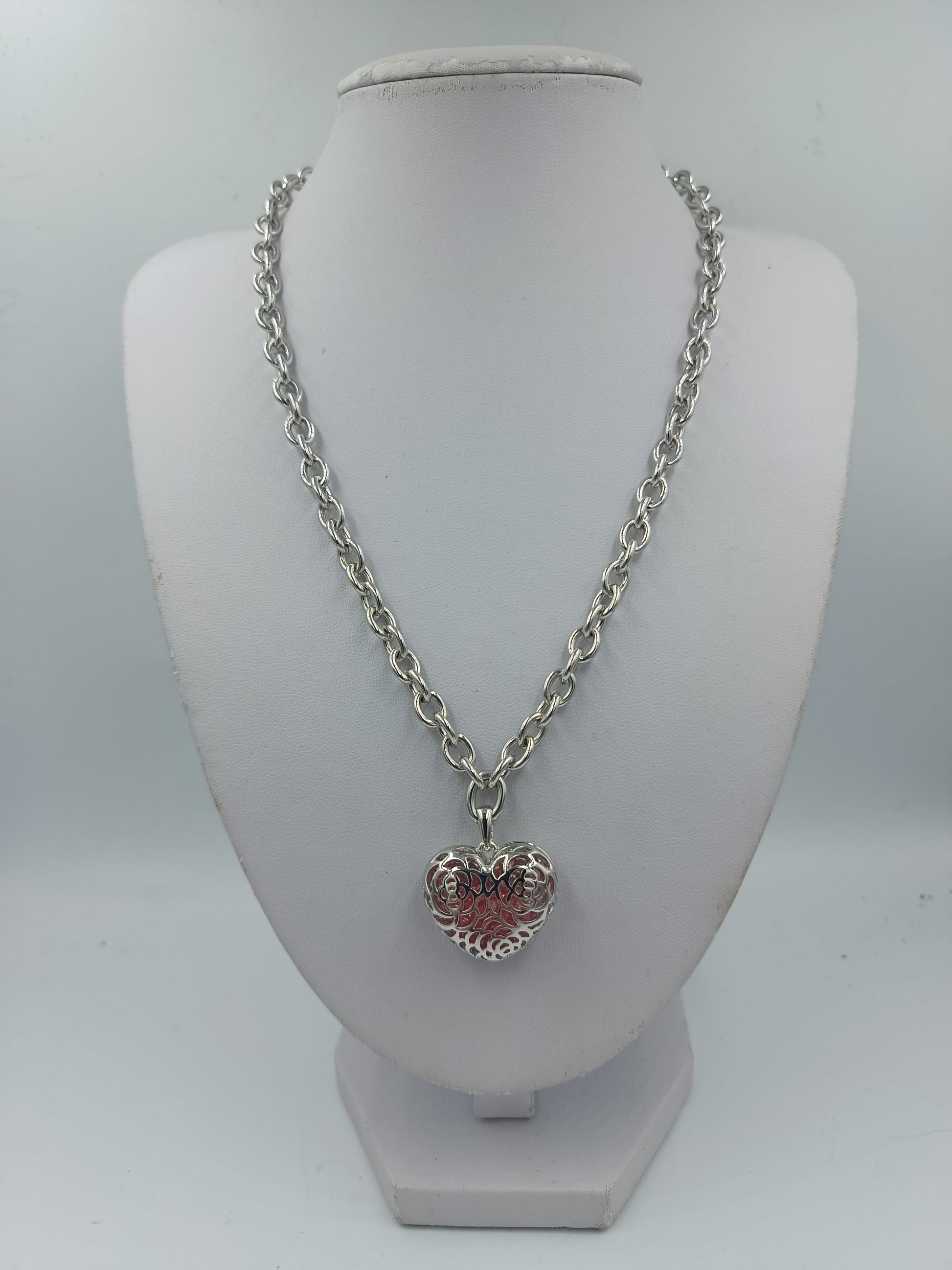 Stilvolle Halskette in silberfarbener Optik mit auffälligem Herzanhänger. Der fein gearbeitete Anhänger zeigt ein dekoratives Durchbruchmuster mit rotem Hintergrund und verleiht der Kette eine romantische Ausstrahlung. Die kräftige Gliederkette sorgt für einen sicheren Sitz und macht dieses Schmuckstück zu einem schönen Begleiter für Alltag und besondere Anlässe.