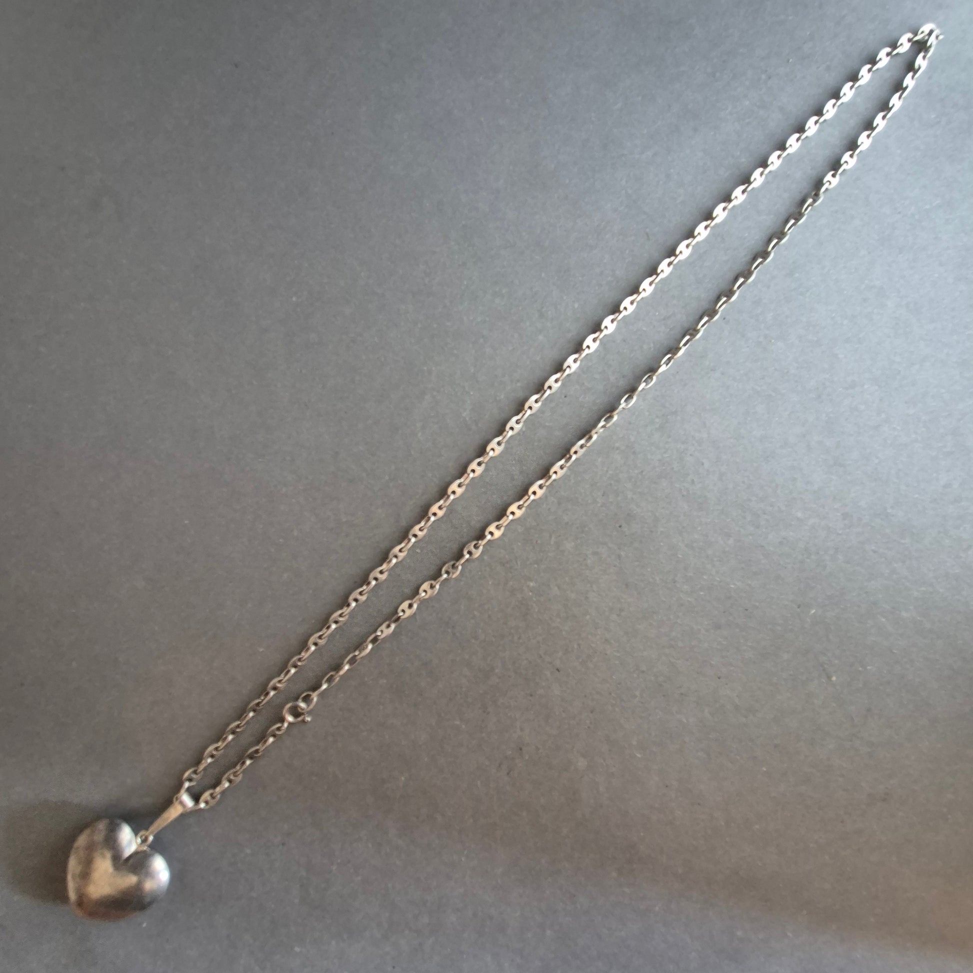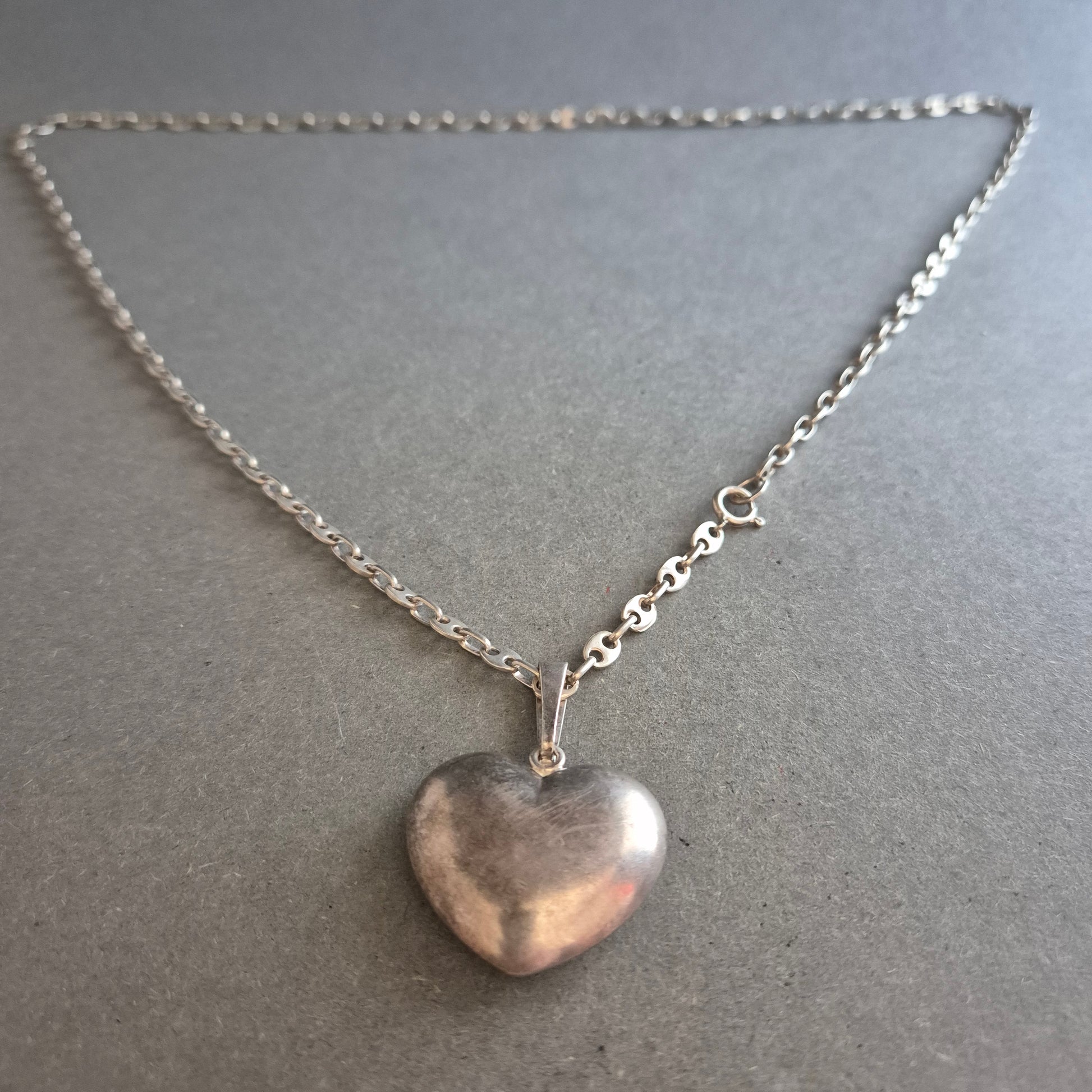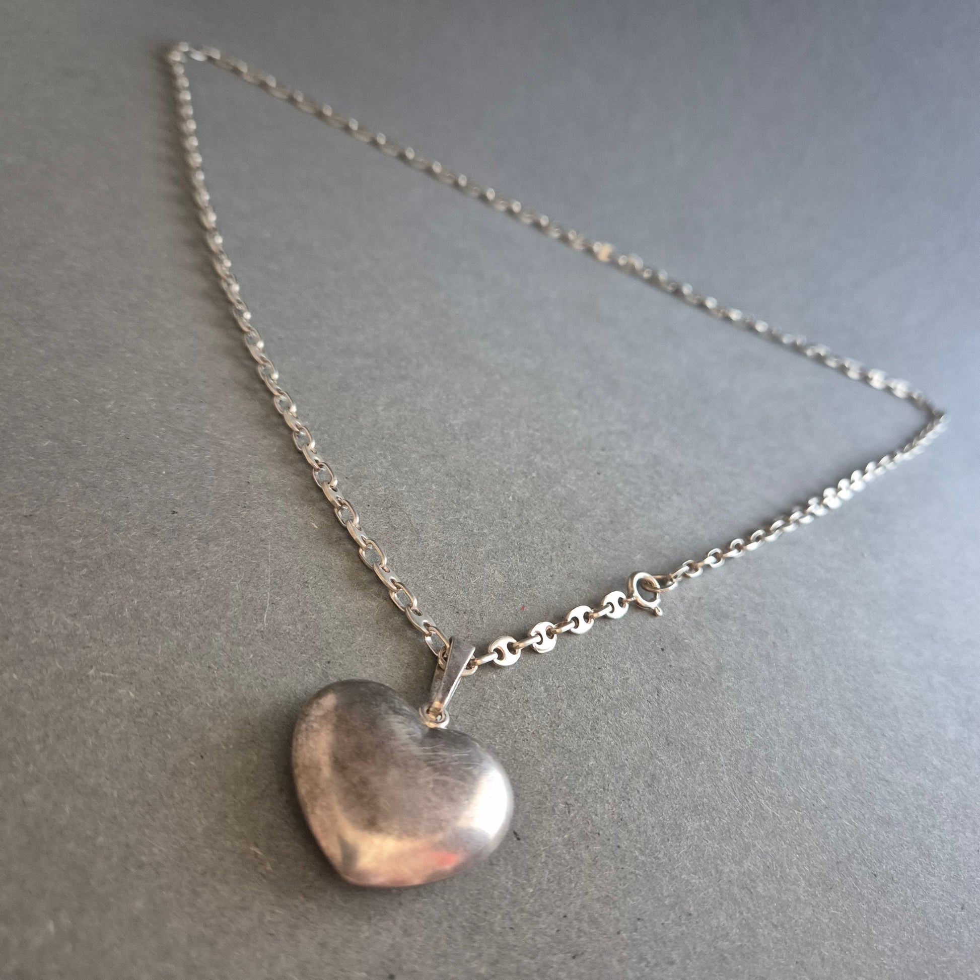 Diese charmante Halskette aus silberfarbenem Metall überzeugt mit einem klassischen Gliederdesign und einem schlichten, leicht gewölbten Herzanhänger. Der mattere Look des Anhängers verleiht dem Schmuckstück eine nostalgische Note – ideal für romantische Outfits oder als dezente Liebeserklärung im Alltag.