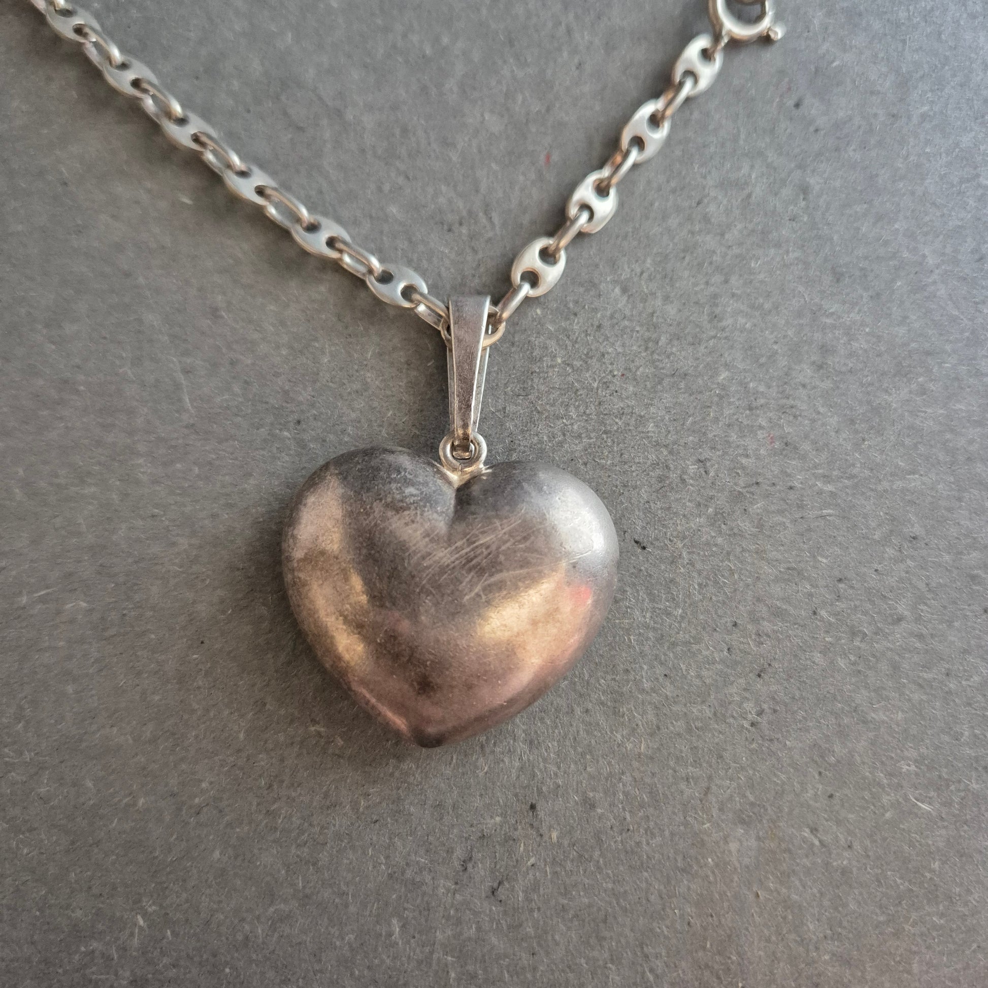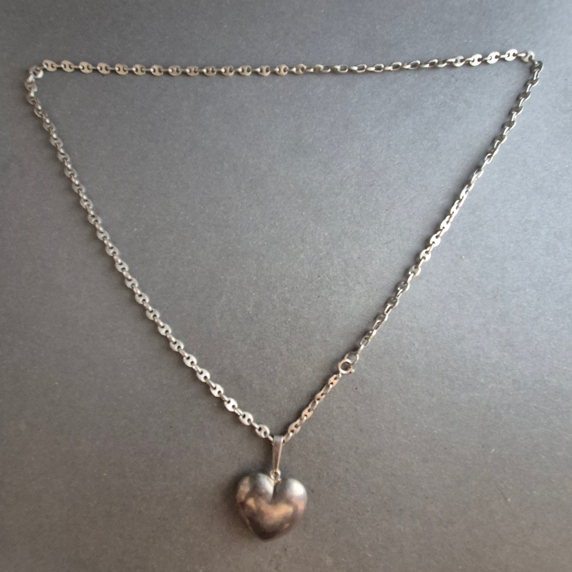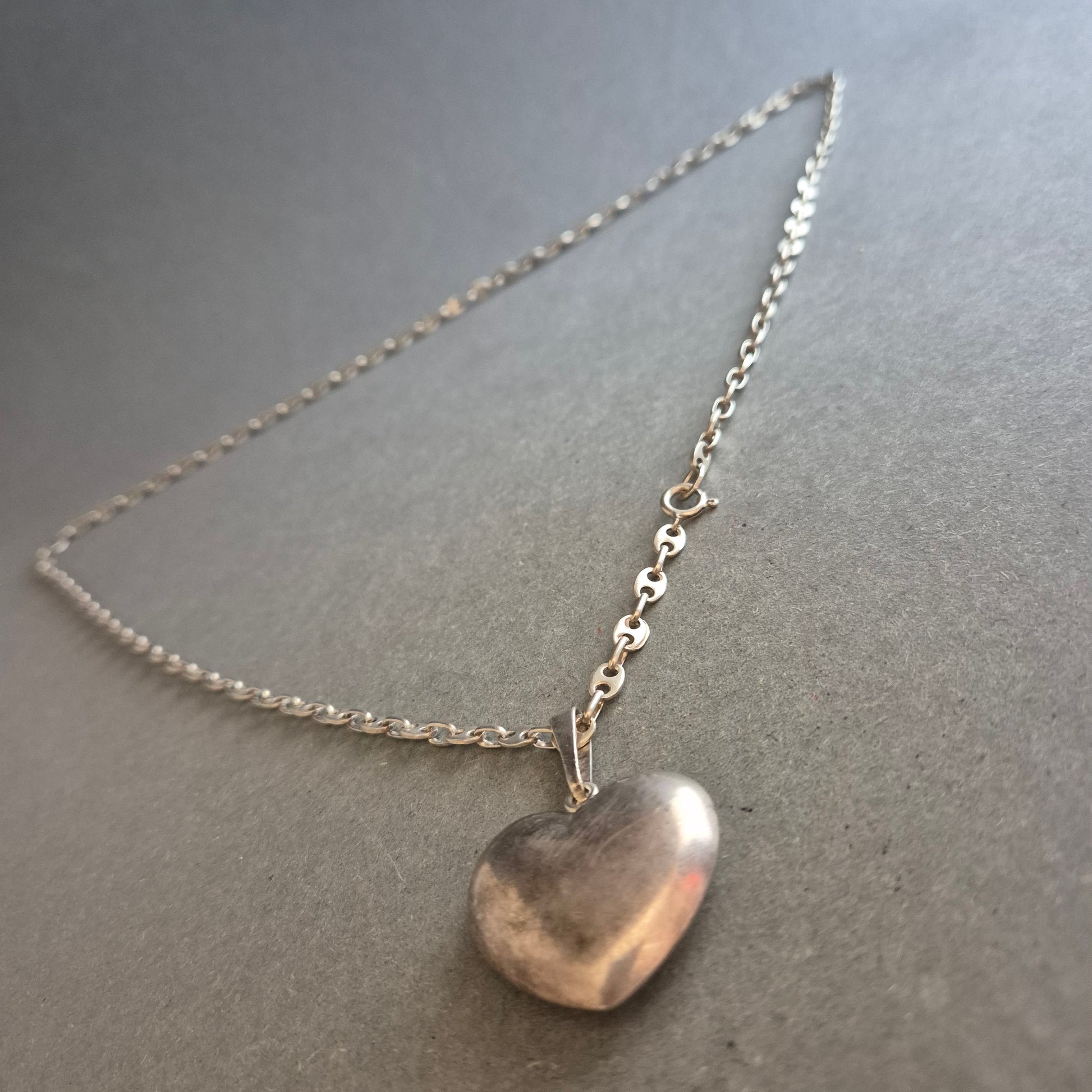 Diese charmante Halskette aus silberfarbenem Metall überzeugt mit einem klassischen Gliederdesign und einem schlichten, leicht gewölbten Herzanhänger. Der mattere Look des Anhängers verleiht dem Schmuckstück eine nostalgische Note – ideal für romantische Outfits oder als dezente Liebeserklärung im Alltag.