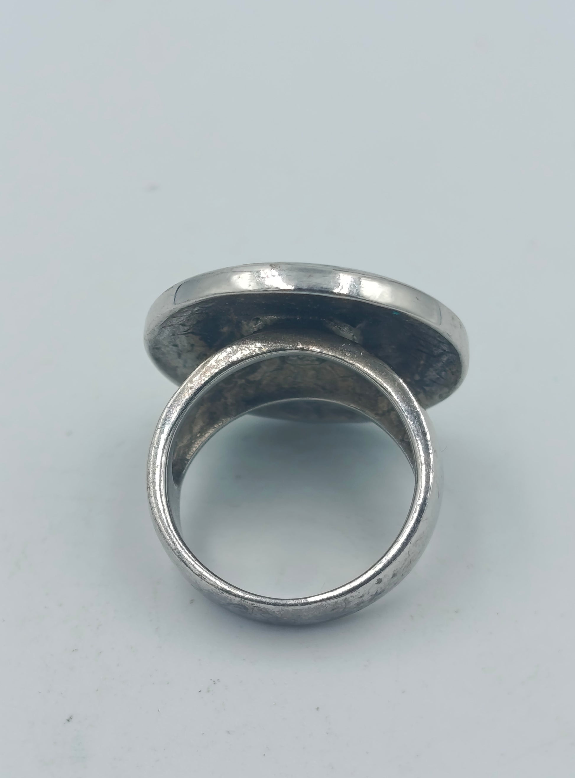 Silberfarbener Mosaikring mit blauer Spirale