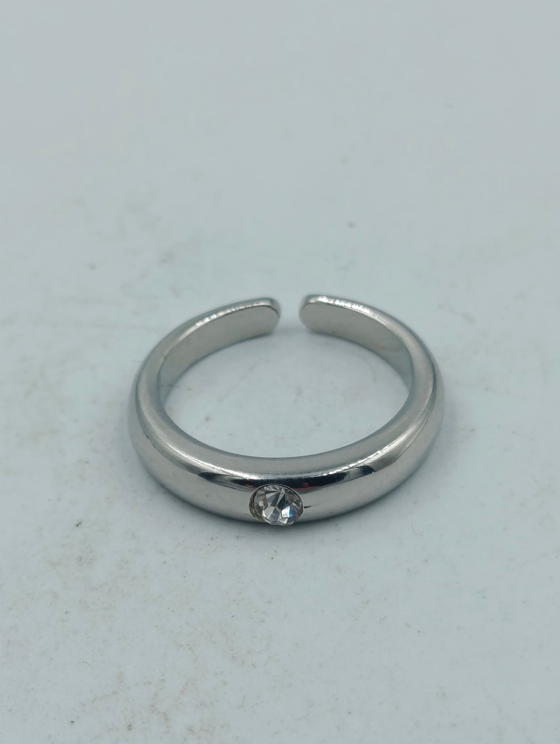 Schlichter silberfarbener Ring mit offenem Design und einem klaren Stein auf der Vorderseite. Das minimalistische Erscheinungsbild macht ihn zu einem vielseitig kombinierbaren Accessoire für Alltag und besondere Anlässe.