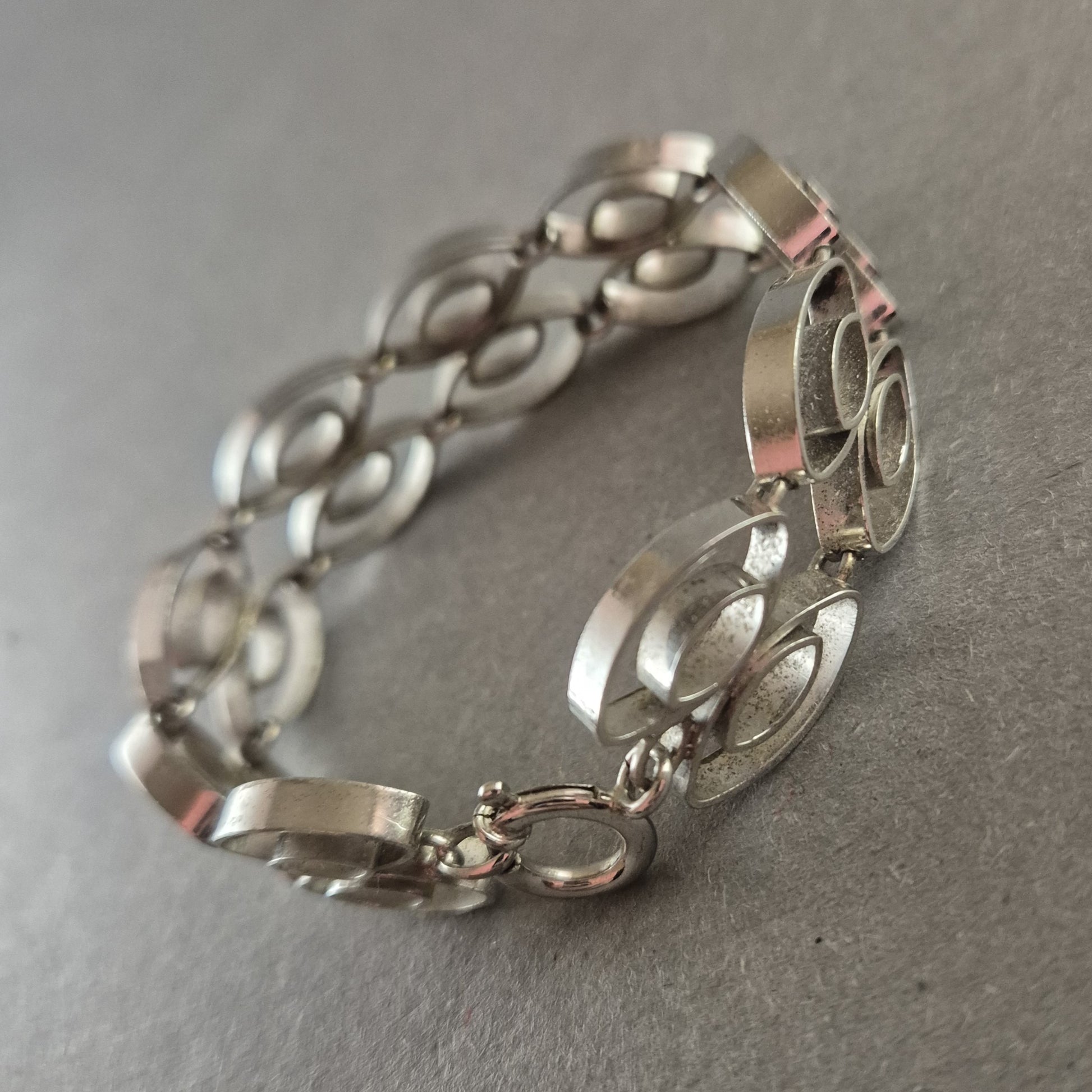 Dieses stilvolle Armband aus silberfarbenem Metall besticht durch sein modernes, geometrisches Design mit ineinander verschlungenen ovalen Elementen. Die hochwertige Verarbeitung und die polierte Oberfläche verleihen dem Schmuckstück einen eleganten und zeitlosen Look.