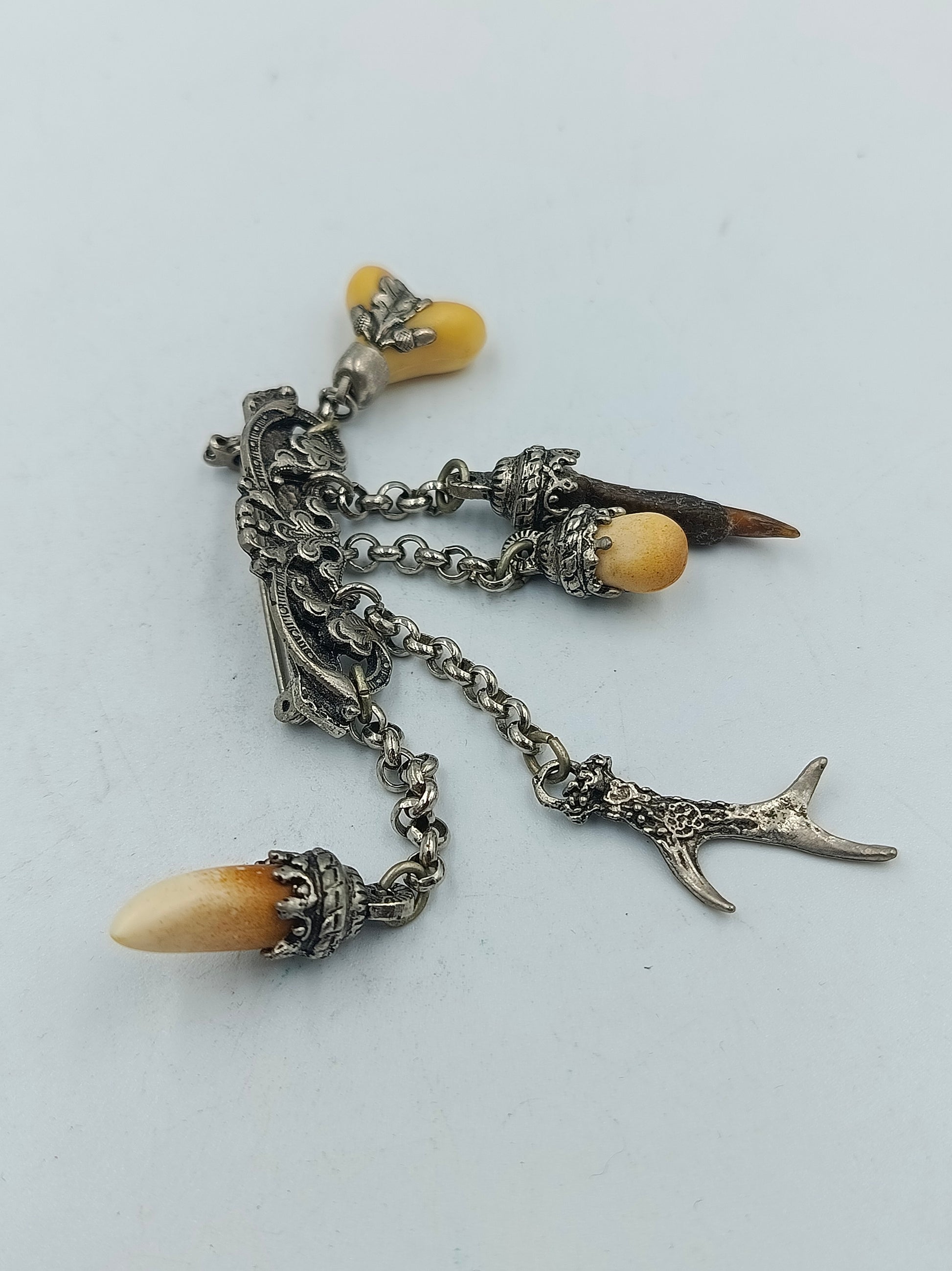 Silberne Trachtenbrosche mit Anhängern Geweih Zahn Horn Vintage