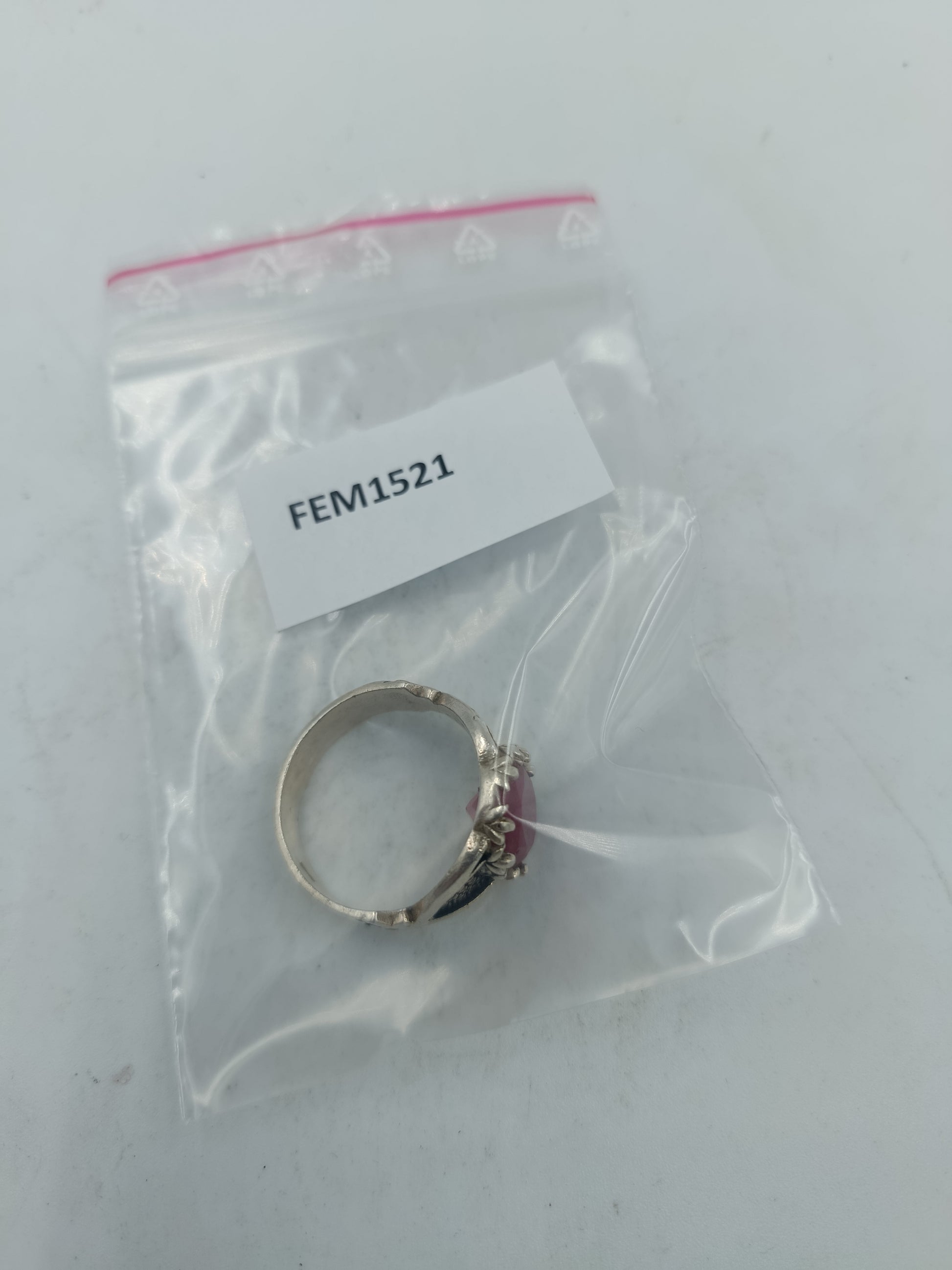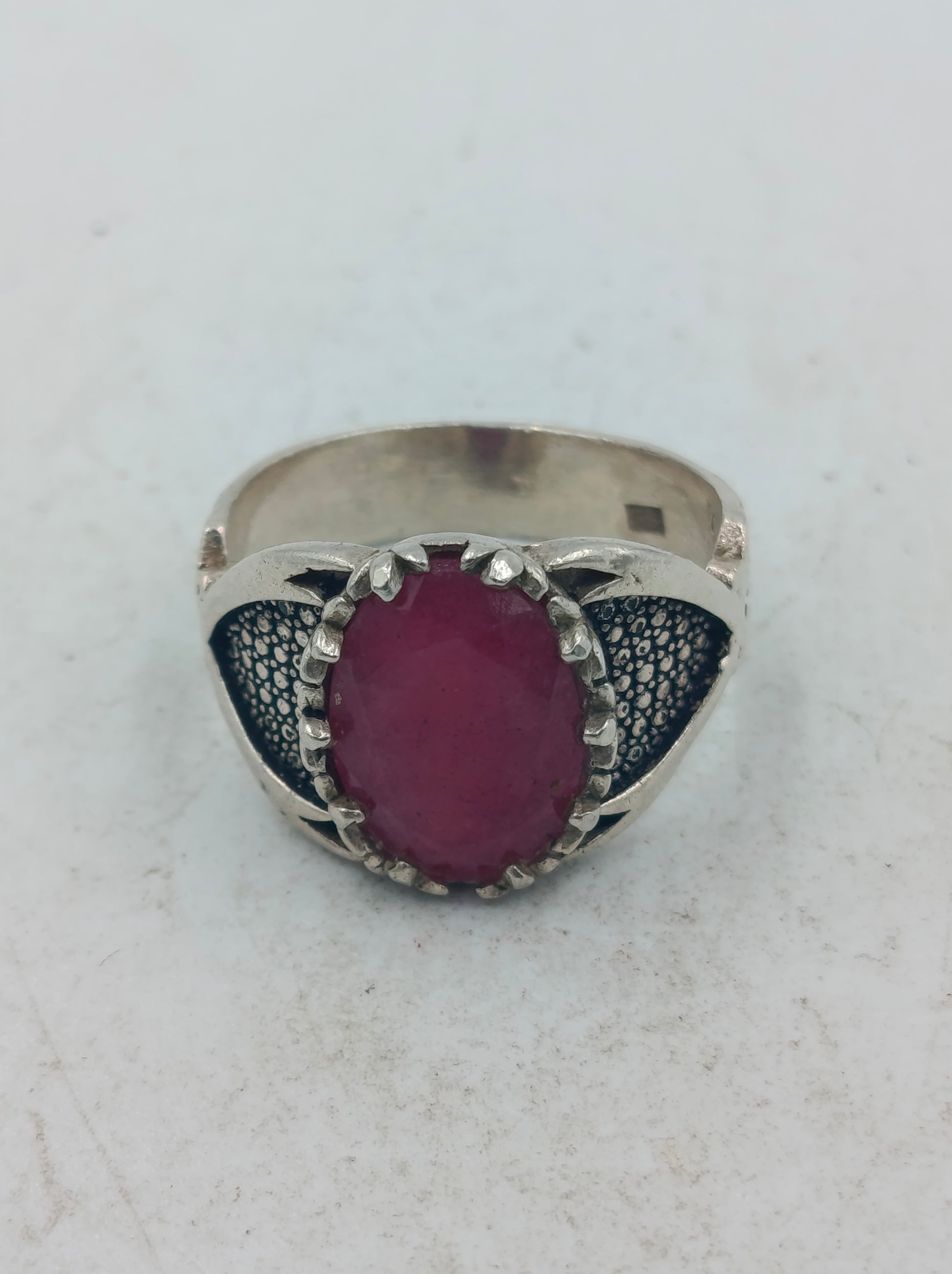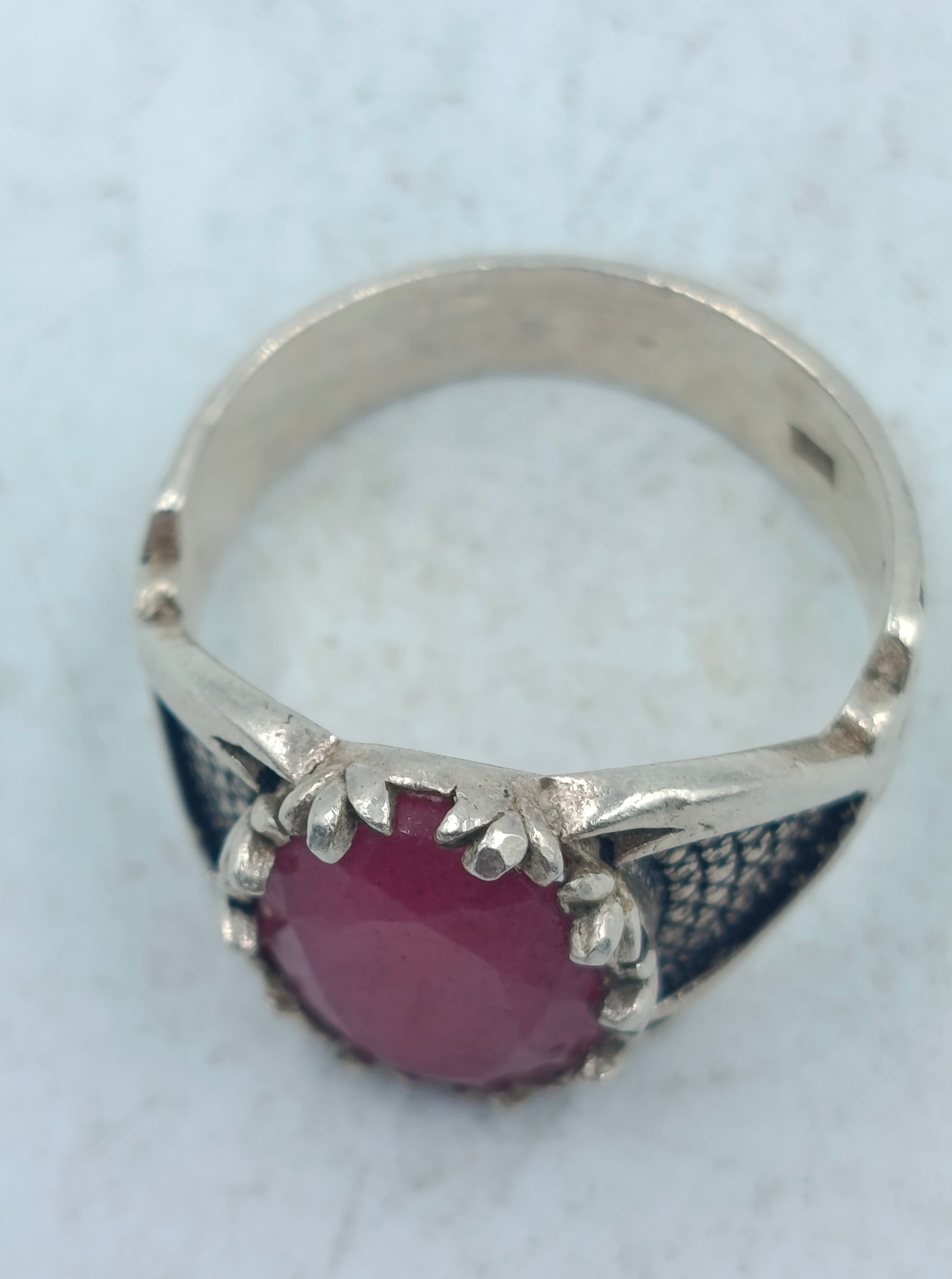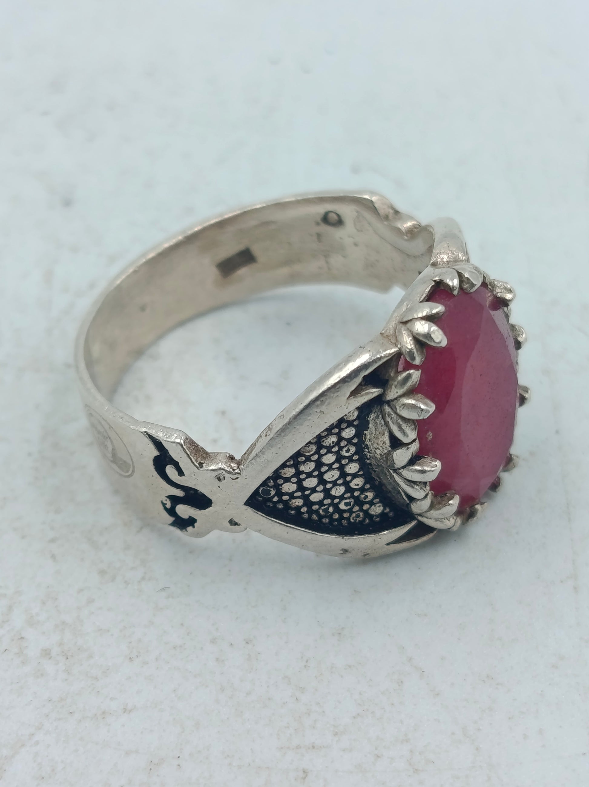 Silberring mit grossem rubinfarbenem Stein und kunstvoll verzierten Seitenflaechen im edlen Stil