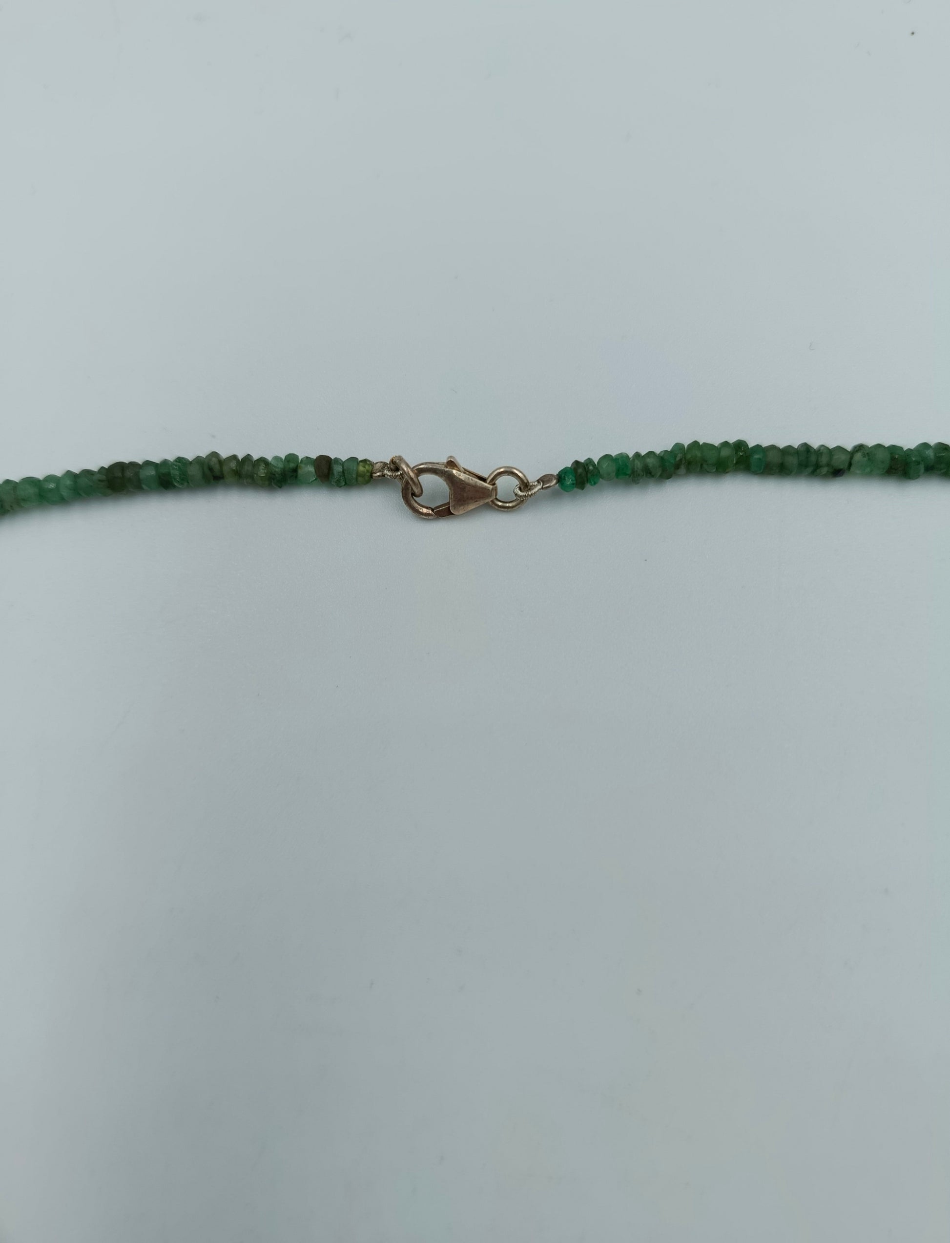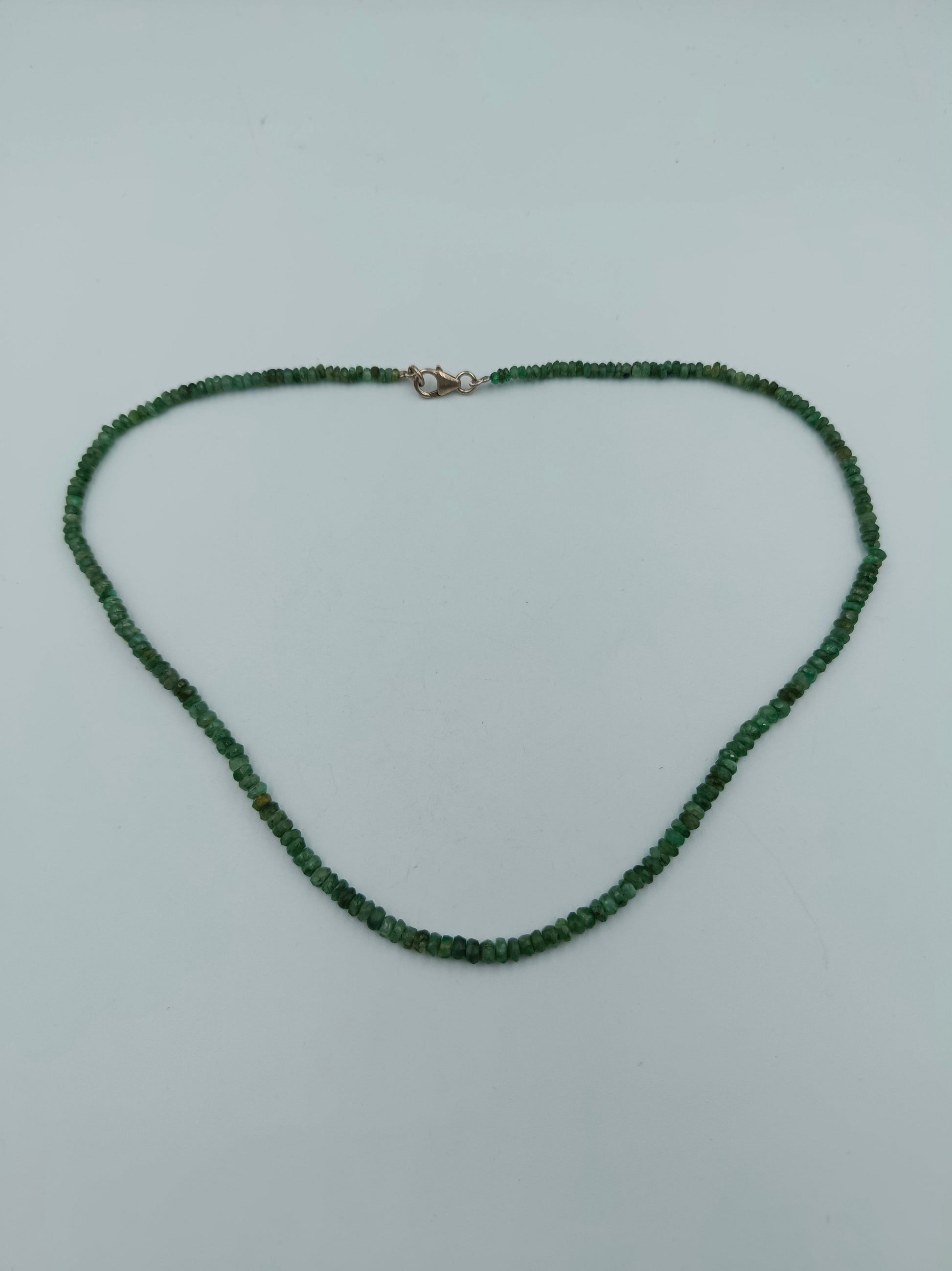 Elegante Kette aus facettierten Smaragd-Perlen in sattem Grün. Die feine Verarbeitung und der dezente Glanz der Edelsteine machen dieses Schmuckstück zu einem zeitlosen Klassiker. Der Karabinerverschluss ist aus 925er Sterling-Silber gefertigt und sorgt für sicheren Halt.