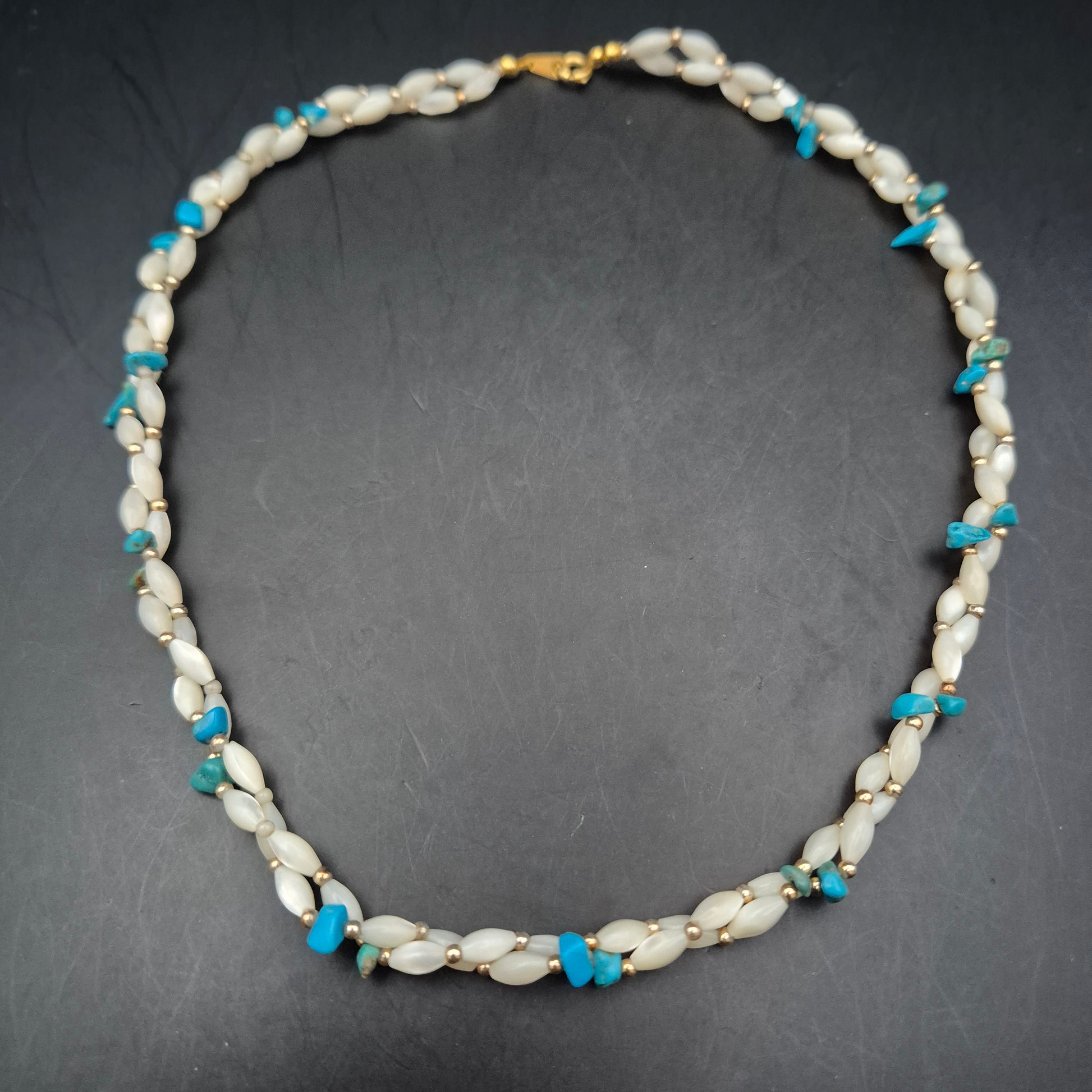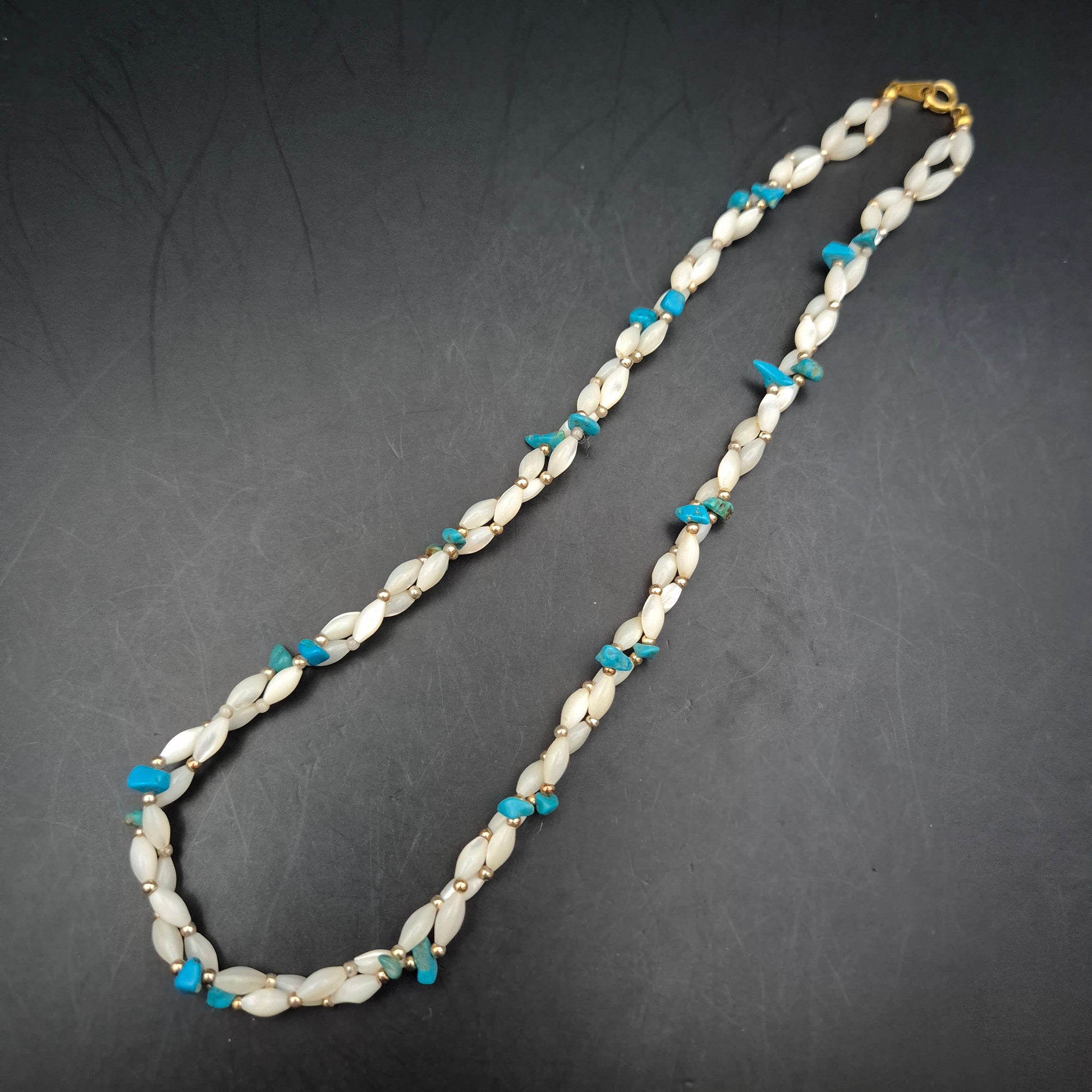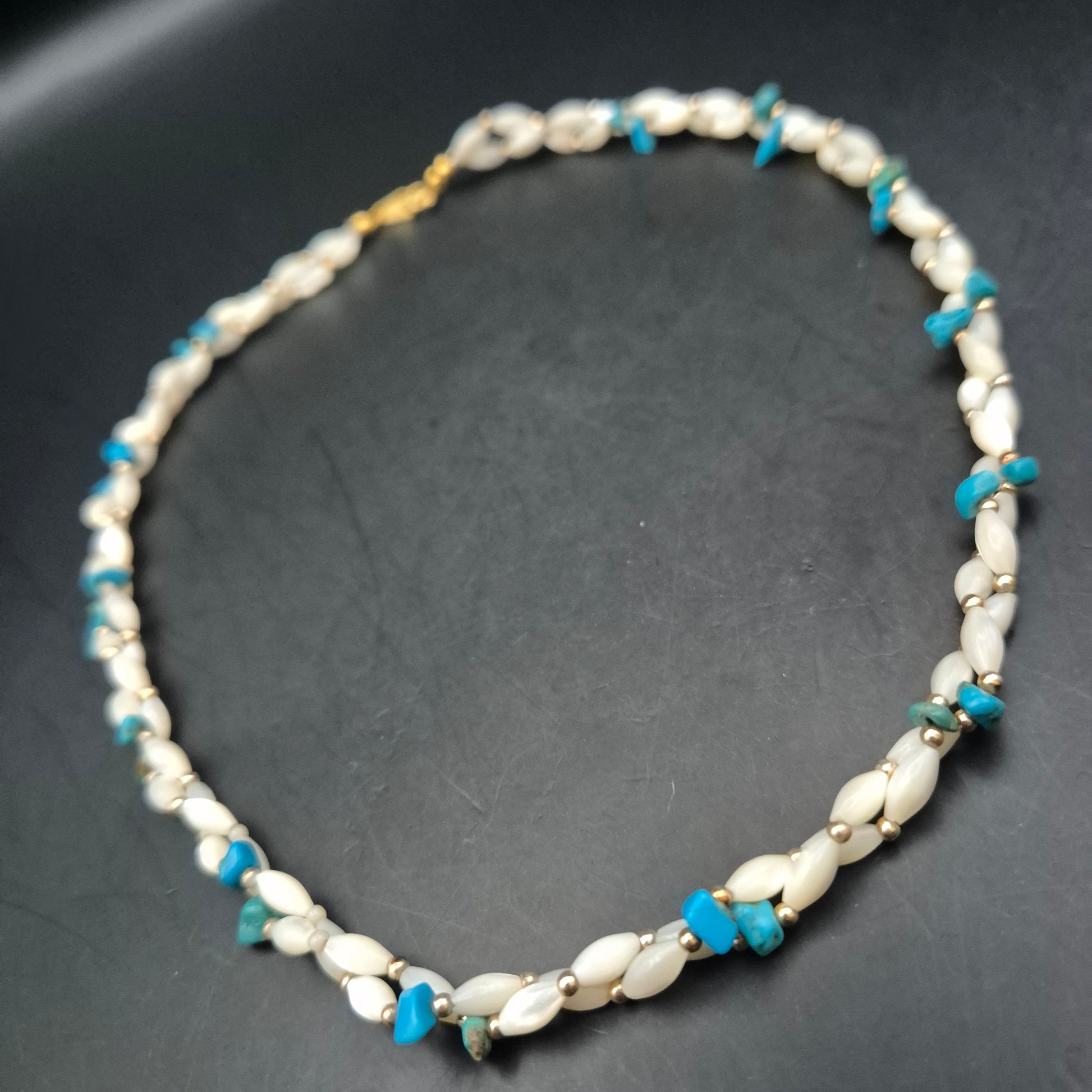 Material: Perlen/Muschel, Türkis-Splitter, vergoldetes Metall