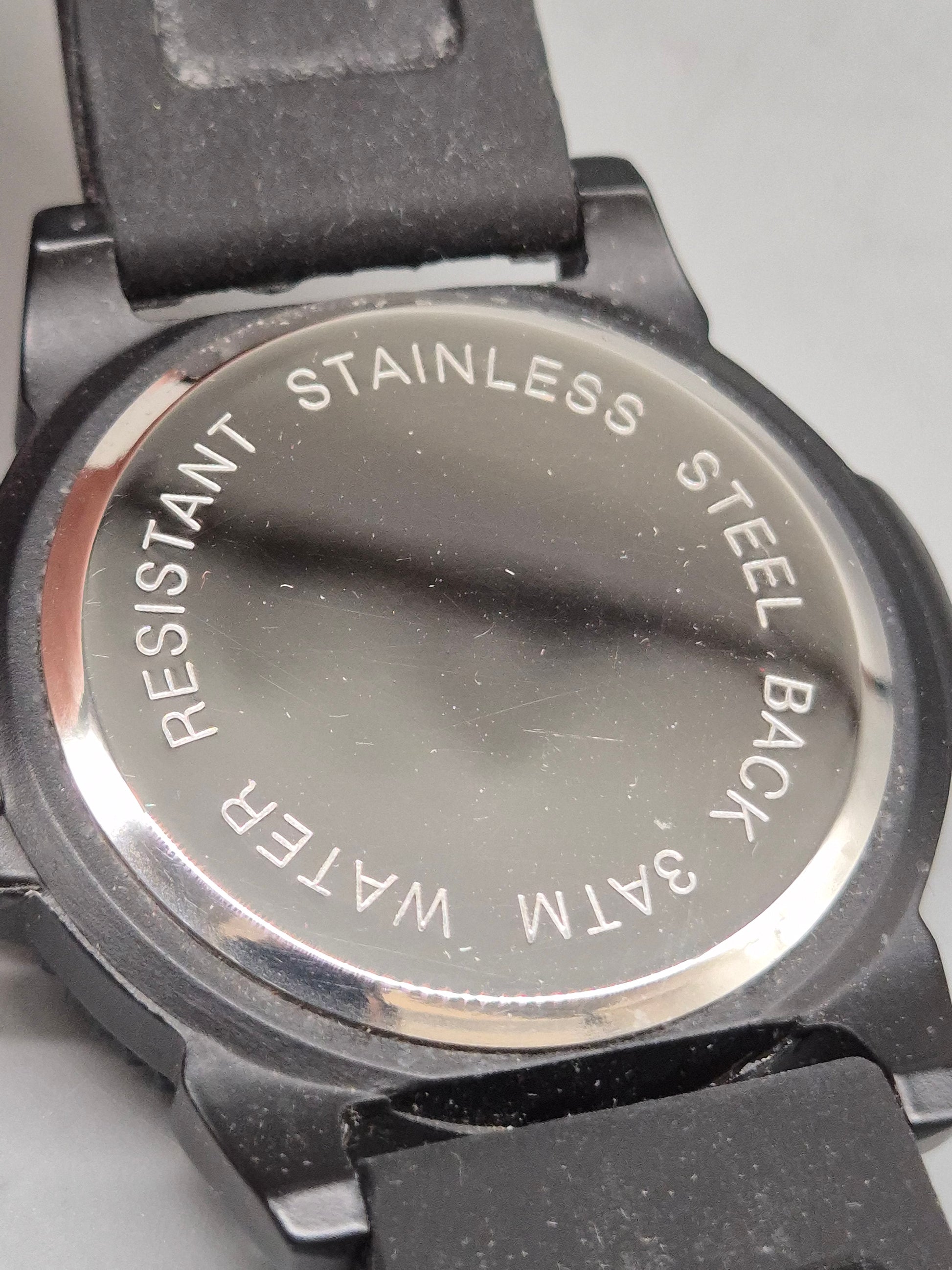 Material: Kunststoffgehäuse, Edelstahlboden, Gummiarmband