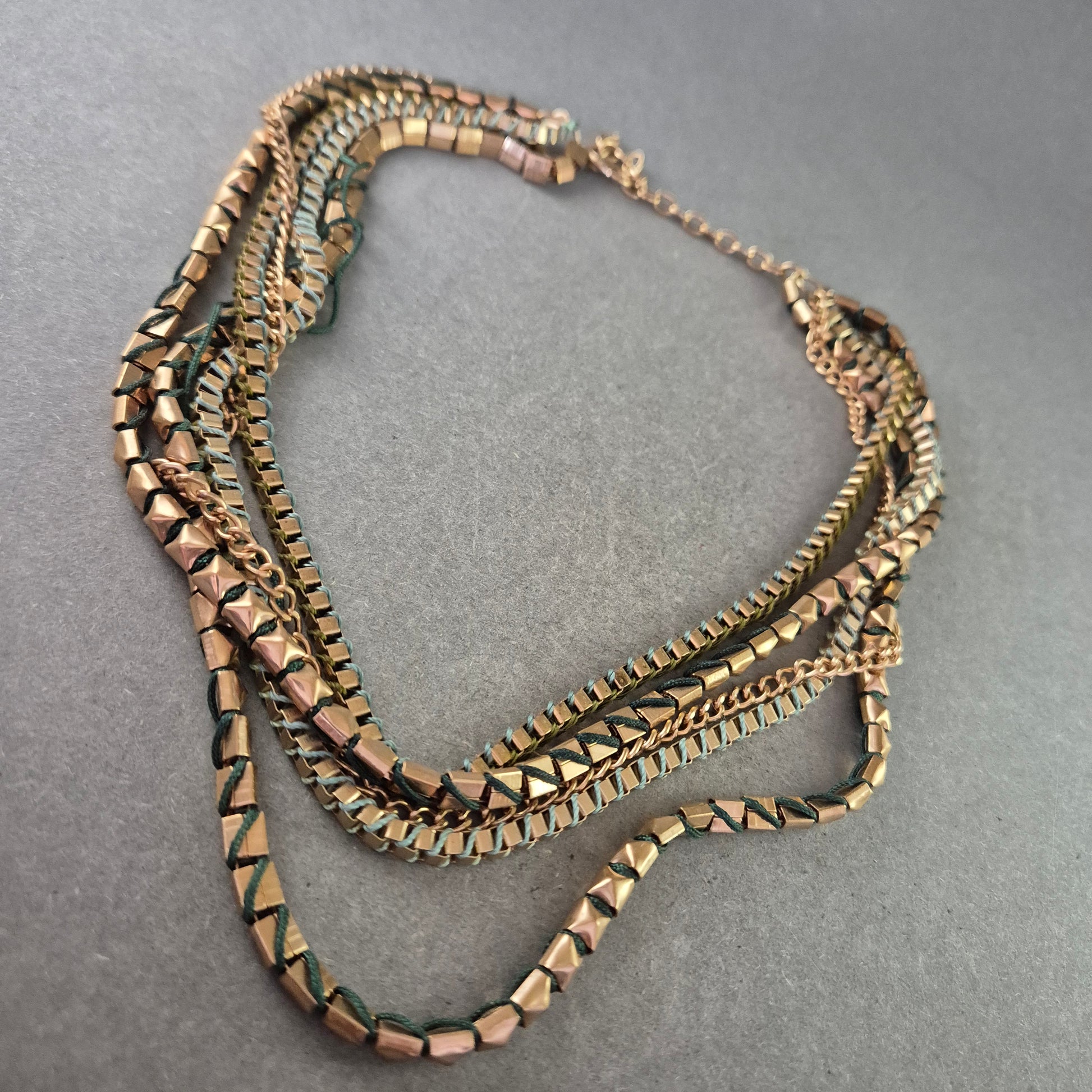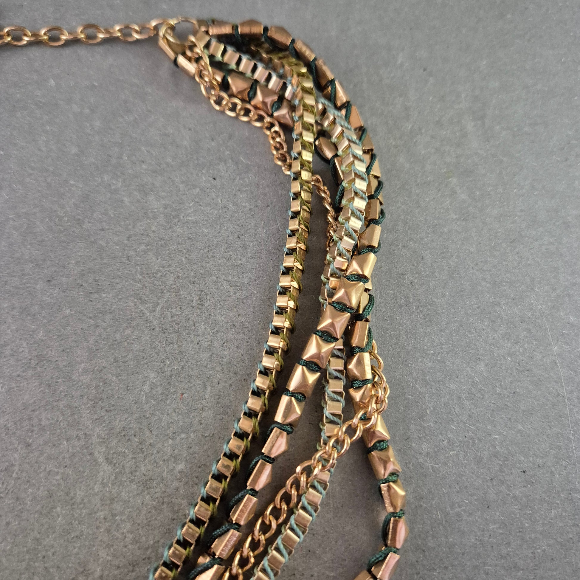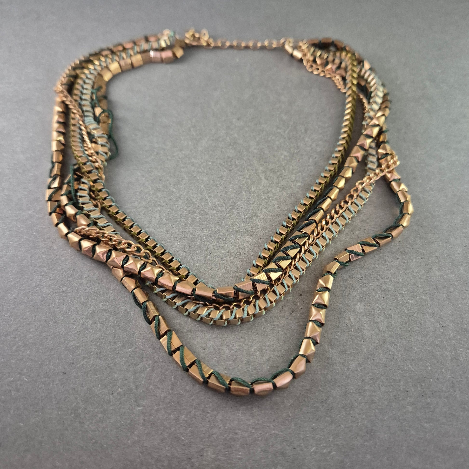 Diese auffällige Statement Halskette überzeugt mit einem markanten, mehrreihigen Design aus goldfarbenen Metallgliedern, die durch grüne textile Fäden dezent durchzogen sind. Die Kombination aus geometrischen Gliedern und weichen Elementen macht diese Halskette zum idealen Accessoire für modische Outfits mit Charakter.