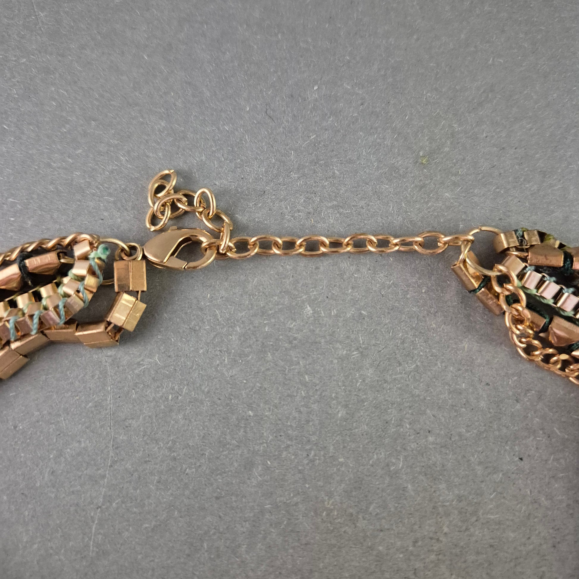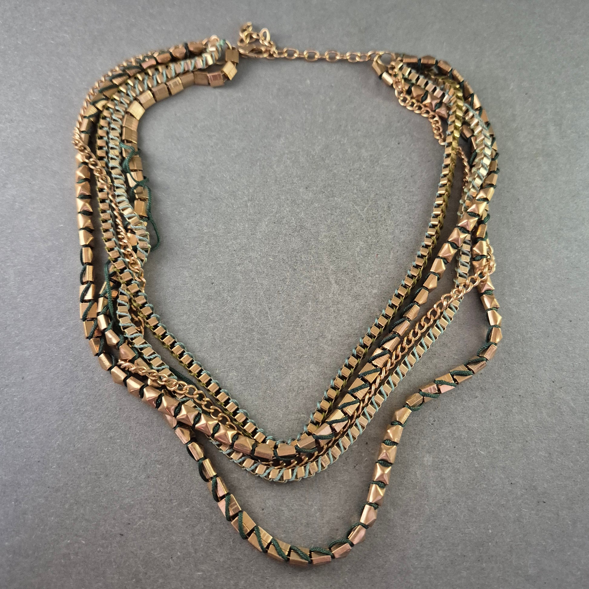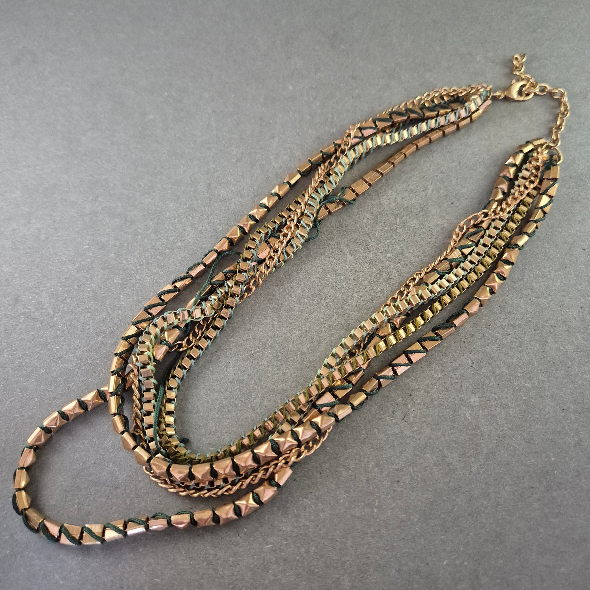 Diese auffällige Statement Halskette überzeugt mit einem markanten, mehrreihigen Design aus goldfarbenen Metallgliedern, die durch grüne textile Fäden dezent durchzogen sind. Die Kombination aus geometrischen Gliedern und weichen Elementen macht diese Halskette zum idealen Accessoire für modische Outfits mit Charakter.