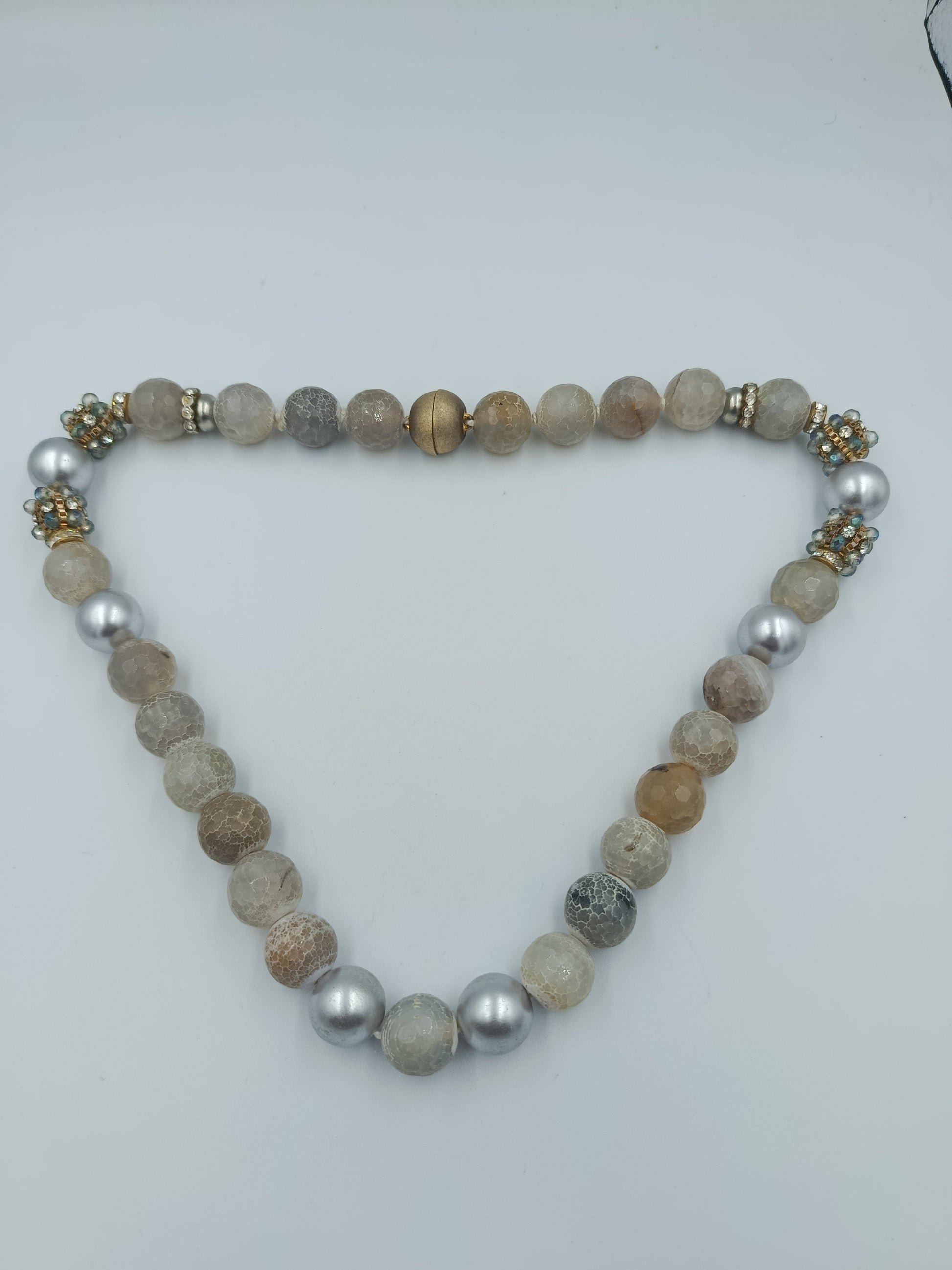 Eine auffällige und elegante Halskette, die sofort ins Auge fällt: Große, facettierte Achatperlen in sanften Naturtönen werden mit schimmernden silberfarbenen Perlen kombiniert. Strass-besetzte Zwischenelemente verleihen der Kette glamouröse Akzente und machen sie zu einem echten Hingucker – perfekt für besondere Anlässe oder als luxuriöses Statement im Alltag.