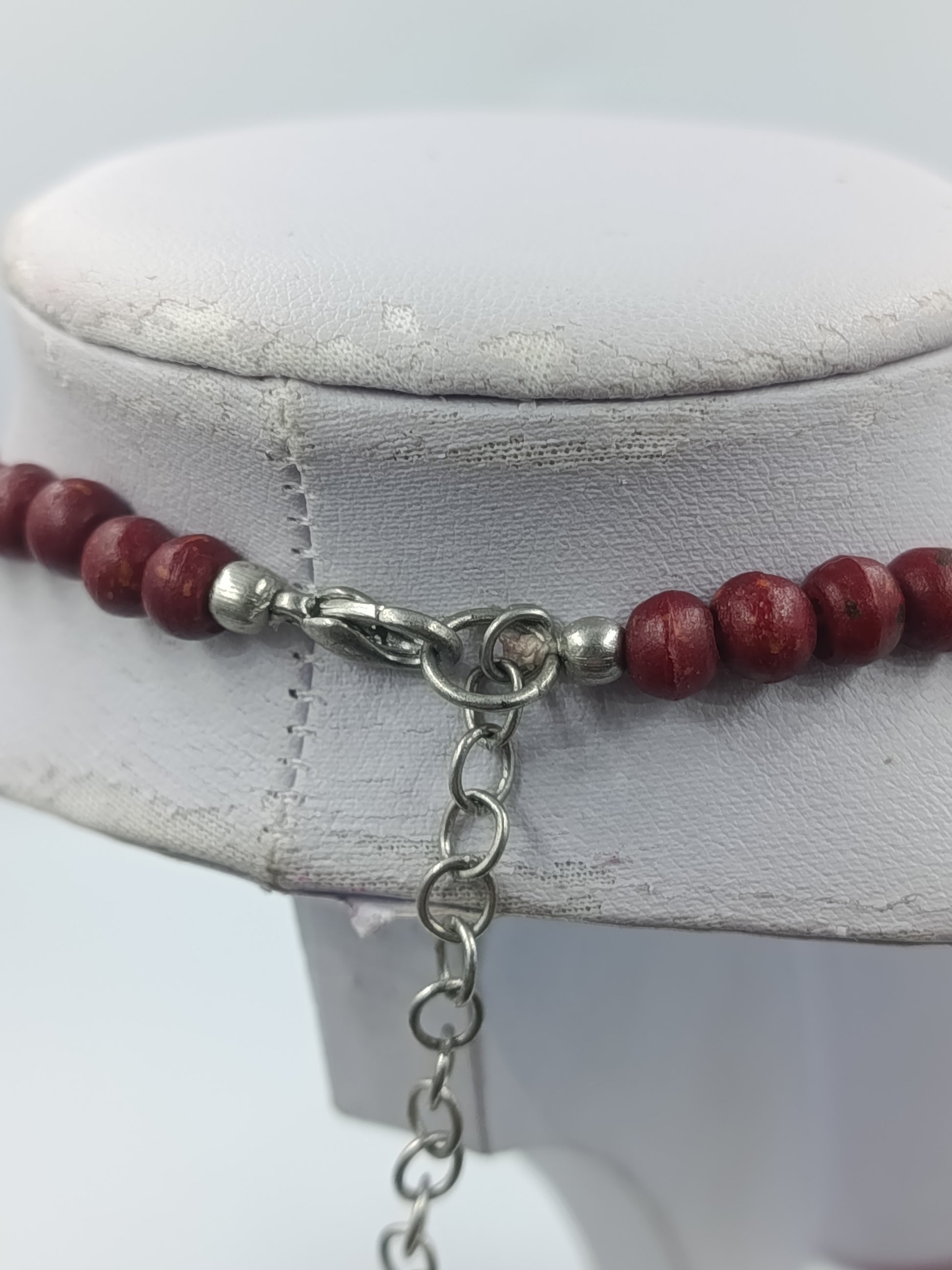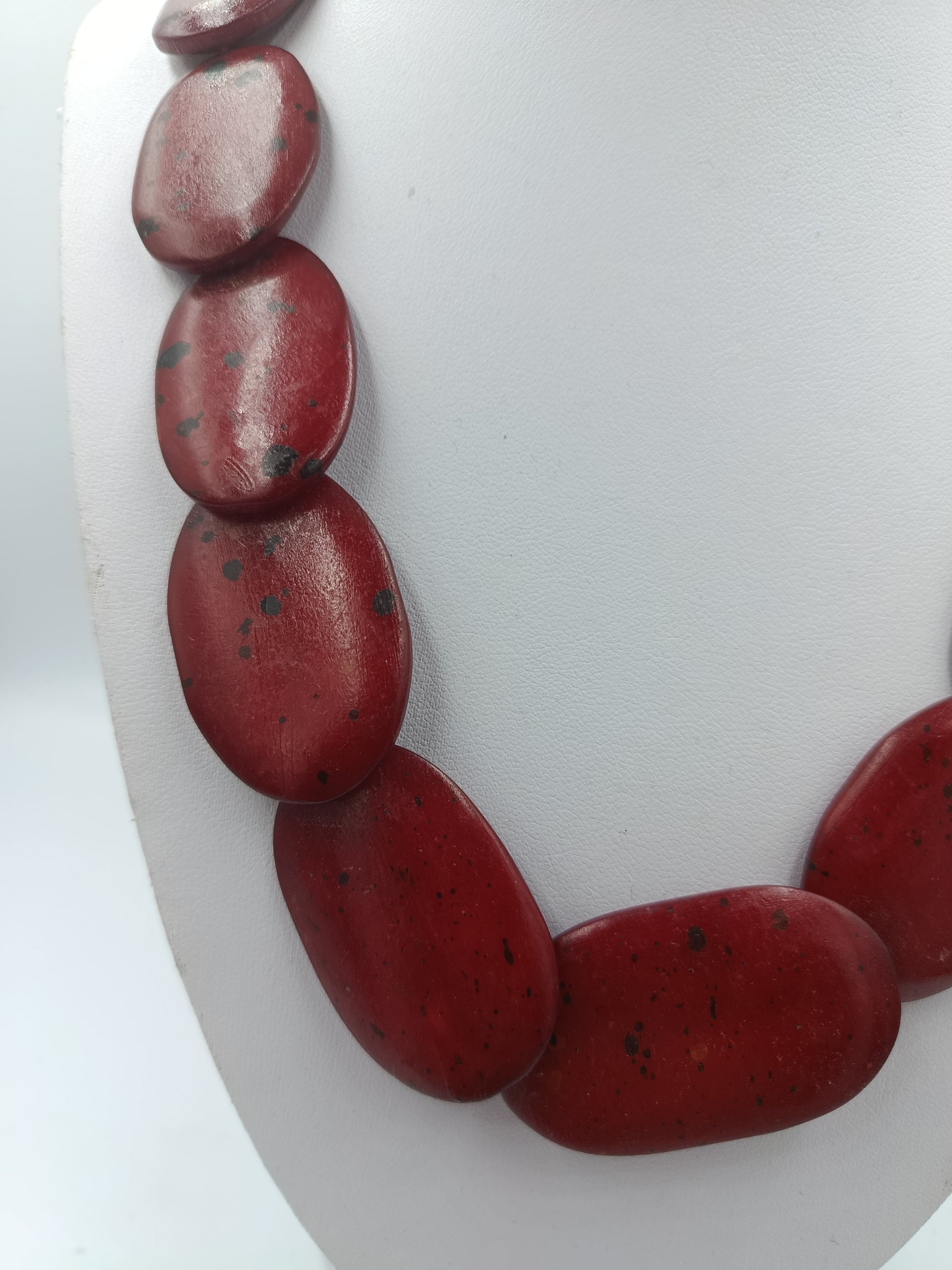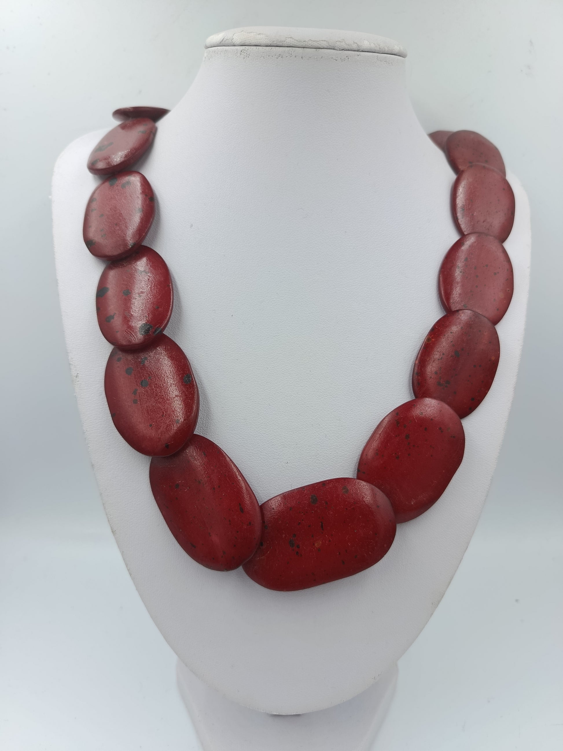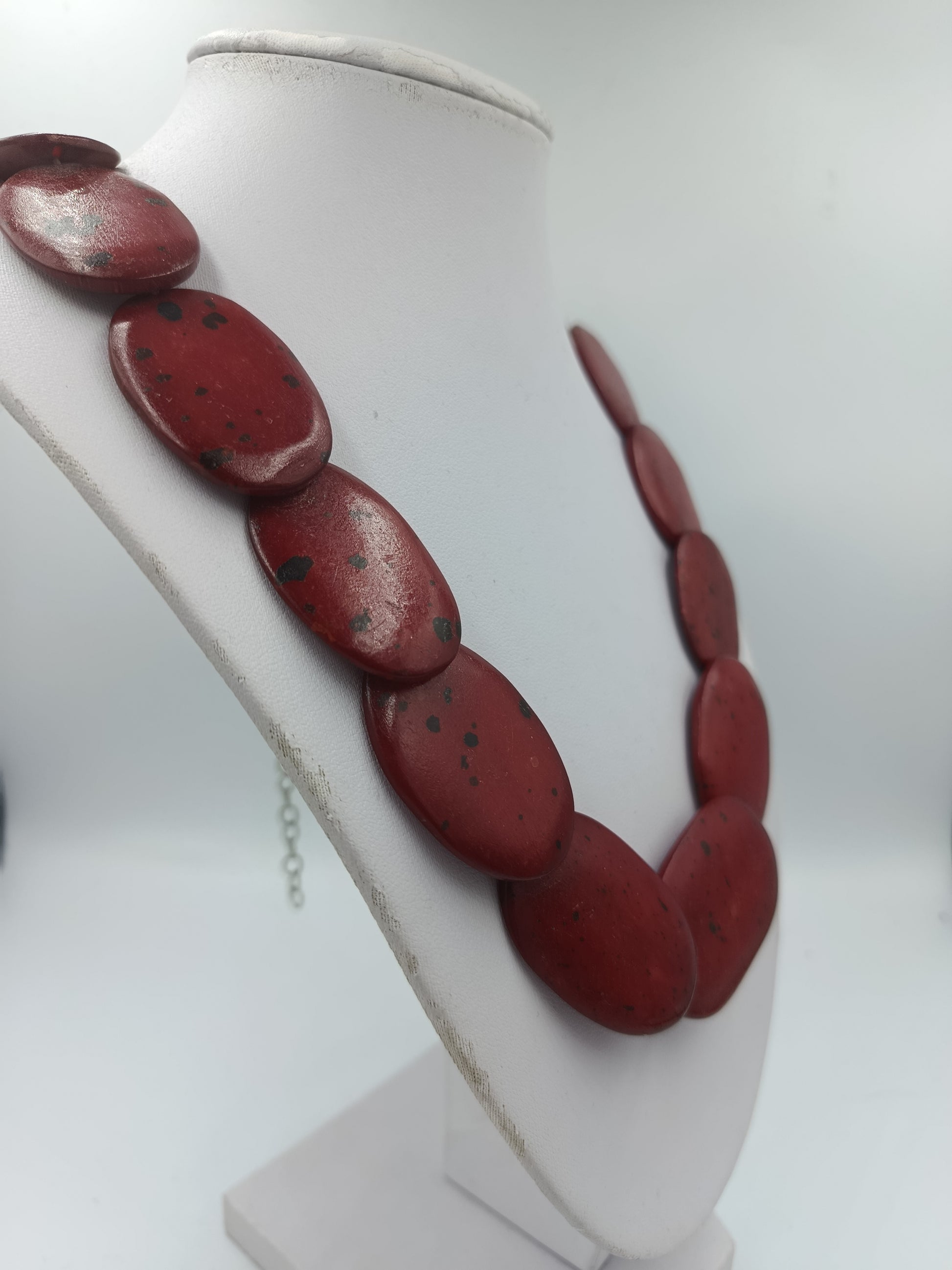 Ausdrucksstarke Halskette mit großen, ovalen Naturstein-Perlen in tiefem Rotton. Die leicht gesprenkelte Oberfläche verleiht jedem Stein einen individuellen Charakter. Durch das markante Design ist diese Kette ein echter Blickfang und ideal als Statement-Schmuck zu schlichten Outfits oder besonderen Anlässen.