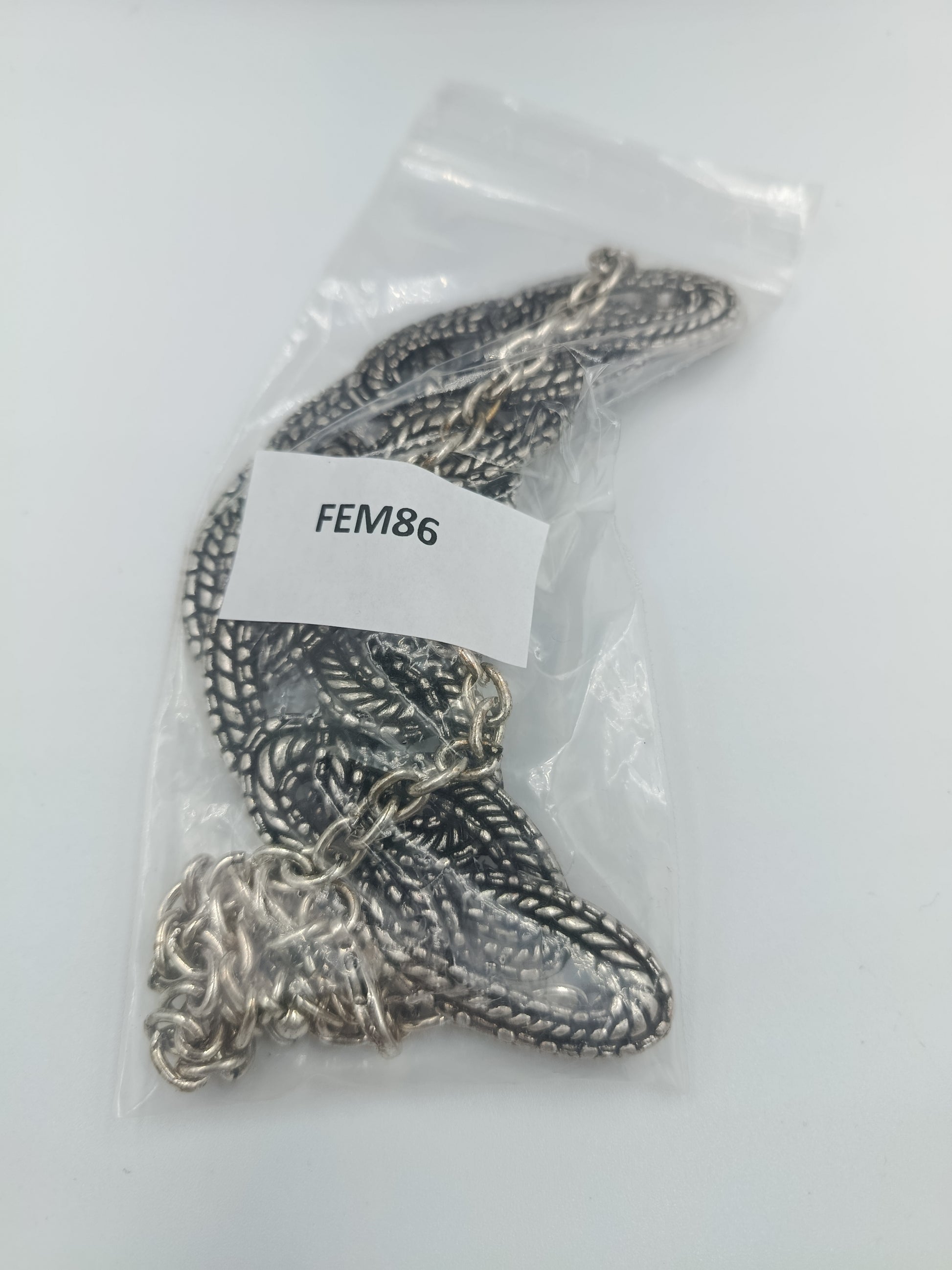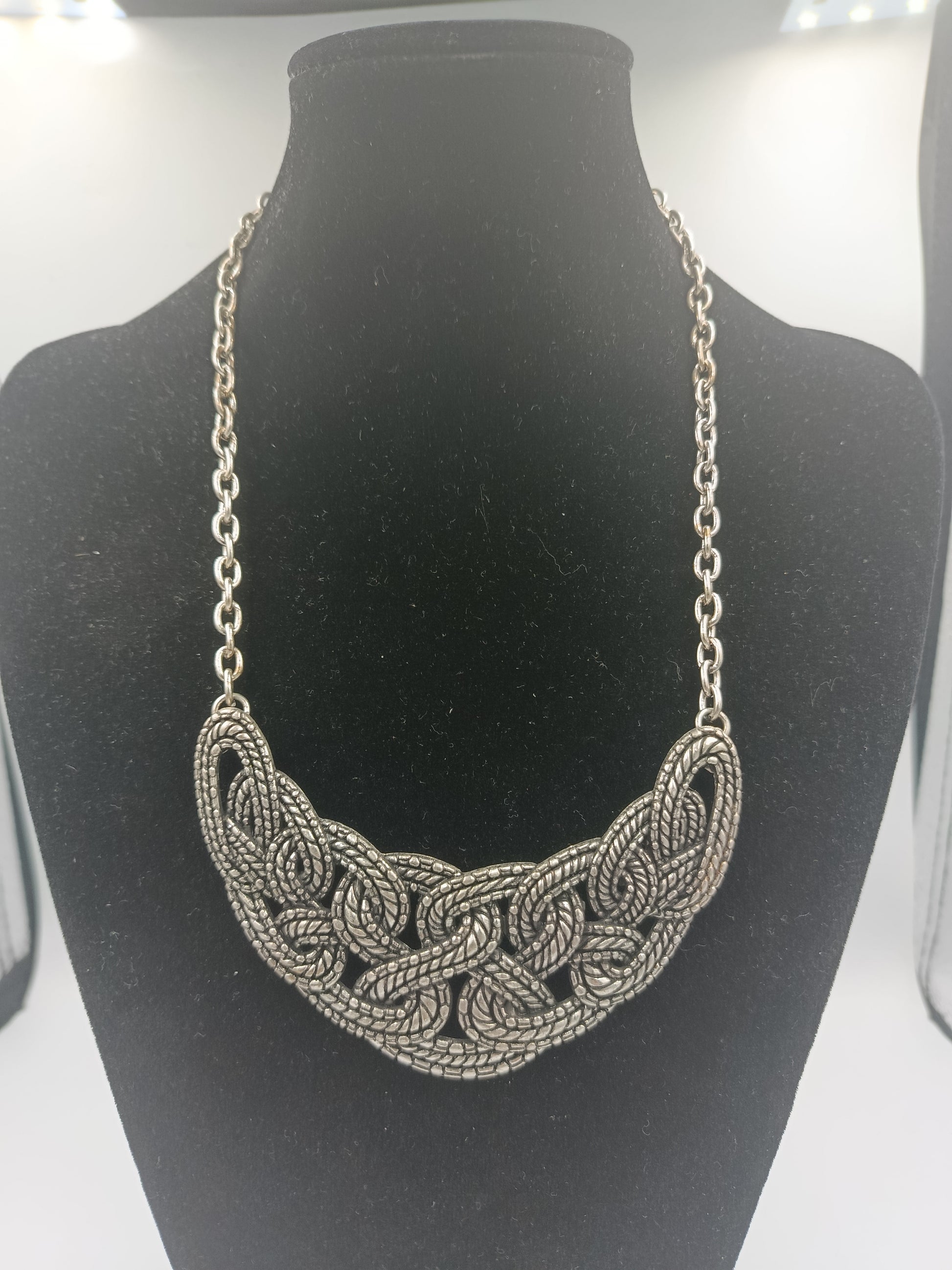 Diese ausdrucksstarke Statement-Kette überzeugt durch ihr detailreich gearbeitetes Flecht-Element, das wie eine kunstvolle Borte wirkt. Das antik-silberne Finish verleiht der Kette einen edlen, leicht Vintage-inspirierten Charakter. Ideal, um schlichte Outfits aufzuwerten oder einen extravaganten Akzent zu setzen.