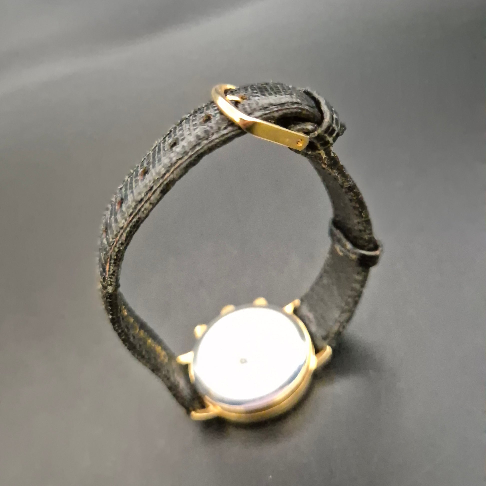 • Material: Vergoldetes Metallgehäuse, Edelstahlboden, Lederarmband (schwarz, Strukturprägung)