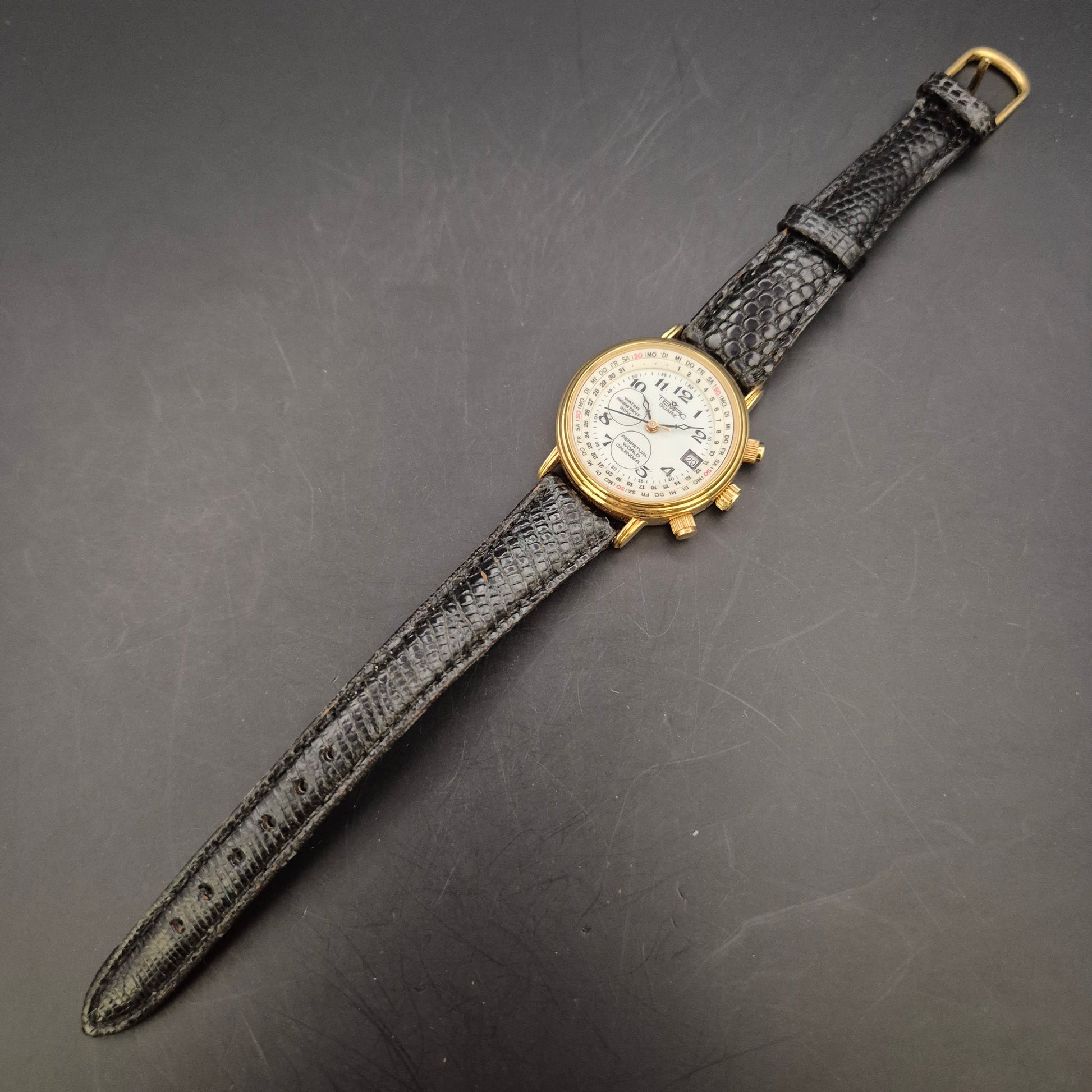 Diese TemPic Herren Armbanduhr kombiniert Funktionalität mit klassischem Design. Das goldfarbene Gehäuse hebt sich stilvoll vom weißen Zifferblatt ab, das zahlreiche Funktionen integriert: Chronograph, Datumsanzeige sowie einen Perpetual World Calendar. Drei goldfarbene Drücker an der Seite steuern die Zusatzfunktionen. Das schwarze Lederarmband mit Strukturprägung sorgt für einen markanten Vintage-Look.