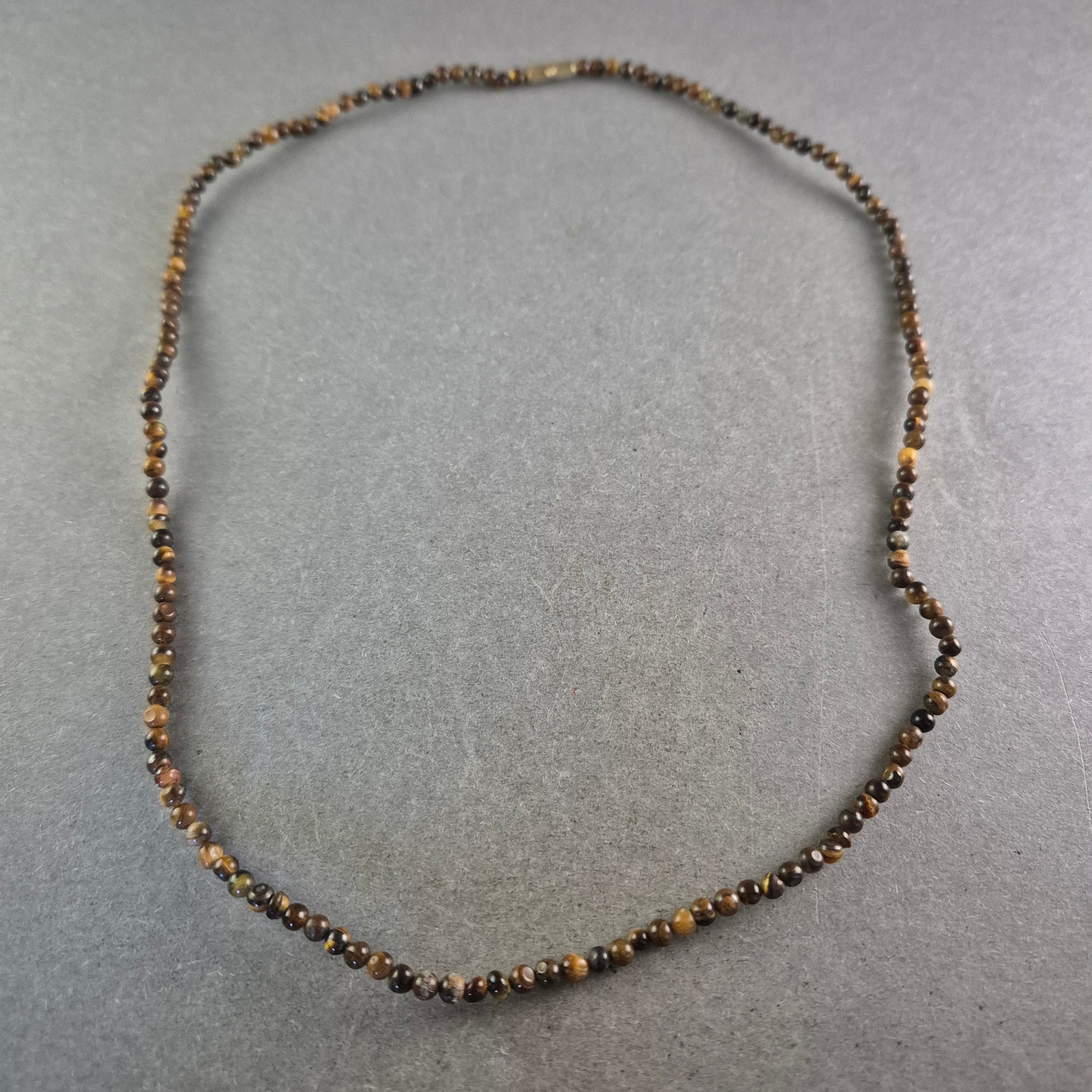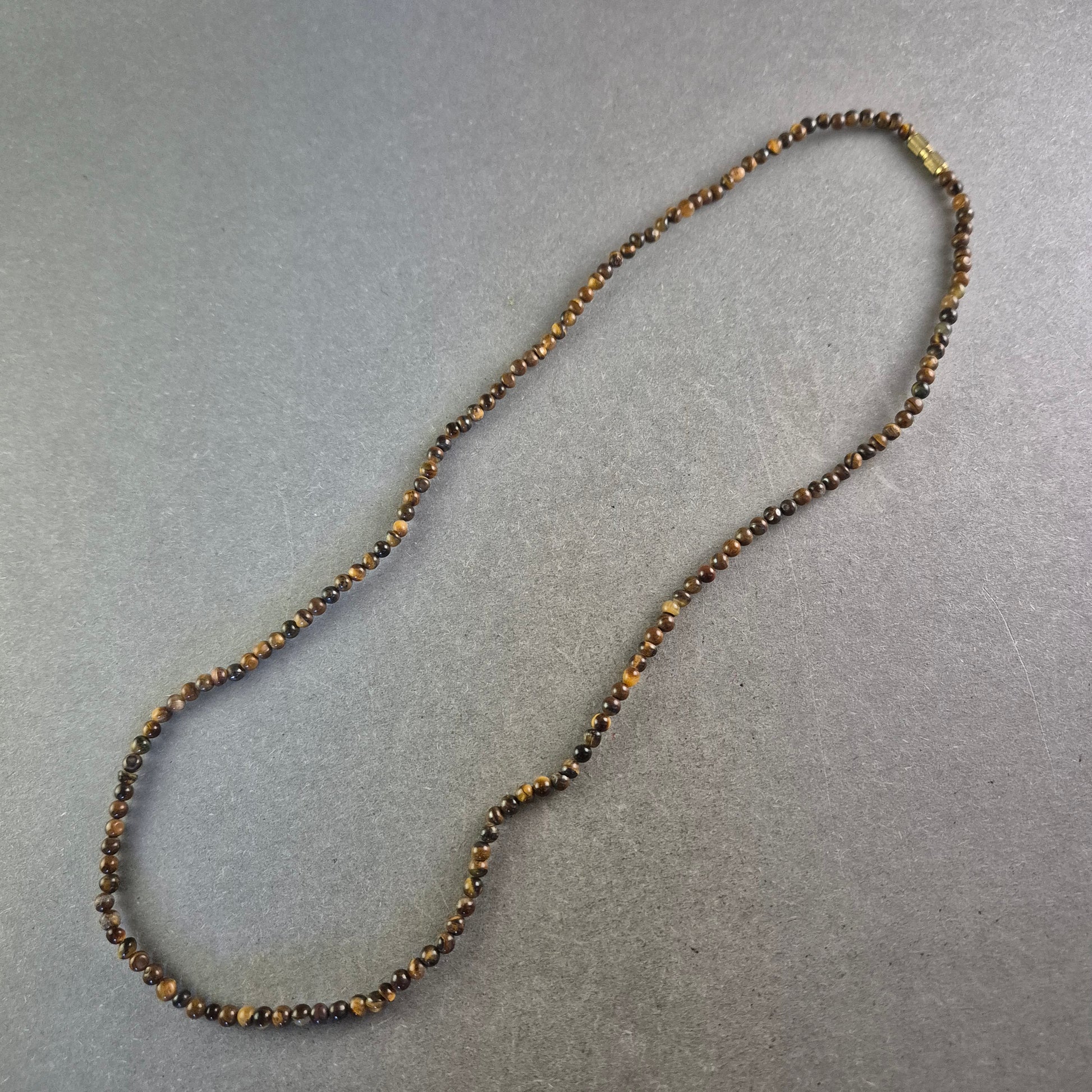 Diese Halskette aus kleinen, polierten Tigerauge-Perlen beeindruckt durch ihren natürlichen Braun-Gold-Schimmer. Die feine Maserung und der warme Farbverlauf verleihen der Kette einen klassischen, erdverbundenen Look. Dank des Schraubverschlusses lässt sie sich bequem öffnen und schließen – ideal für den Alltag oder als dezenter Akzent zu besonderen Anlässen.