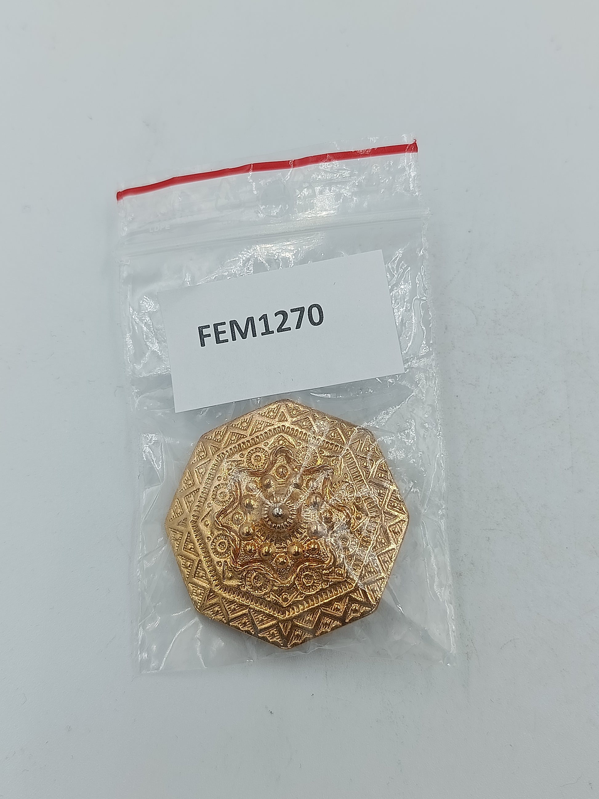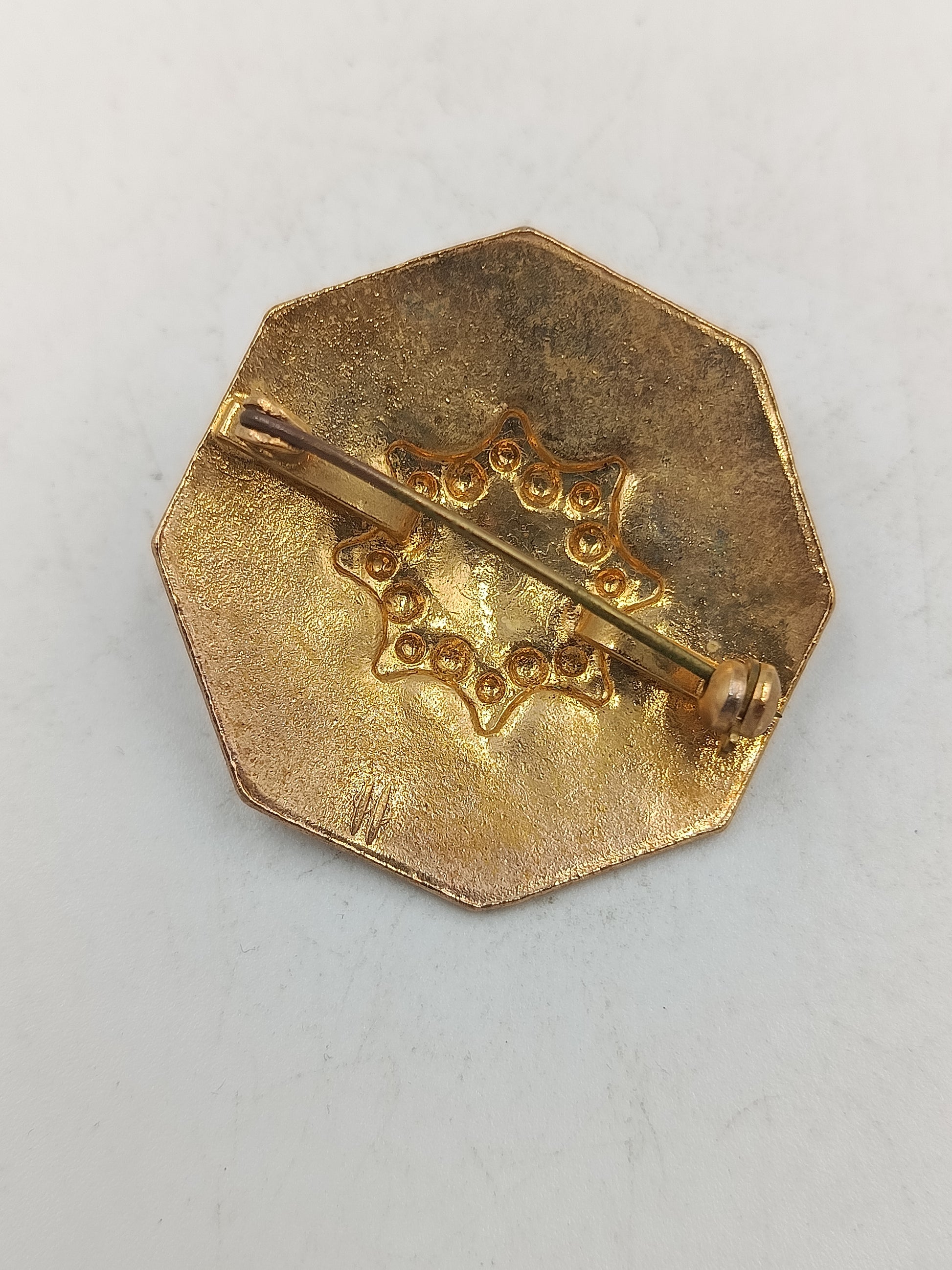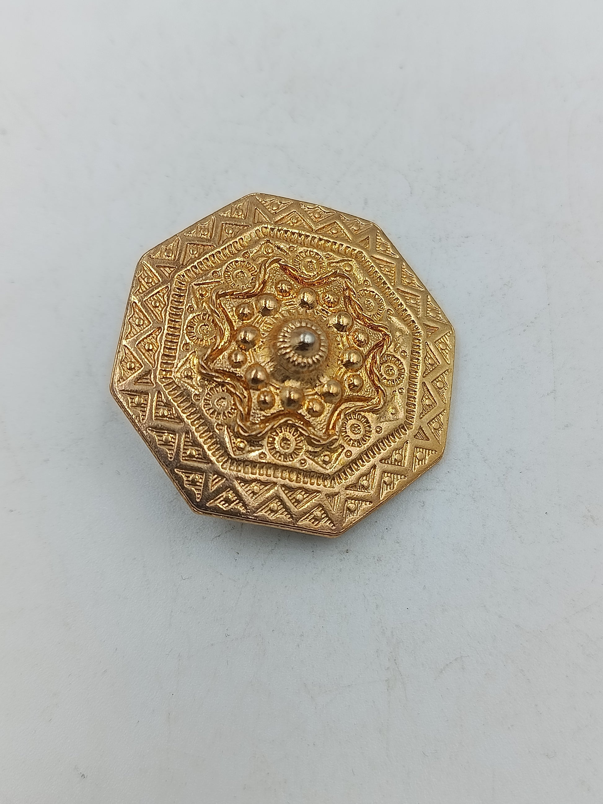 Diese dekorative Schmuckbrosche überzeugt durch ihr reich verziertes Design mit geometrischen Ornamenten und erhabenen Details. Die vergoldete Oberfläche verleiht dem Stück eine elegante Ausstrahlung und macht es zu einem stilvollen Accessoire für Jacken Mäntel oder Tücher. Ideal für Liebhaber klassischer Schmuckstücke mit besonderem Charakter und zeitloser Wirkung.