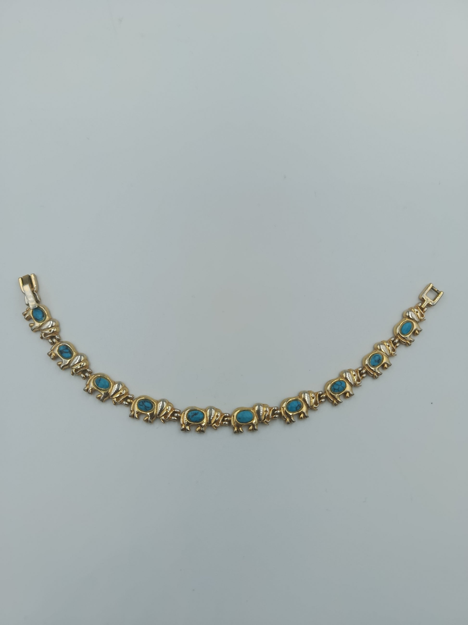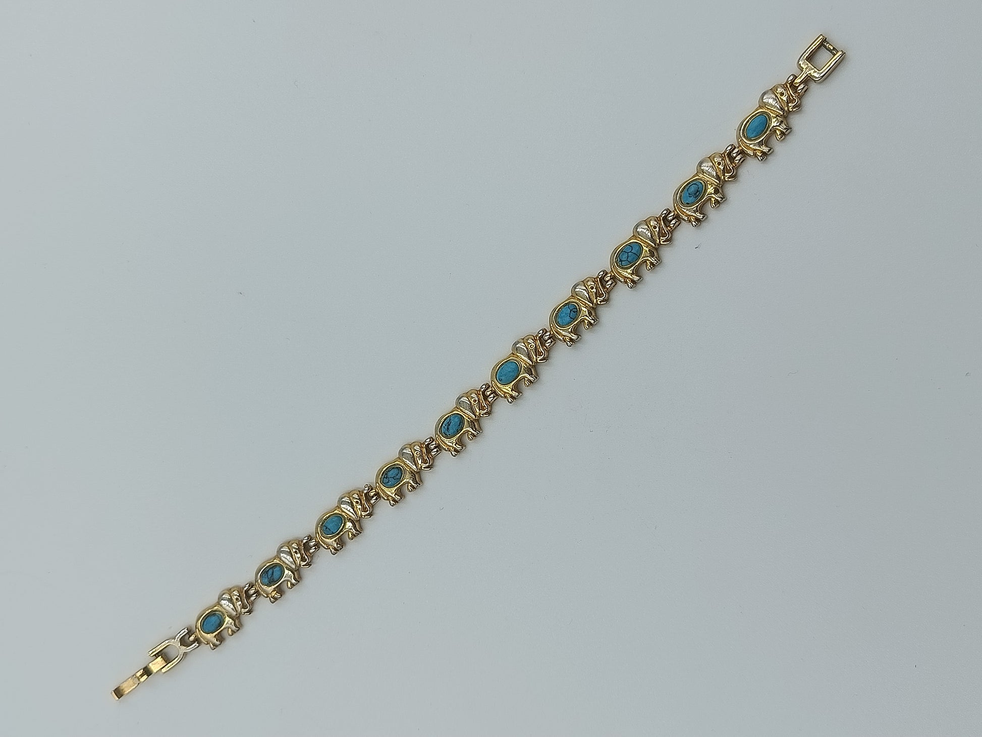 Charmantes Gliederarmband mit kleinen, goldfarbenen Elefanten, die jeweils mit einem ovalen Türkiscabochon besetzt sind. Das verspielte Design macht dieses Armband zu einem echten Hingucker und einem Glücksbringer zugleich – Elefanten stehen traditionell für Weisheit, Stärke und Schutz.