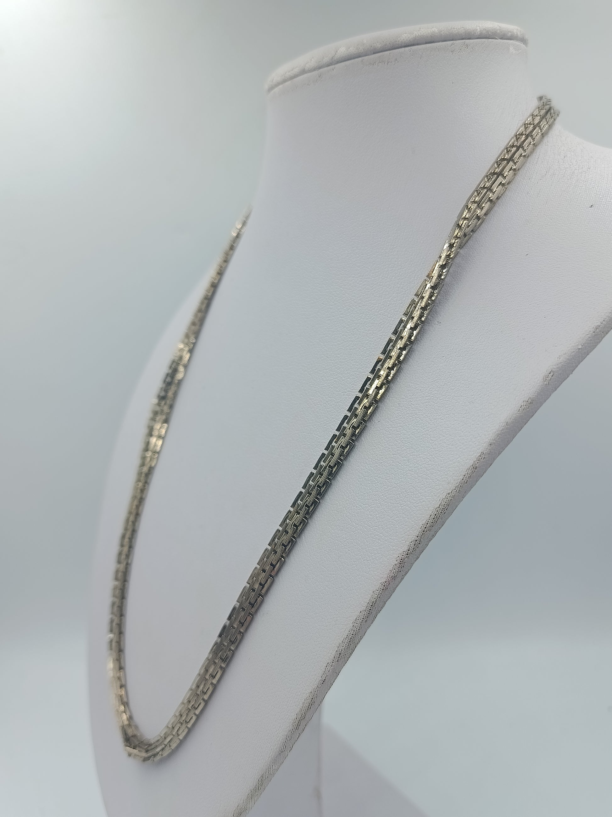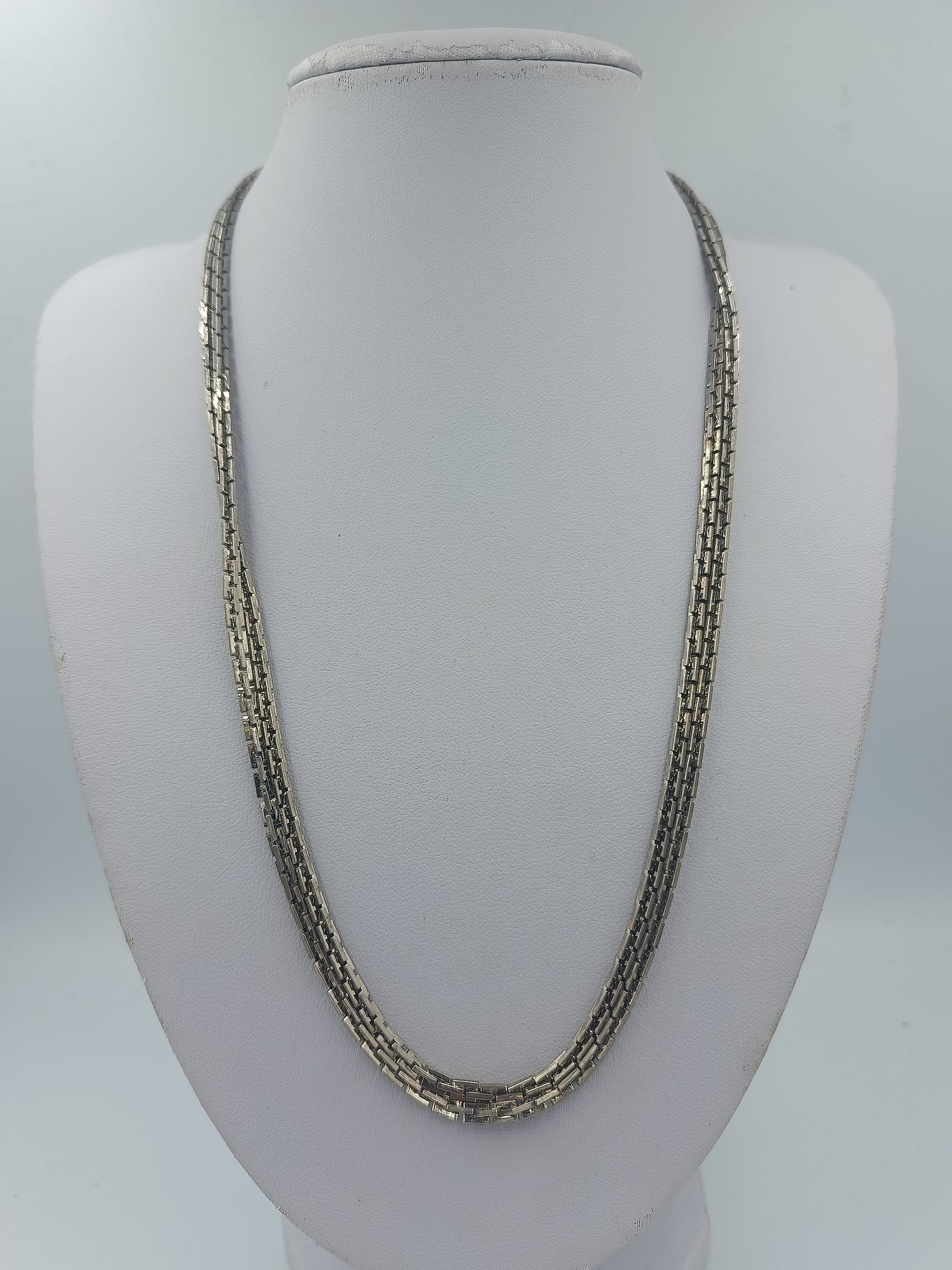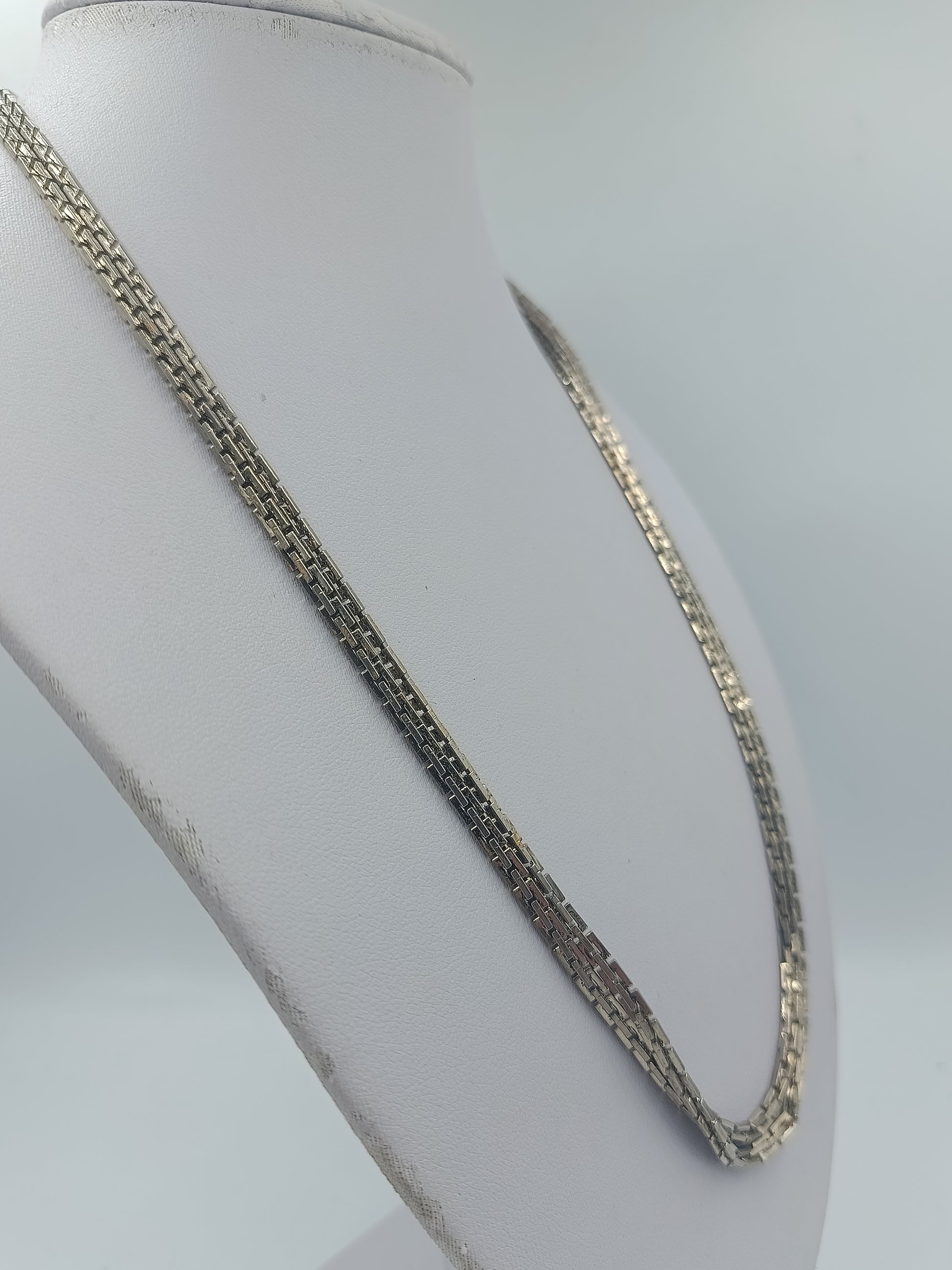 Diese stilvolle versilberte Kette überzeugt durch ihr gleichmäßiges Gliederdesign und eine elegante, zeitlose Optik. Die fein gearbeiteten Glieder verleihen der Kette einen edlen Charakter und machen sie zu einem vielseitig kombinierbaren Schmuckstück. Ideal für den Alltag oder als dezenter Akzent zu besonderen Anlässen.