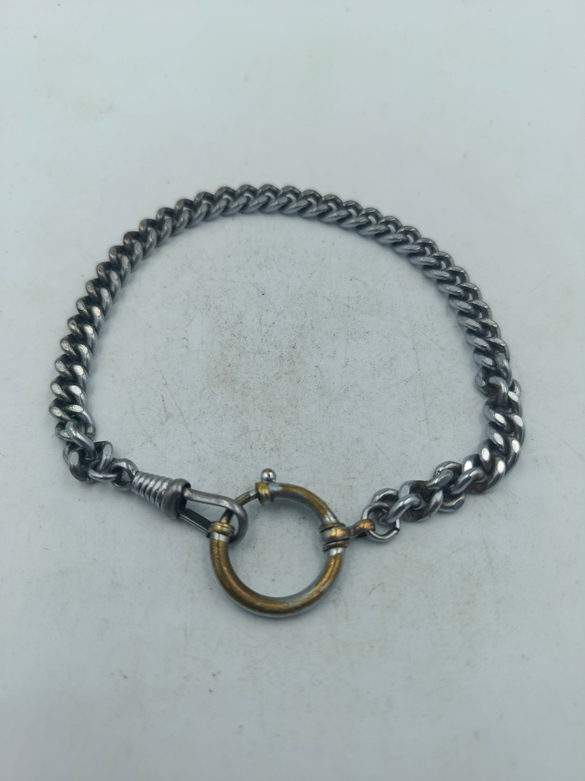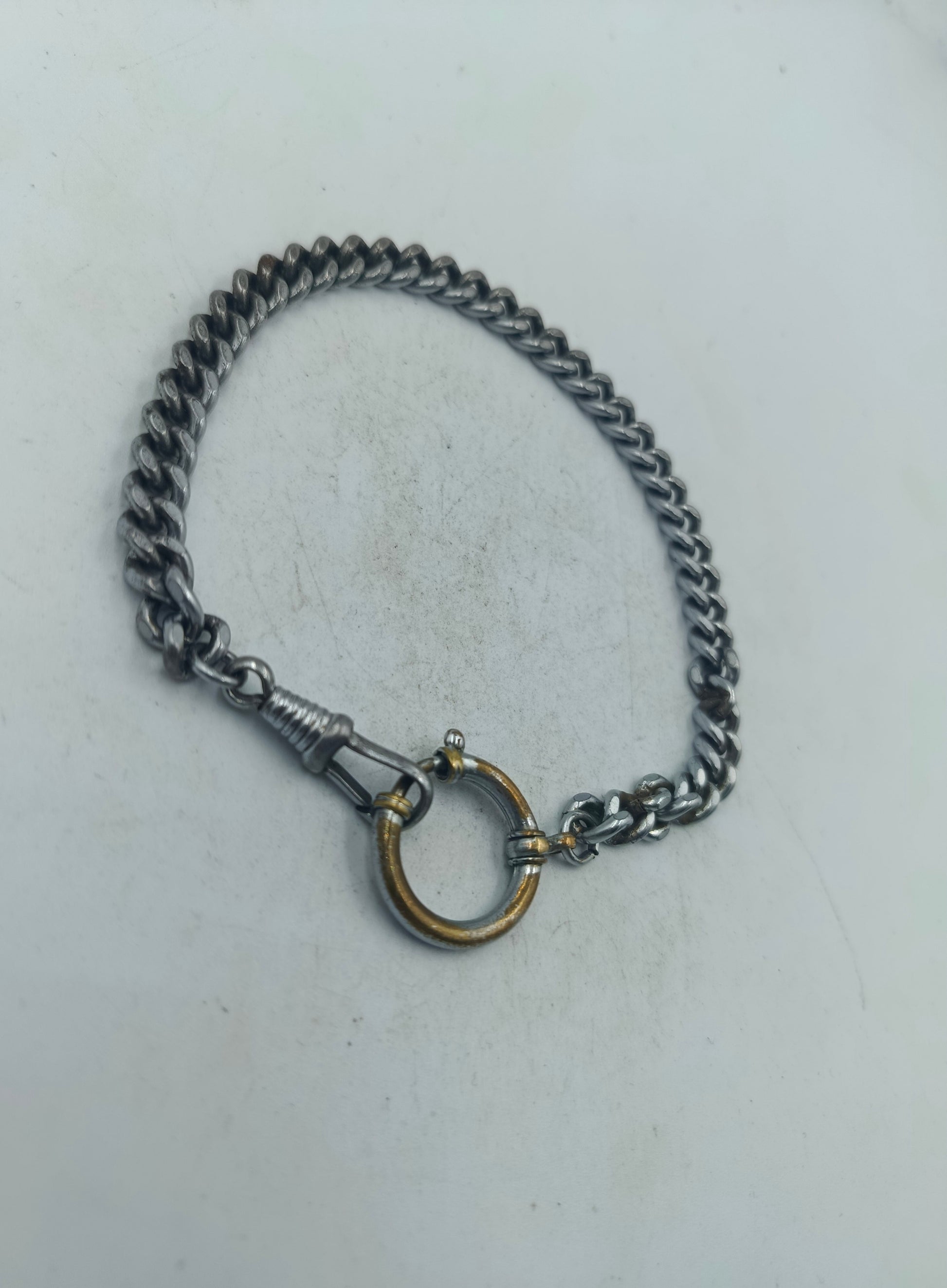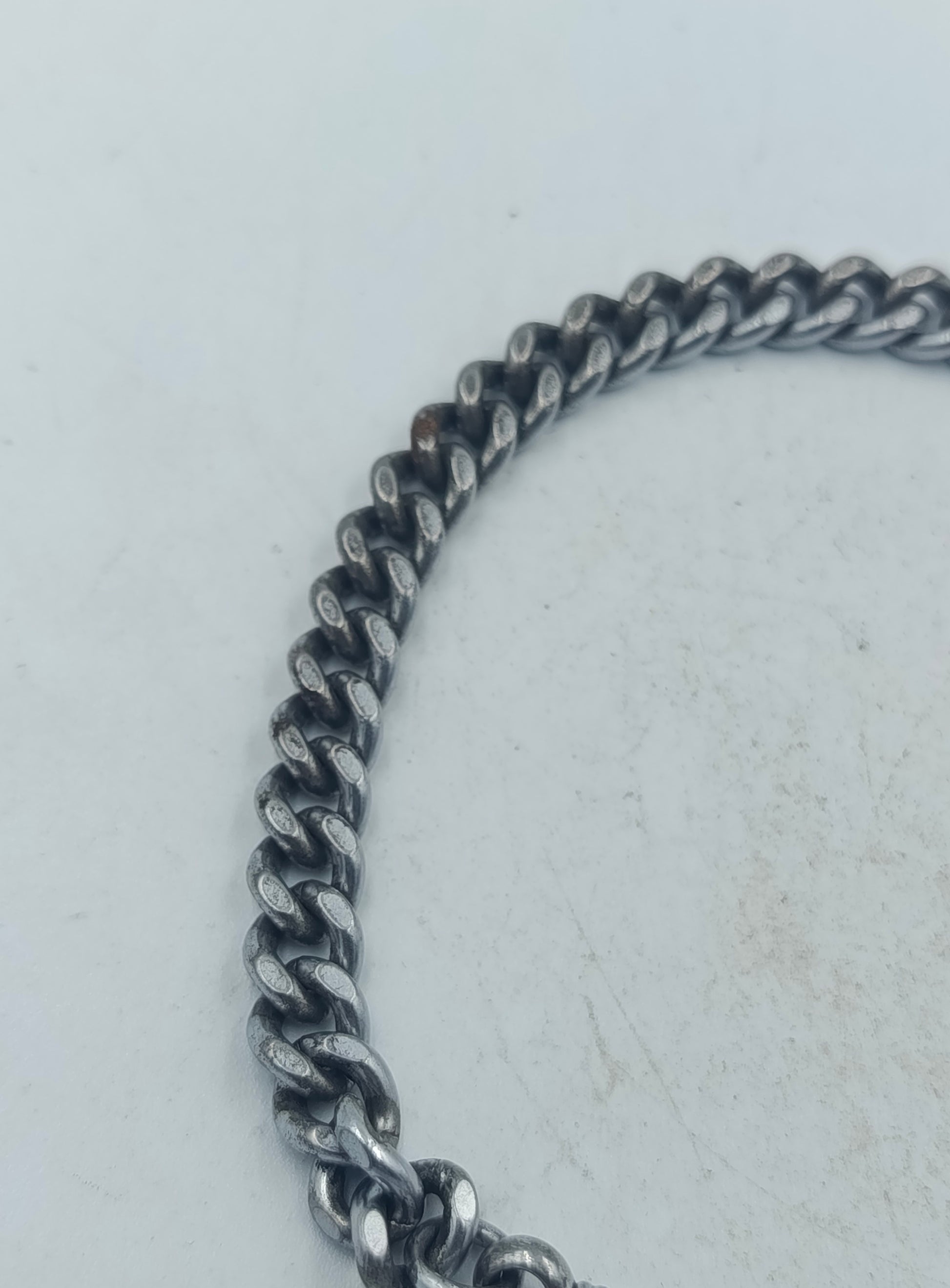 Diese hochwertige versilberte Taschenuhrkette überzeugt durch ihre massive Gliederstruktur und den markanten Rundverschluss mit warmem Metallton. Die gleichmäßig gearbeitete Kette wirkt robust und zugleich elegant und eignet sich ideal für klassische Taschenuhren oder als dekoratives Accessoire an Weste oder Hose. Ein zeitloses Stück mit authentischem Vintage Charakter.
