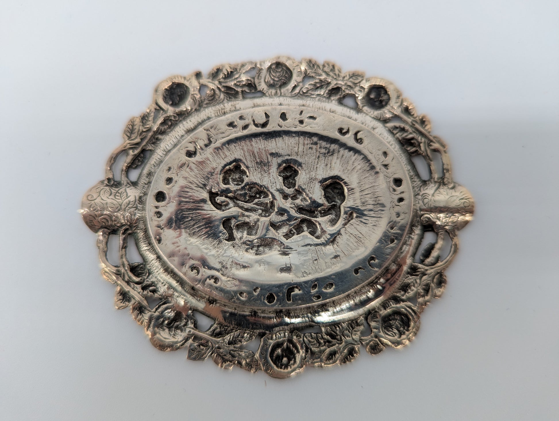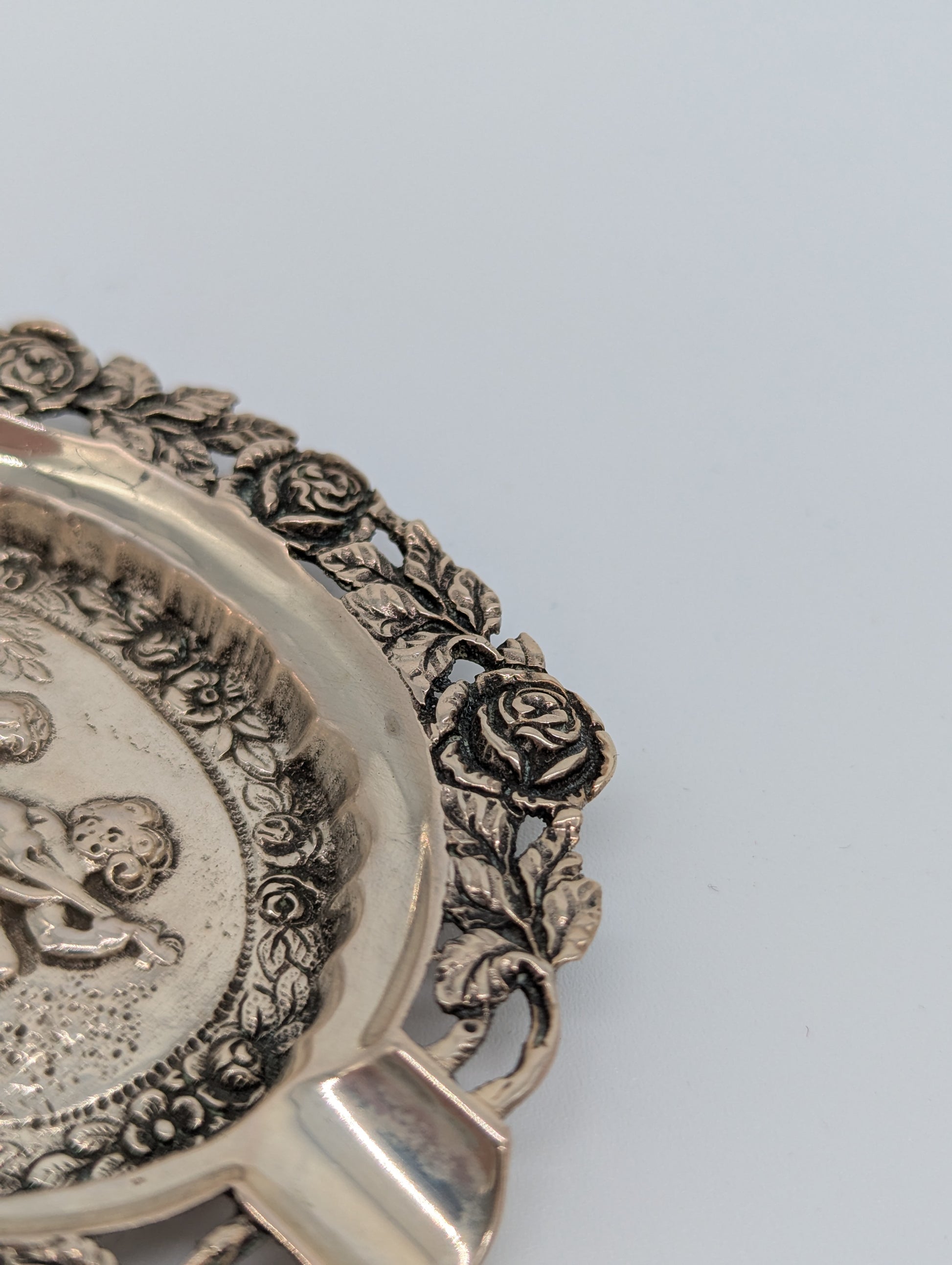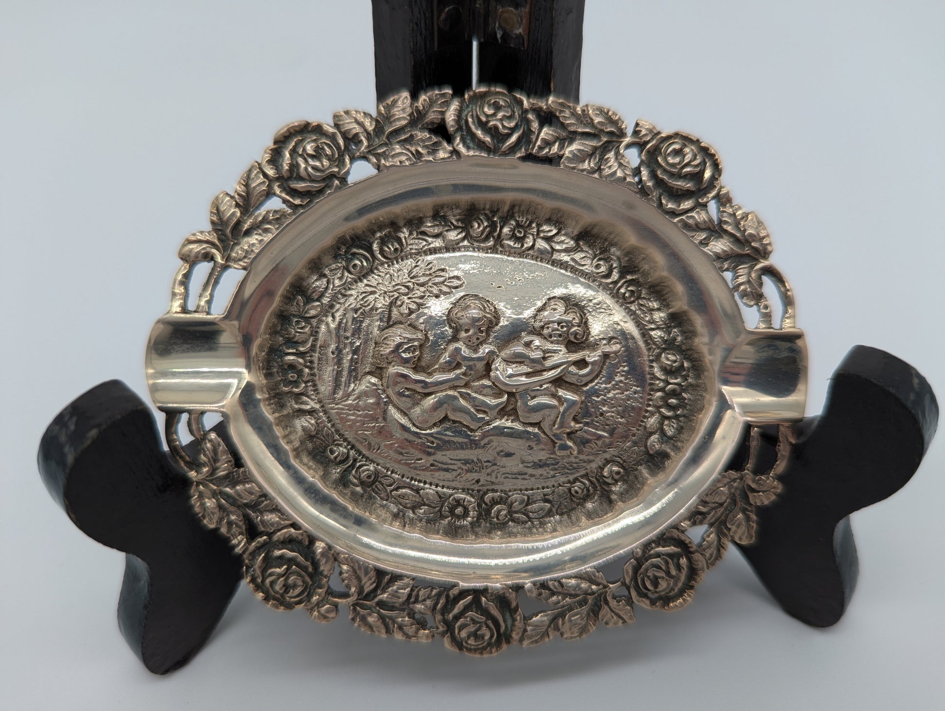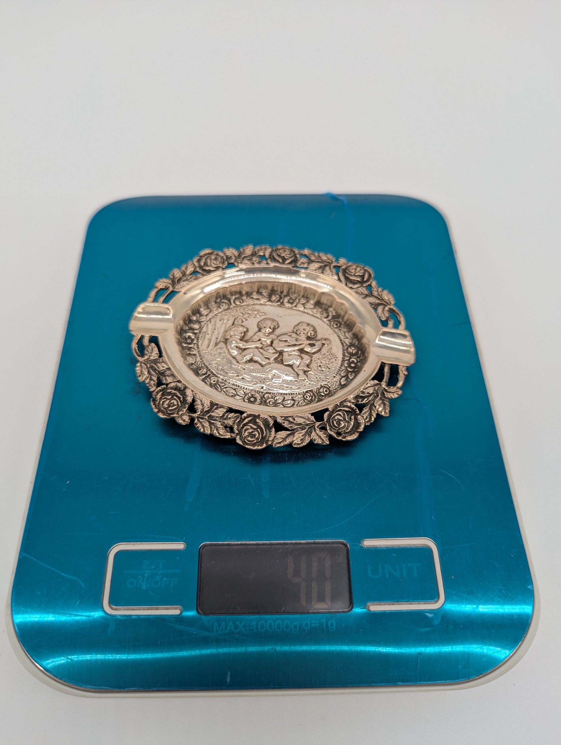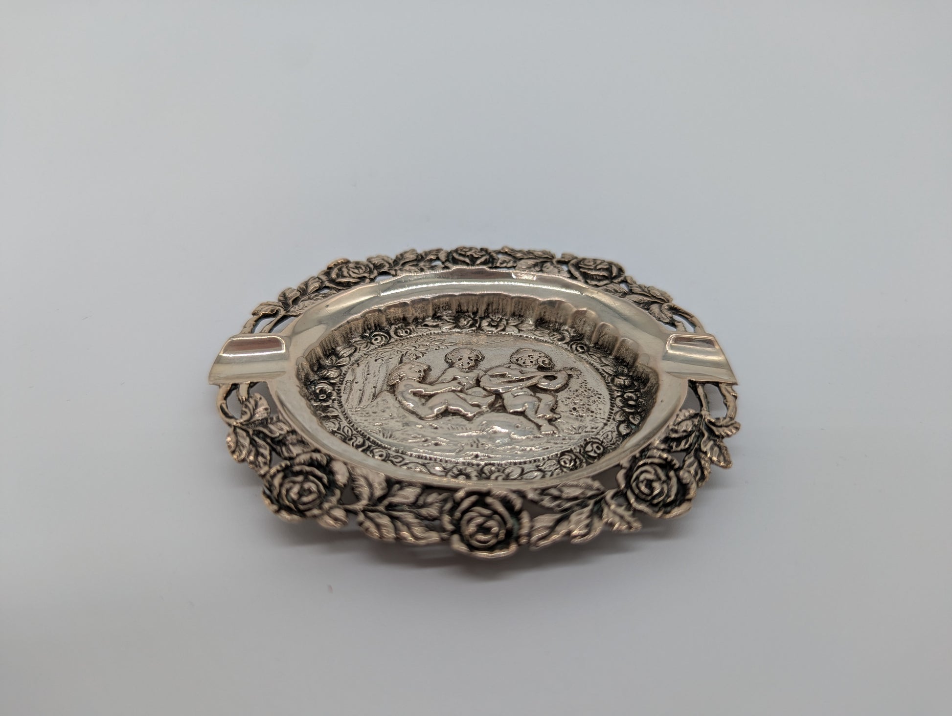 Dieser dekorative Aschenbecher aus versilbertem Metall zeigt im Zentrum eine detailreiche Darstellung spielender Putten, umrahmt von floralen Ornamenten. Der fein ausgearbeitete Rosenrand verleiht dem Stück besonderen Charme. Mit seiner handlichen Größe eignet sich der Aschenbecher sowohl als Sammlerobjekt als auch als dekoratives Accessoire.