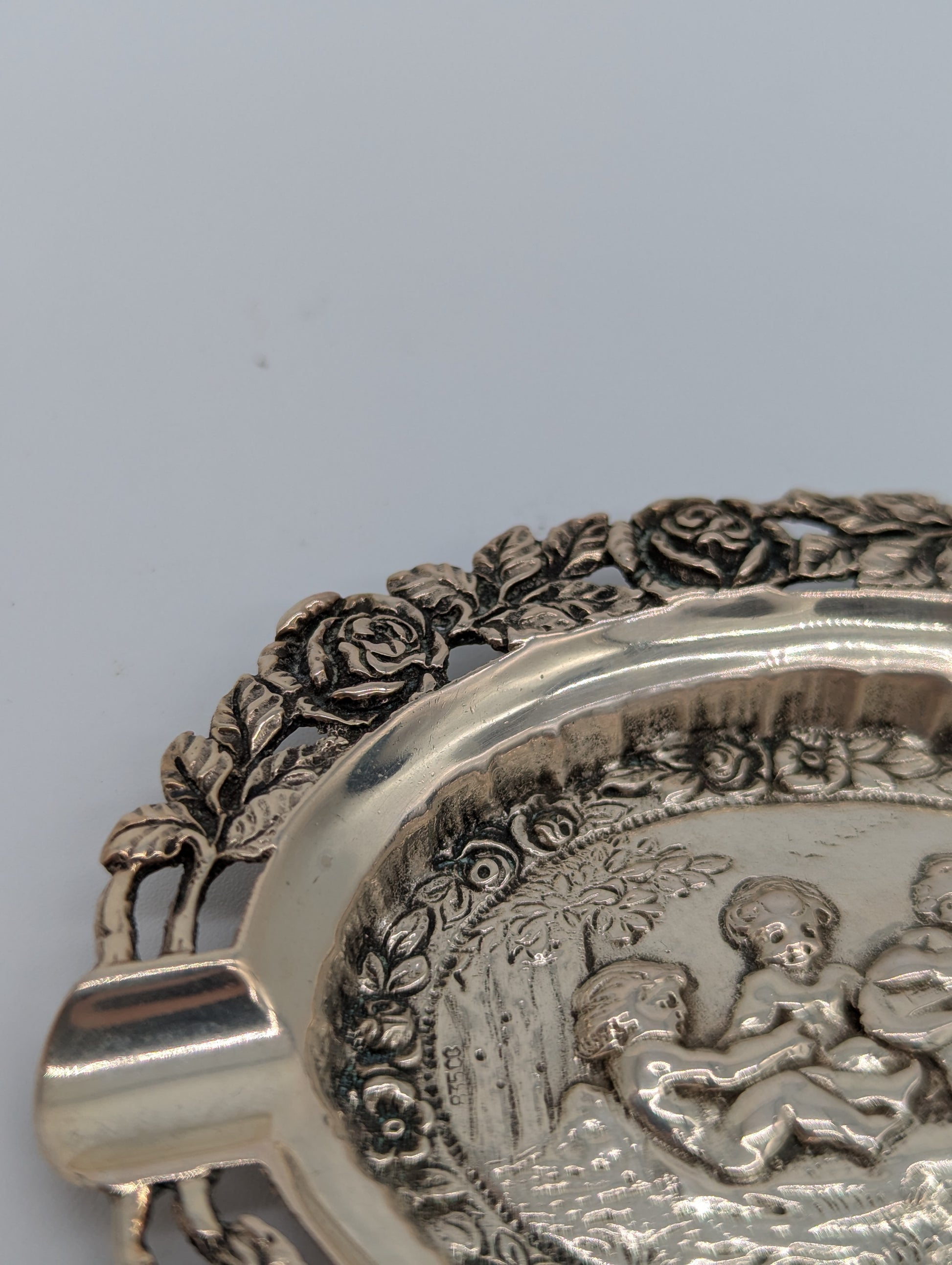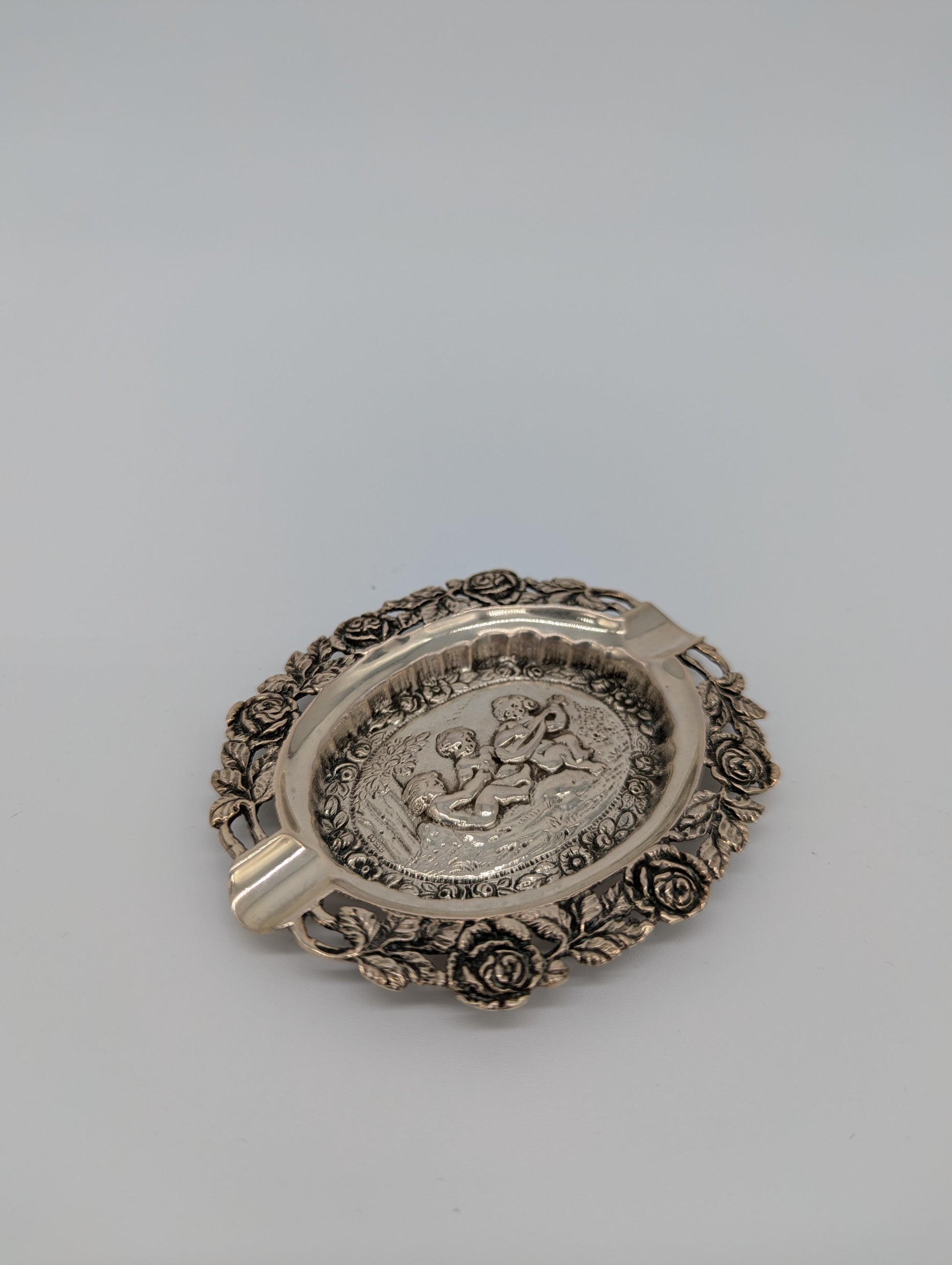Versilberter Aschenbecher mit Puttenmotiven und reichem Dekor
