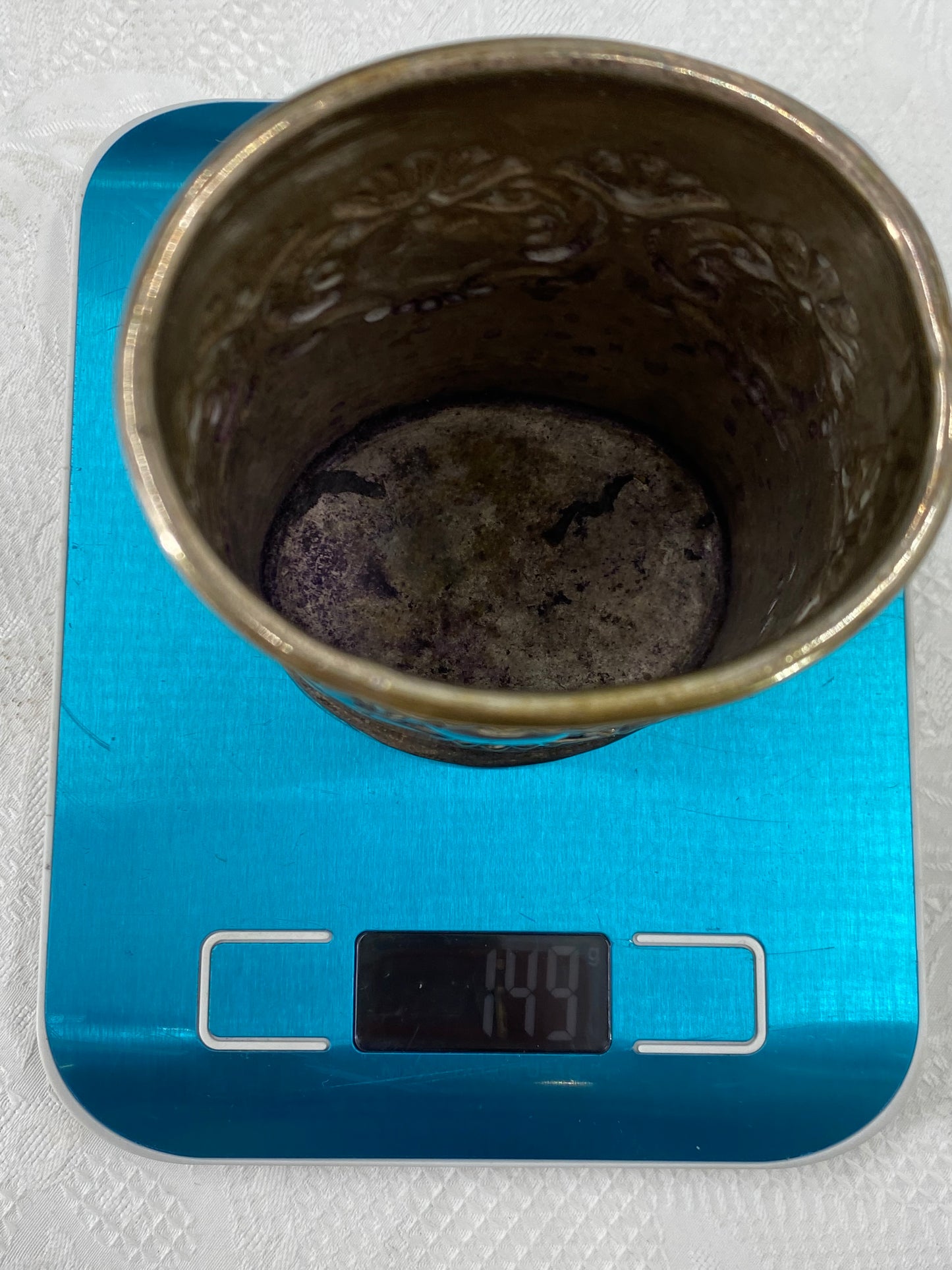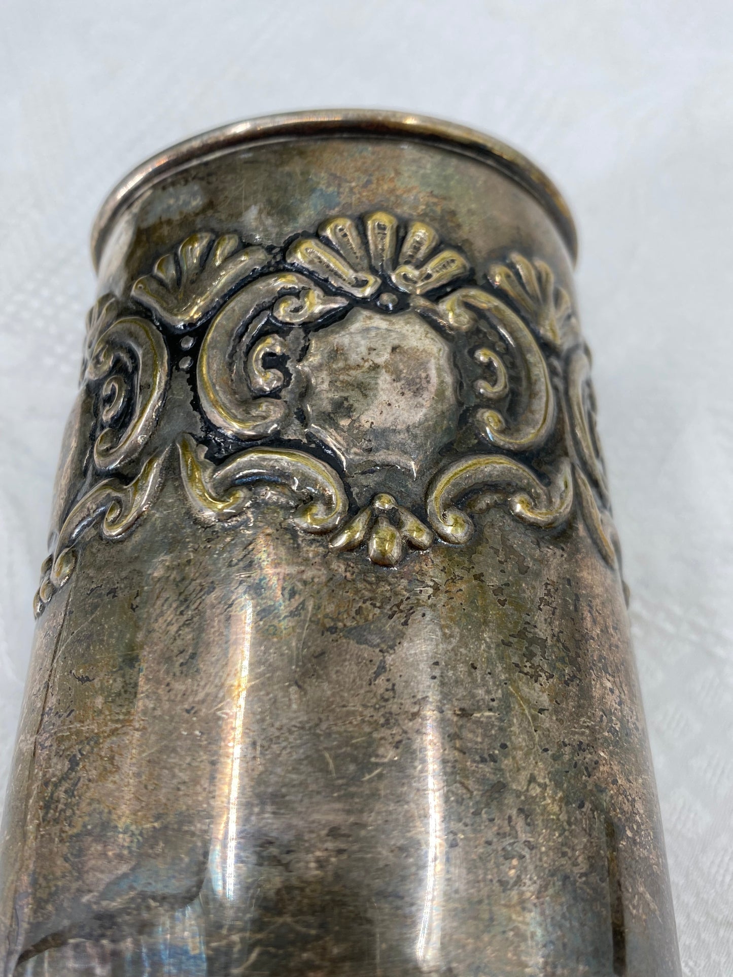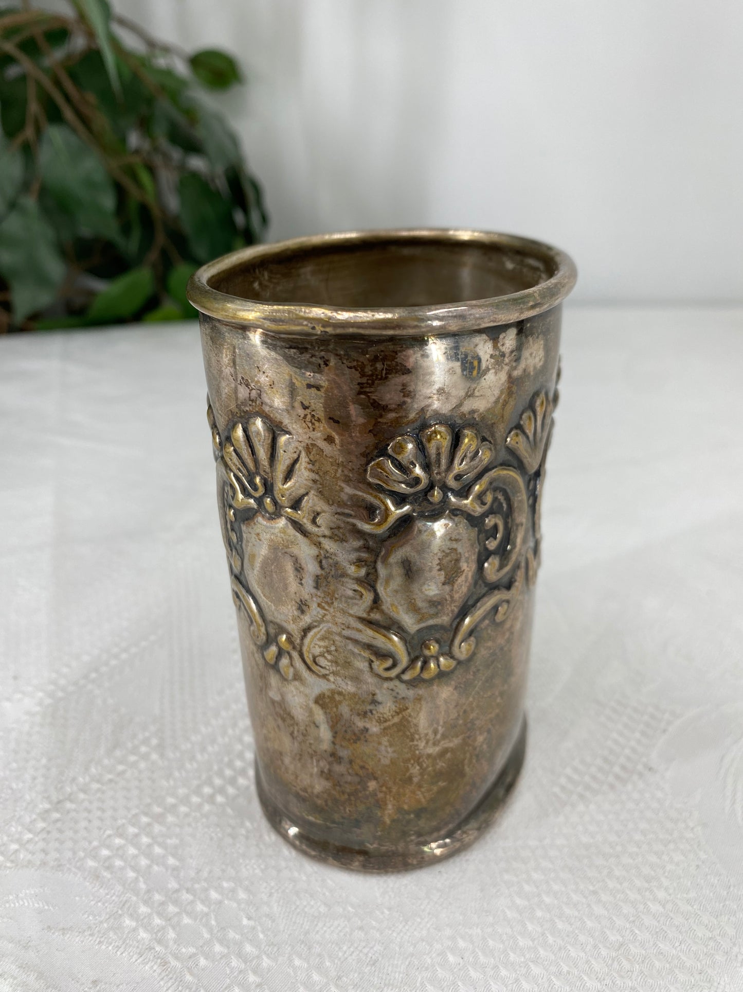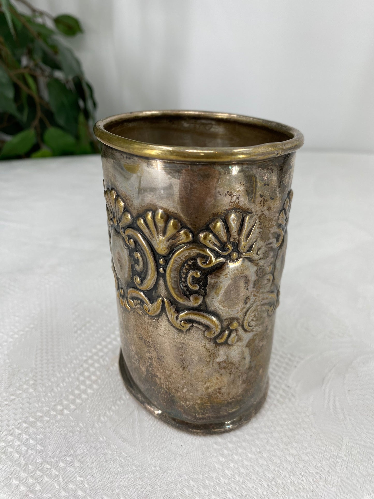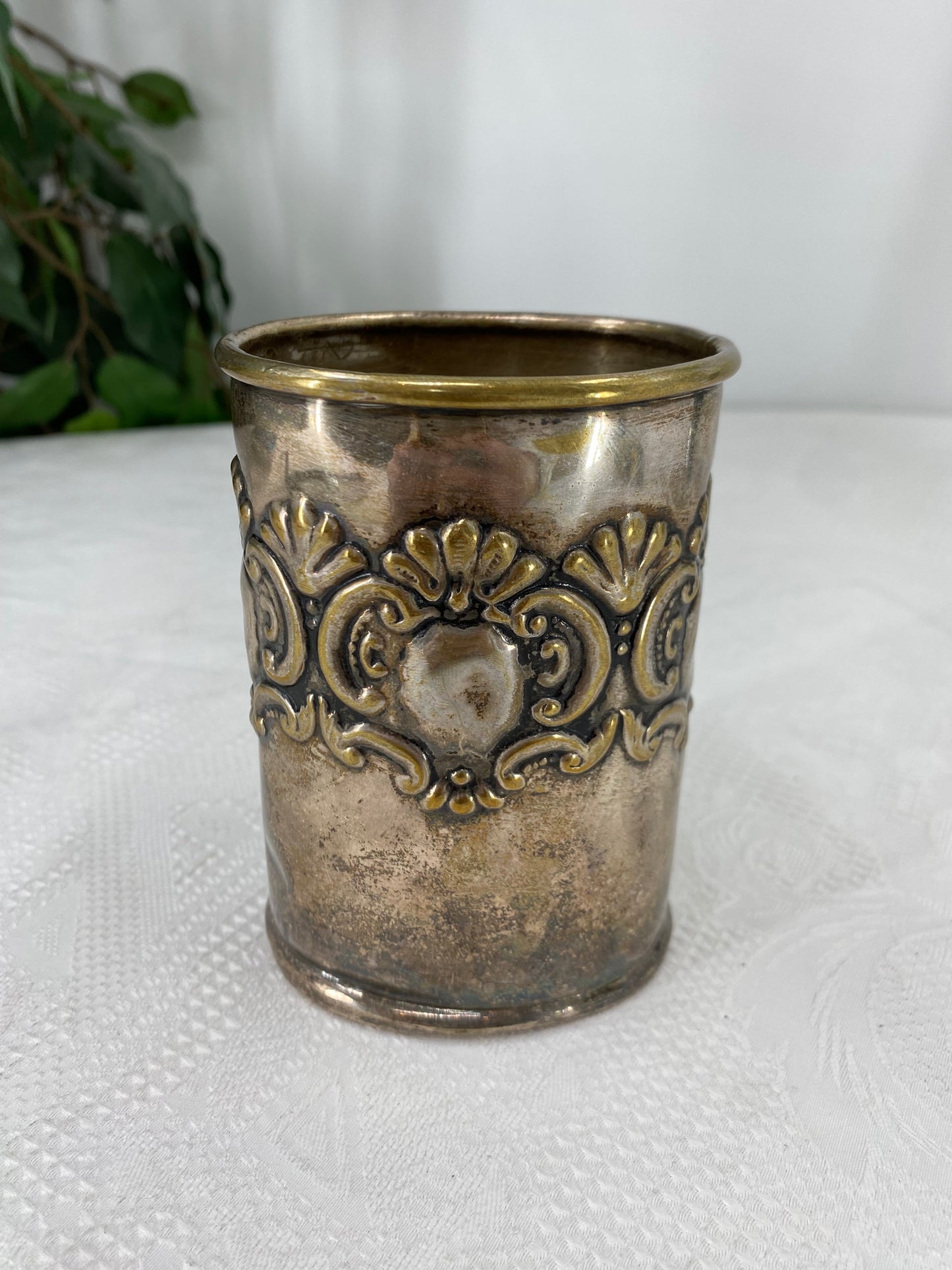 Beschreibung: Tauchen Sie ein in die Welt kultivierter Eleganz mit diesem versilberten Becher, der in einem erstklassigen Zustand präsentiert wird. Dieser Becher ist nicht nur ein praktisches Geschirrstück, sondern auch ein begehrenswertes Sammlerstück für Liebhaber edler Silberwaren.