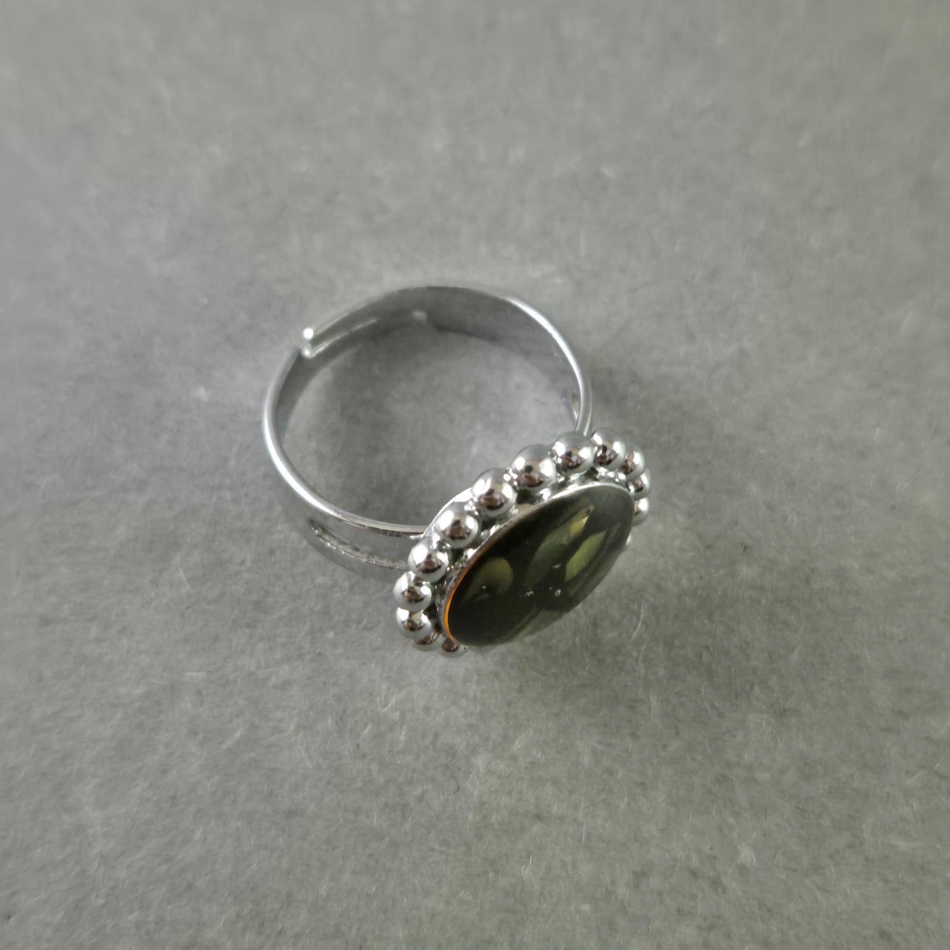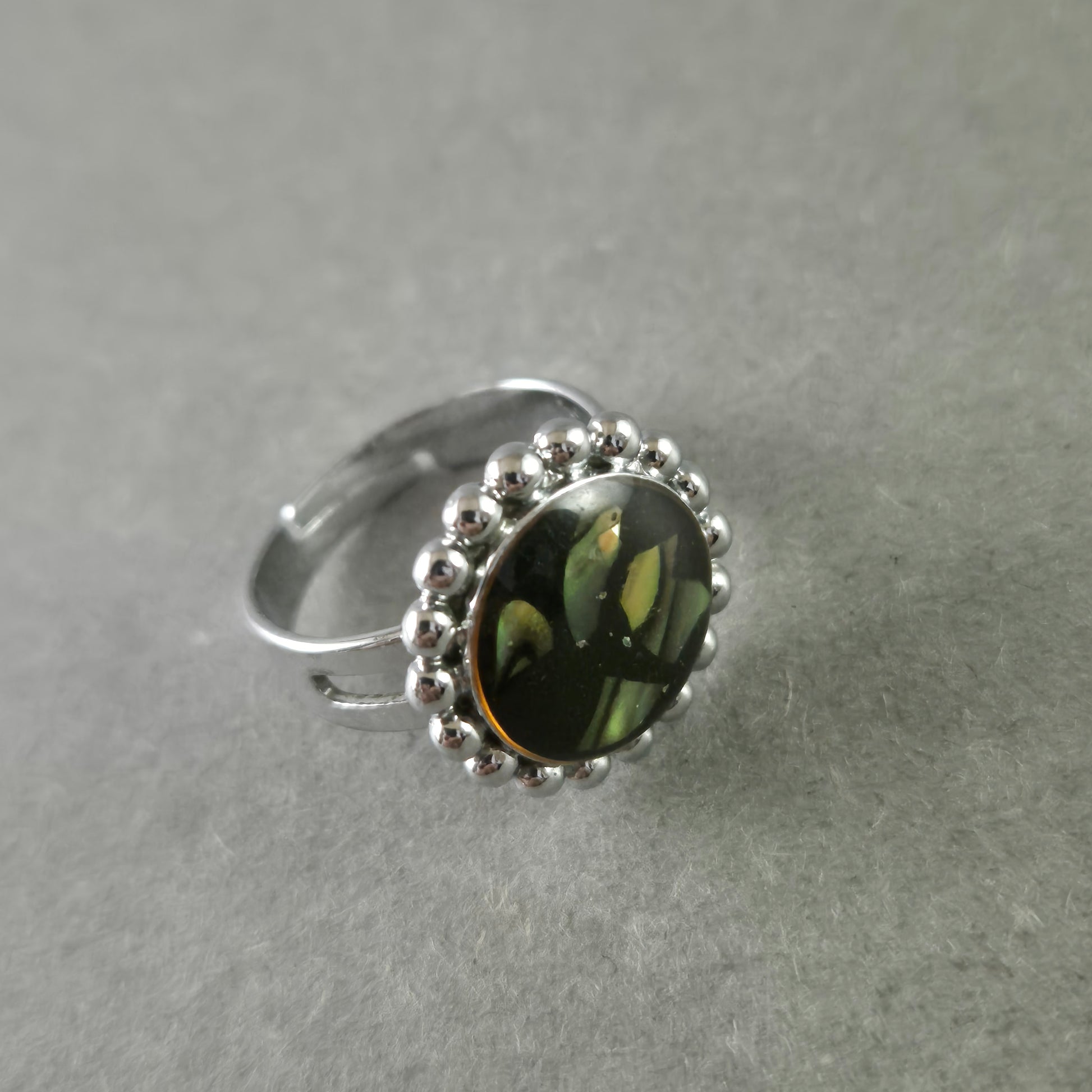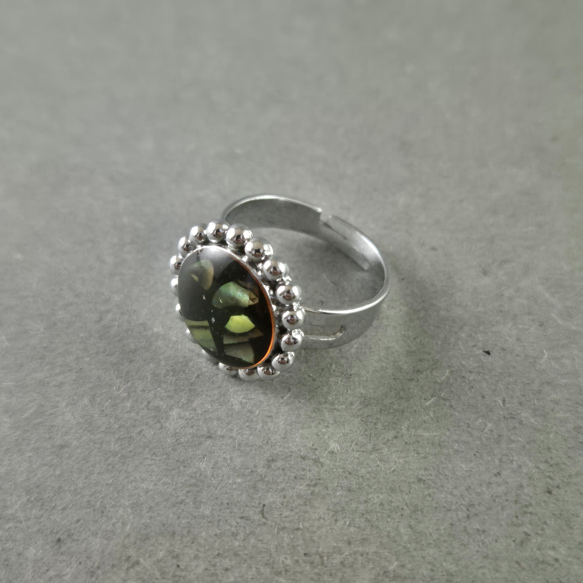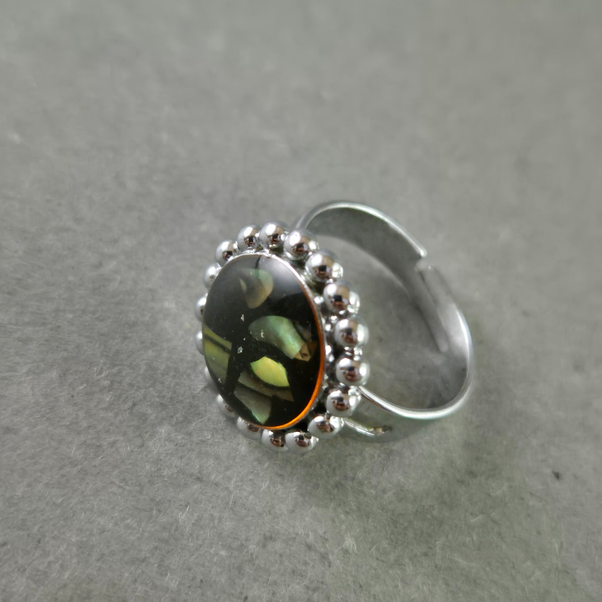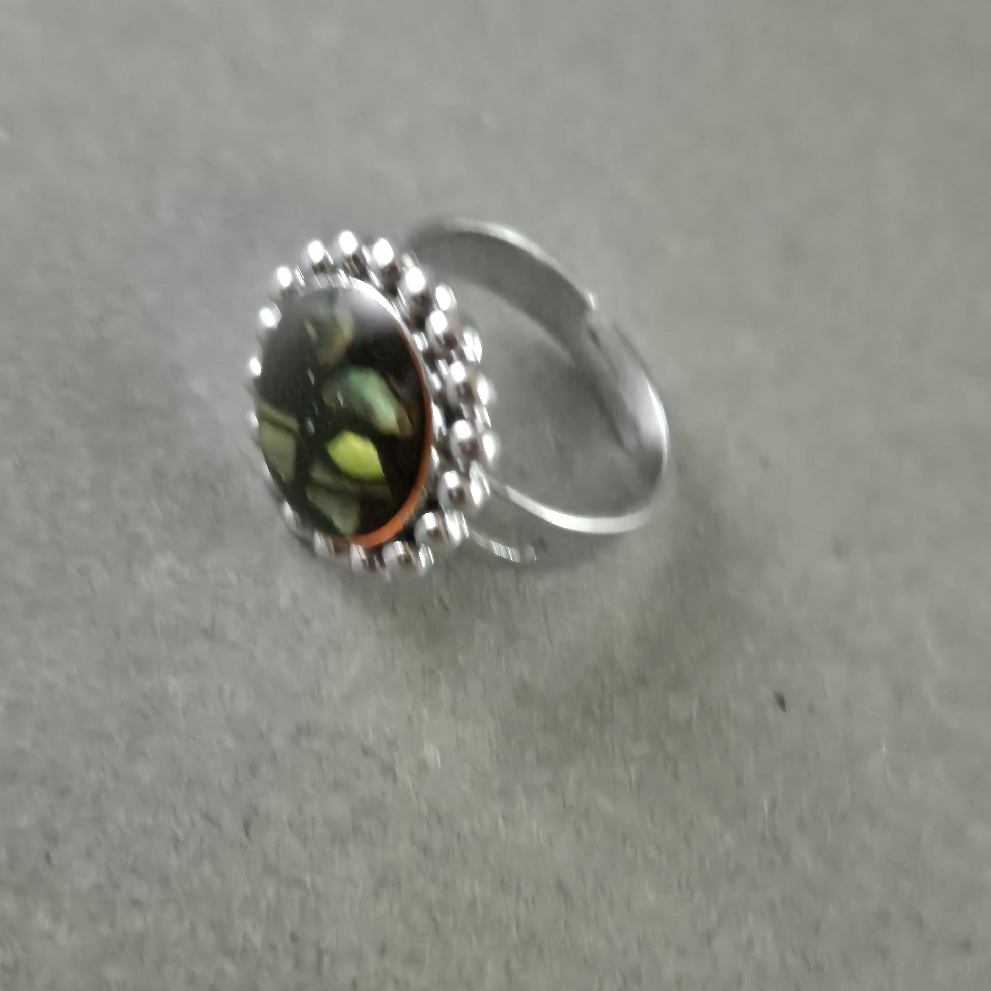 Ein schöner Silberring, der durch seinen auffälligen, ovalen Stein mit Perlmutt-Effekt besticht. Der Stein zeigt schimmernde grün-goldene Reflexe, die sich je nach Lichteinfall verändern. Umrahmt wird er von einer dekorativen Kugelfassung, die dem Ring eine elegante und gleichzeitig verspielte Note gibt.