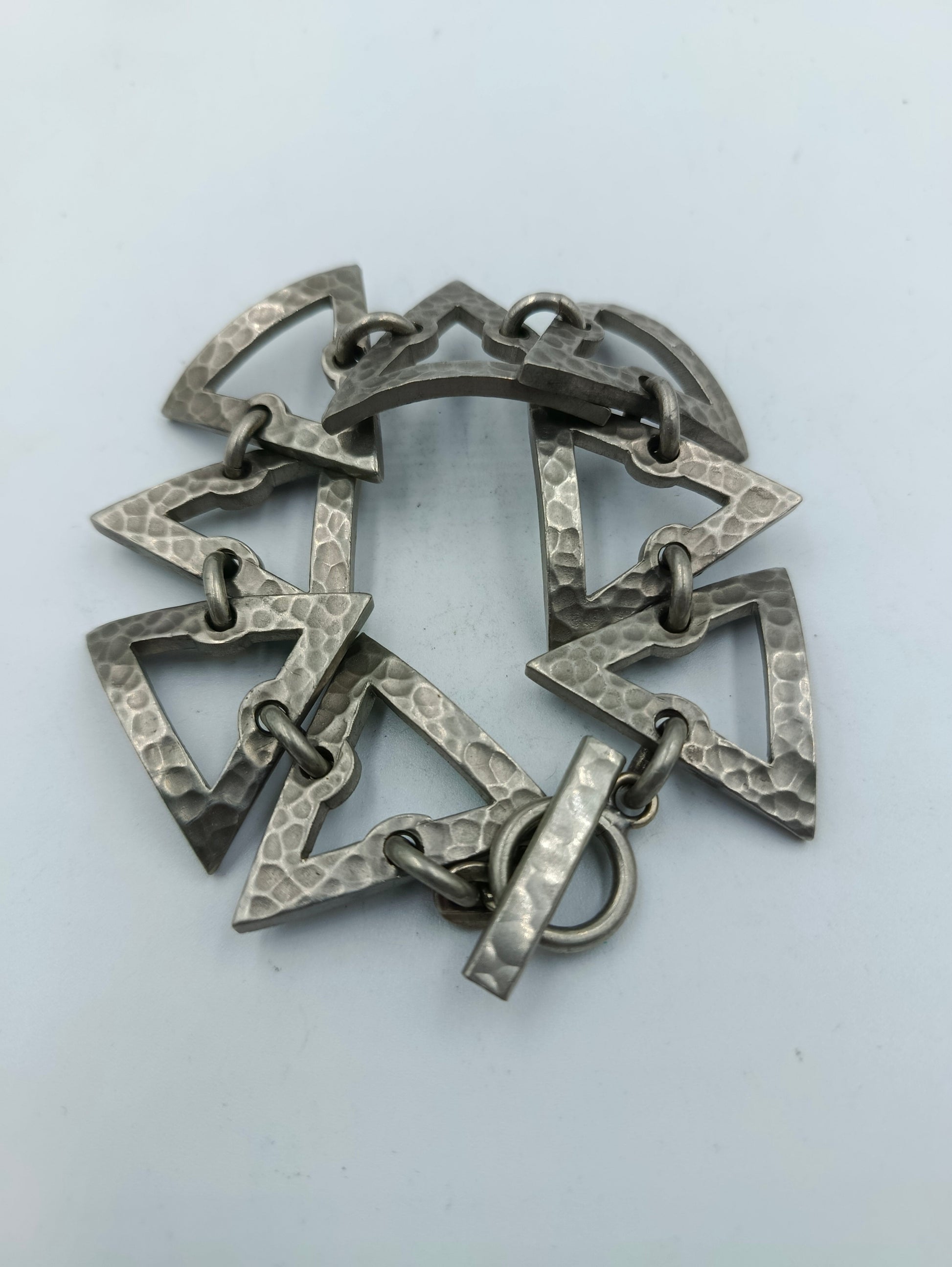 Auffälliges Vintage Armband aus massivem, gehämmertem Metall mit markanten, dreieckigen Gliedern. Das außergewöhnliche Design mit matter Struktur verleiht dem Schmuckstück einen modernen, handwerklichen Charakter.