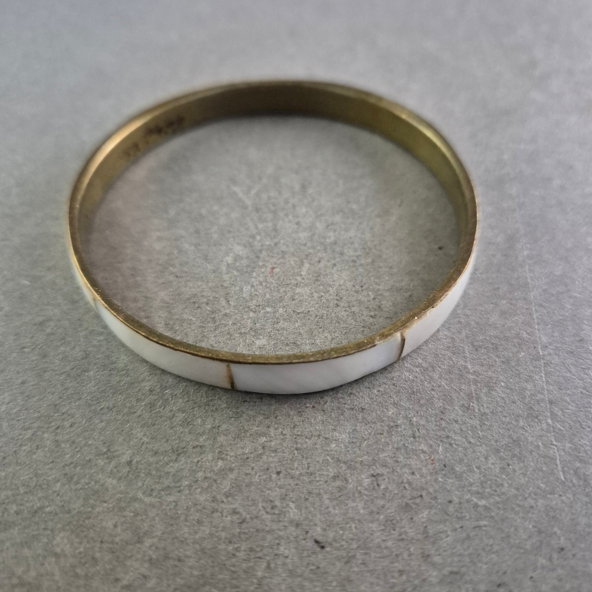 Dieser schlichte Vintage-Armreif überzeugt durch seine klassische Form und die zarte Perlmutt-Einlage, die in feine Messingfassungen eingefasst ist. Die natürliche Schimmerung des Perlmutts harmoniert perfekt mit dem warmen Ton des Metalls und verleiht dem Schmuckstück eine dezente Eleganz – ideal für Liebhaber von Vintage-Designs mit maritimer Note.