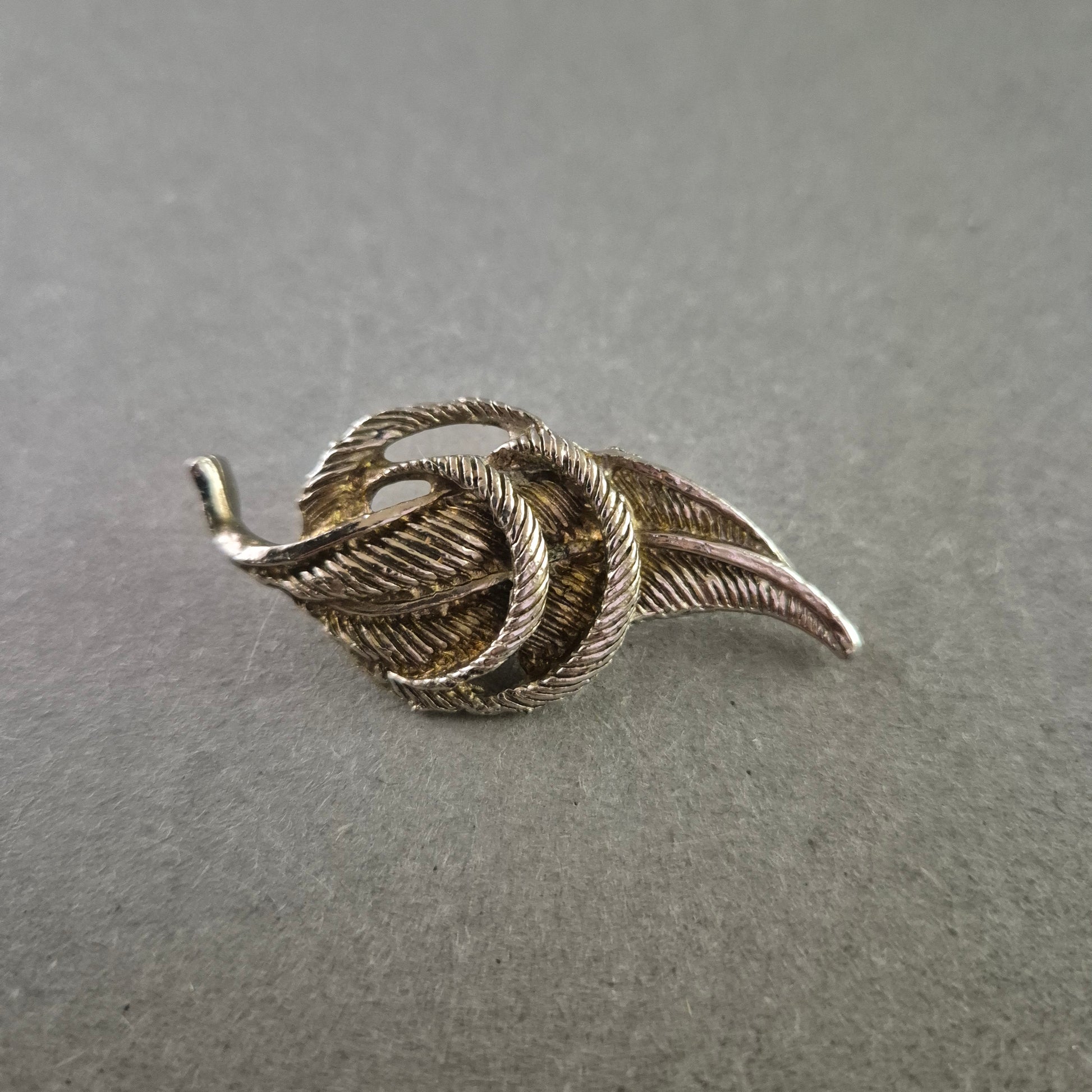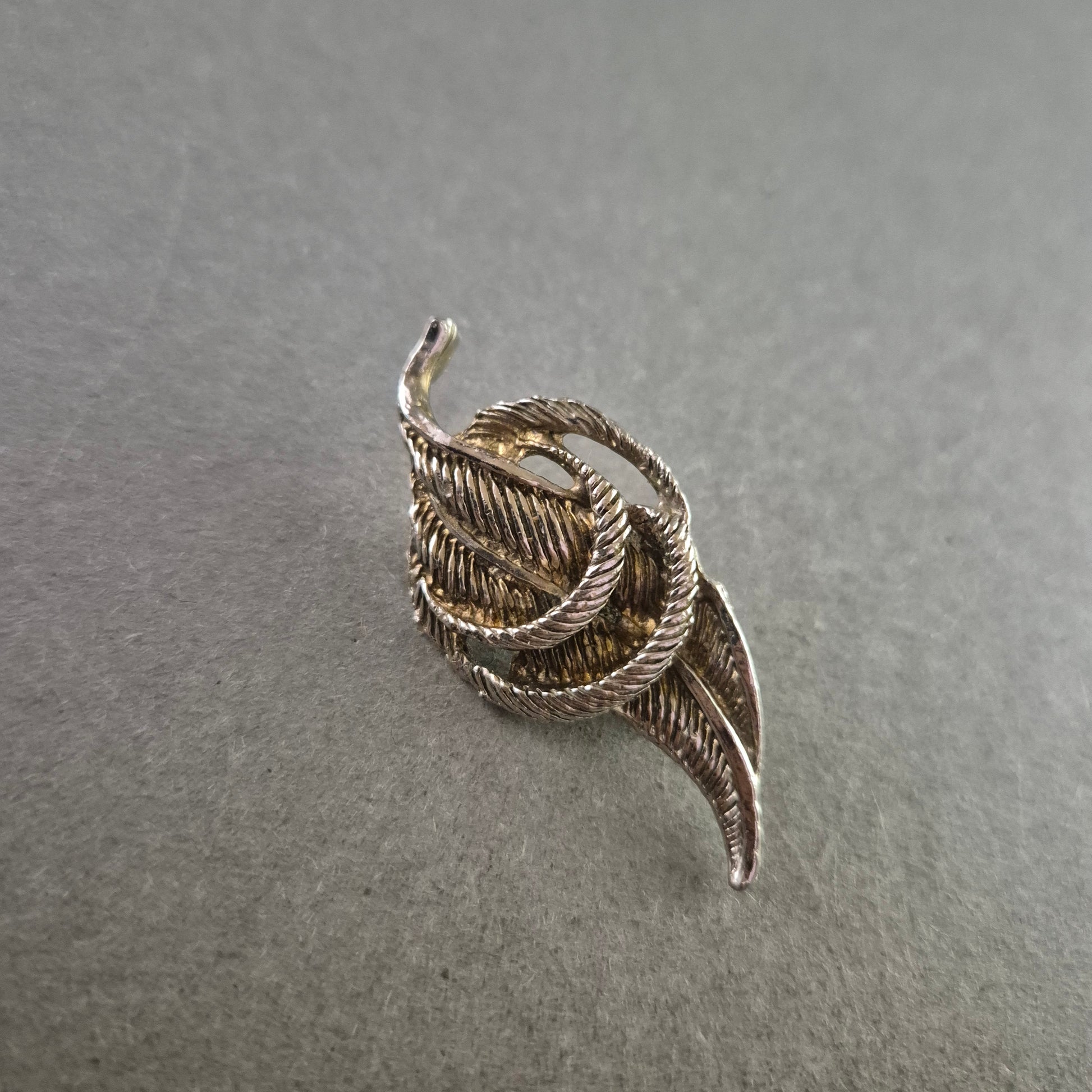 Diese filigrane Vintage-Brosche erinnert in ihrer Form an ein stilisiertes Blatt mit geschwungenen Linien und kunstvoll strukturierten Details. Das silberfarbene Metall verleiht der Brosche eine elegante Optik, während die gedrehten Elemente für eine interessante Tiefenwirkung sorgen. Ein wunderschönes Accessoire für Blusen, Tücher oder Mäntel im klassischen Stil.