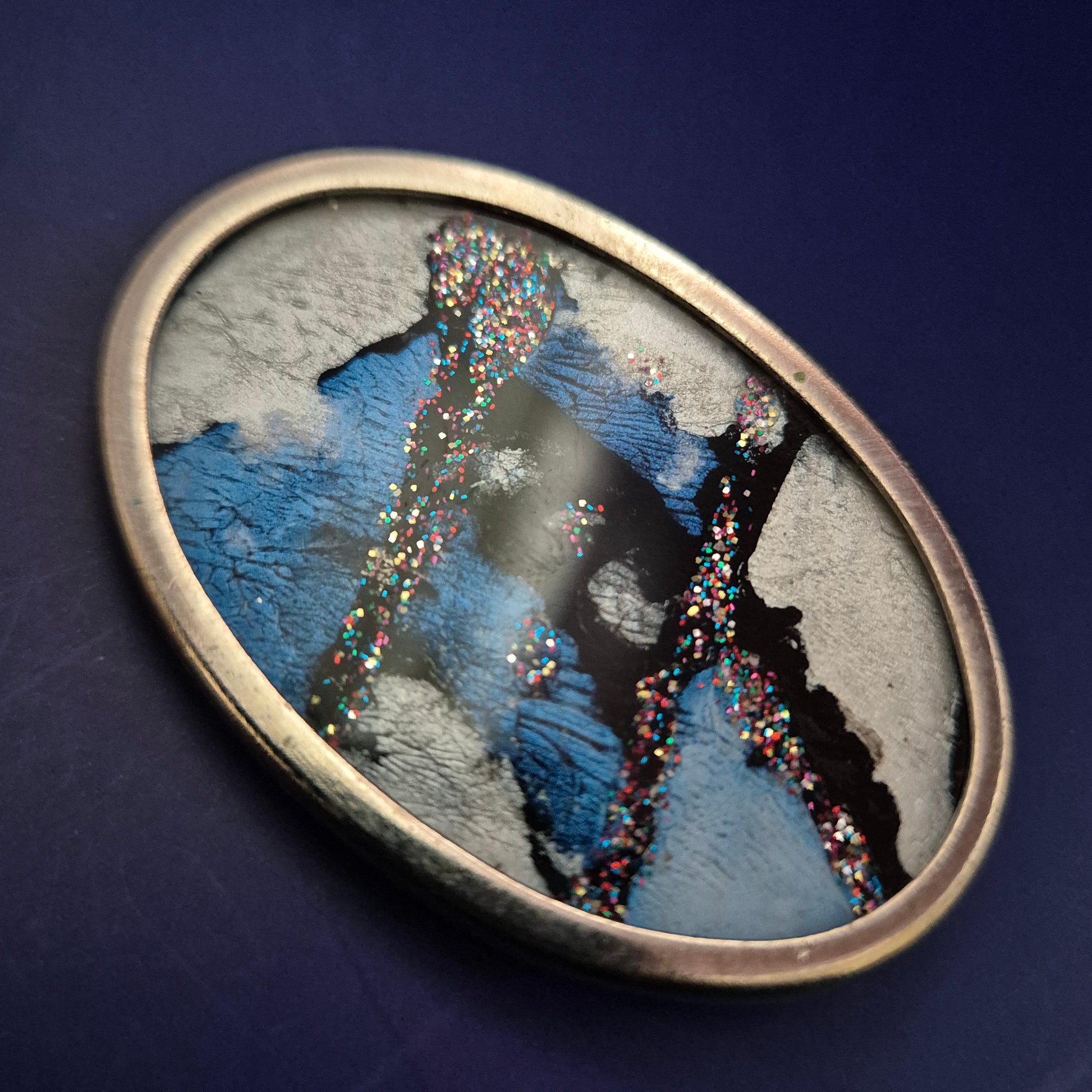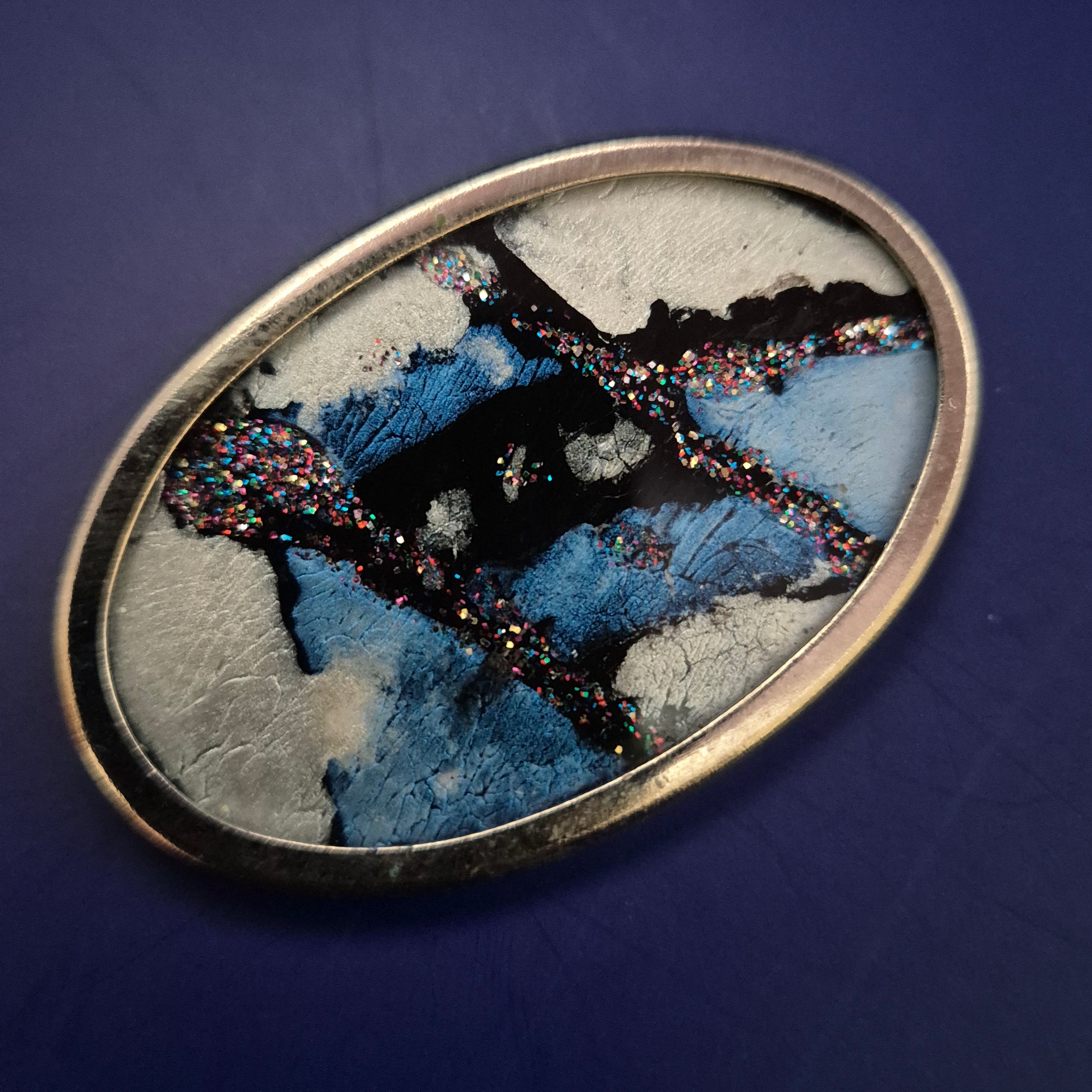 Diese ovale Vintage Brosche begeistert mit einem auffälligen, abstrakten Design in Blau, Schwarz und Silber, veredelt durch schimmernde Glitzerelemente. Die Kombination aus kunstvollem Farbspiel und strukturierter Oberfläche macht dieses Schmuckstück zu einem echten Blickfang – ideal für kreative Mode-Liebhaberinnen.
