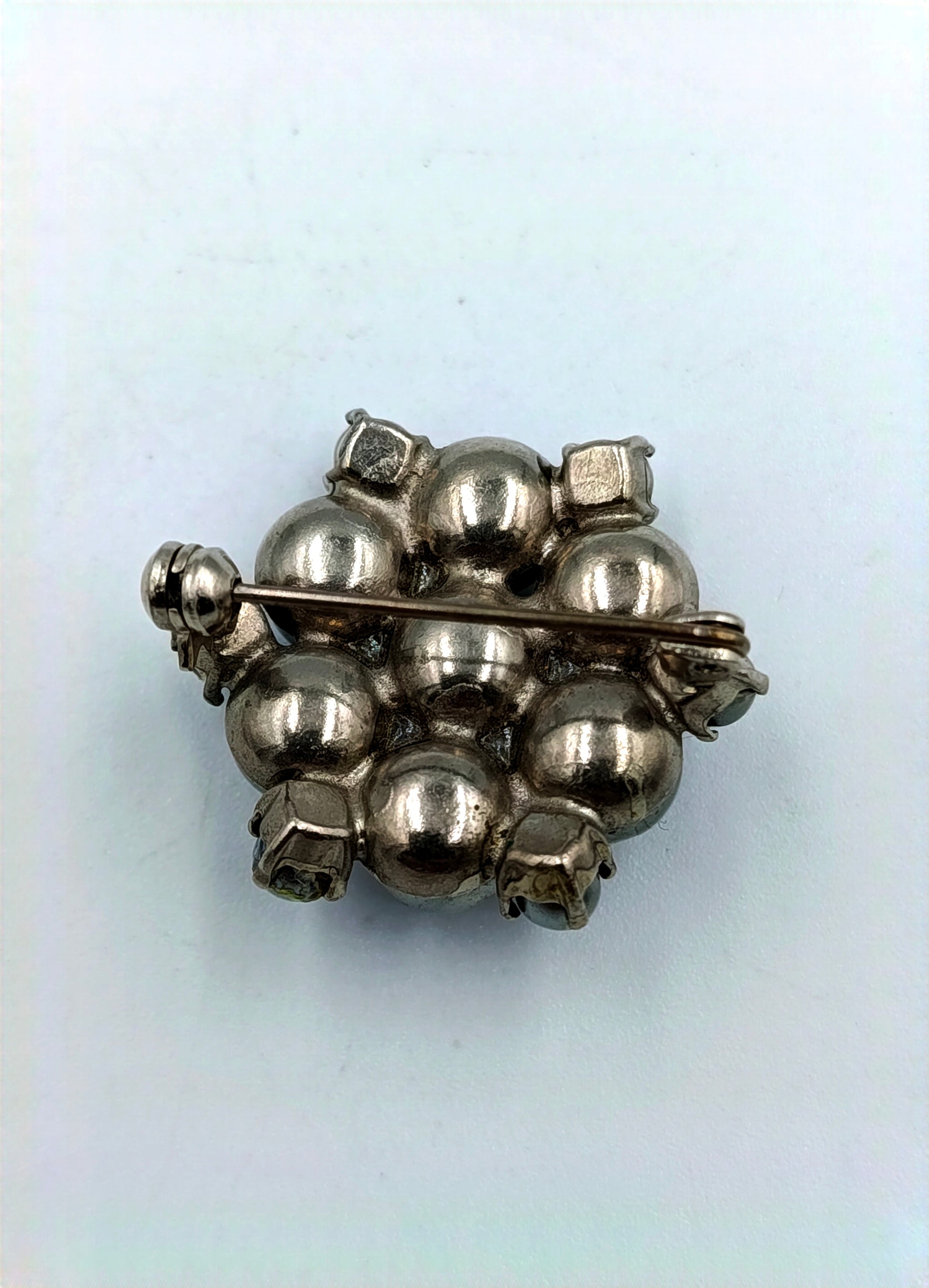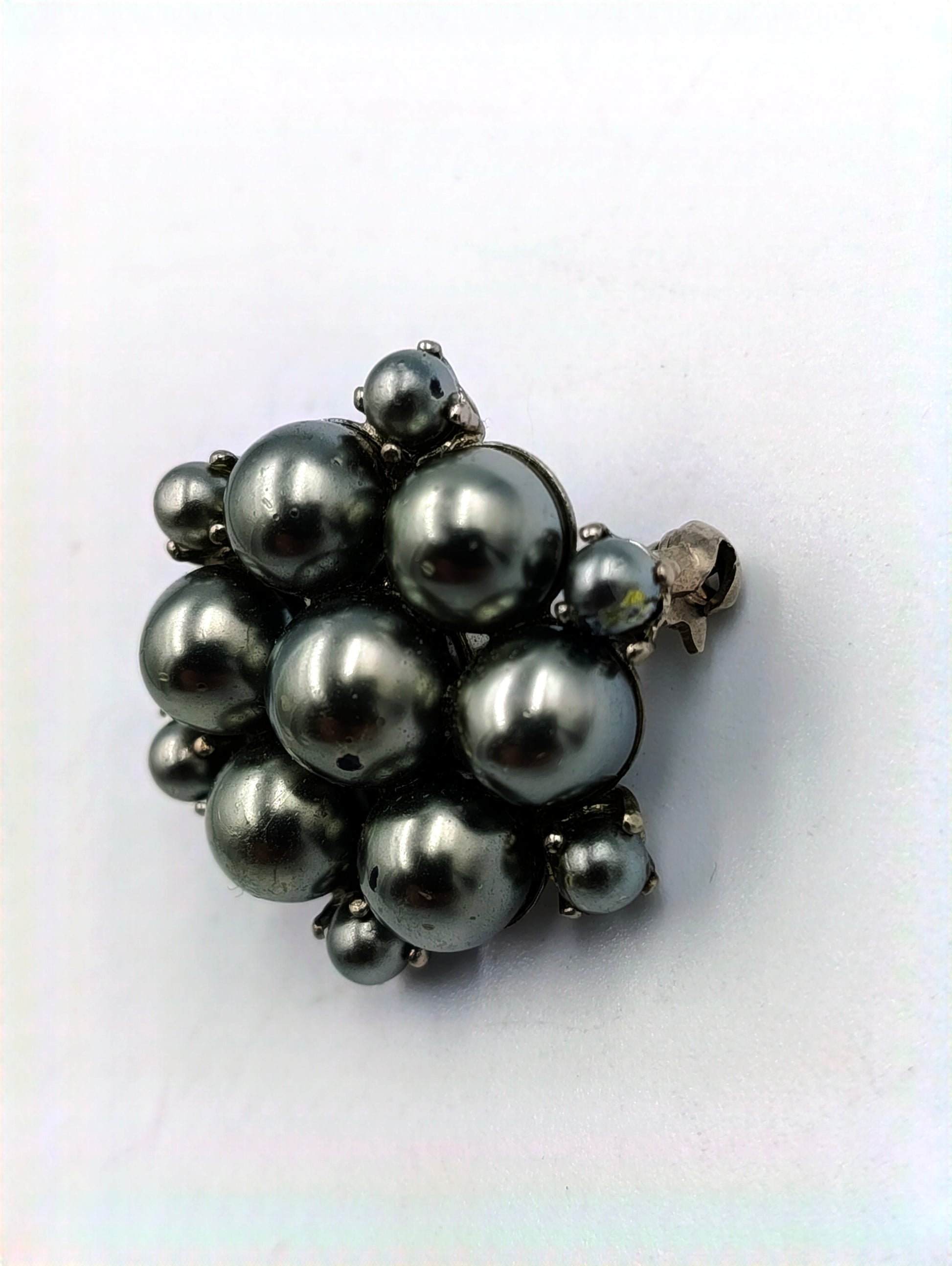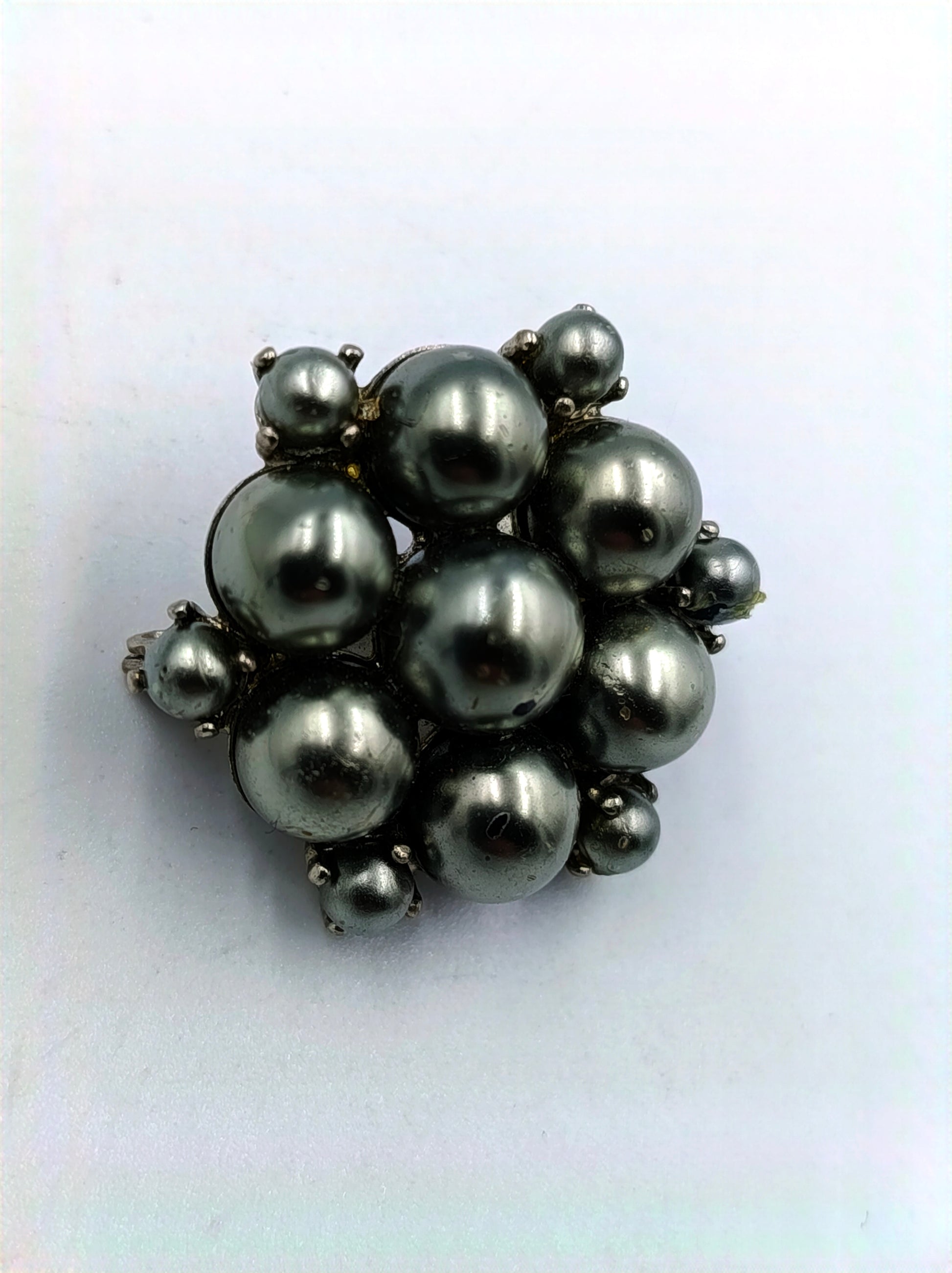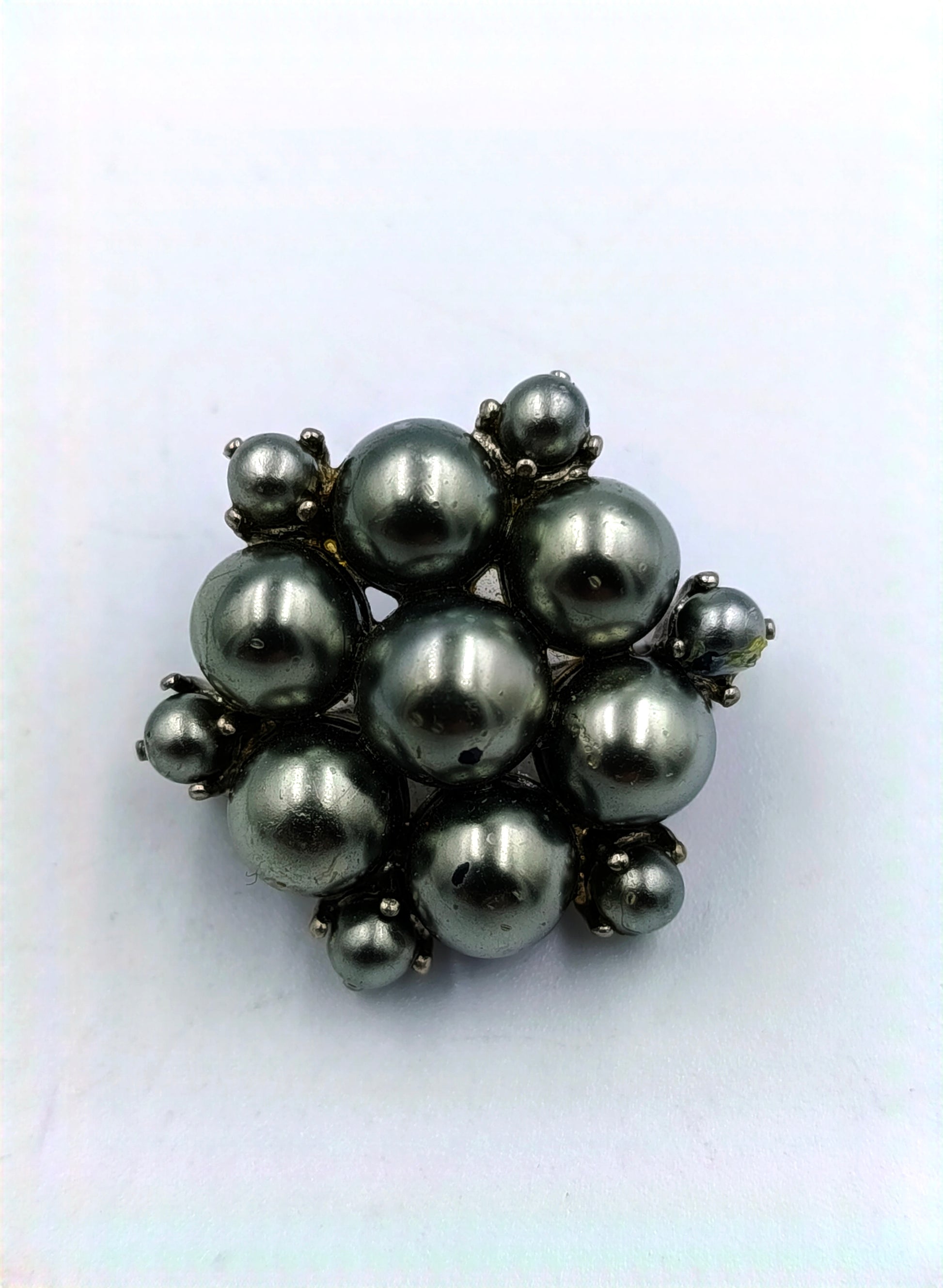 Elegante Brosche im klassischen Cluster-Design, gefertigt aus mehreren grauen, glänzenden Kunstperlen, die zu einer runden Blütenform angeordnet sind. Die Perlen sind in Krappenfassungen gearbeitet und erzeugen einen schönen, plastischen Effekt. Auf der Rückseite befindet sich eine stabile Nadel mit Sicherheitsverschluss. Ein stilvolles Accessoire im Retro-Look – ideal für Blazer, Jacken oder Kleider.