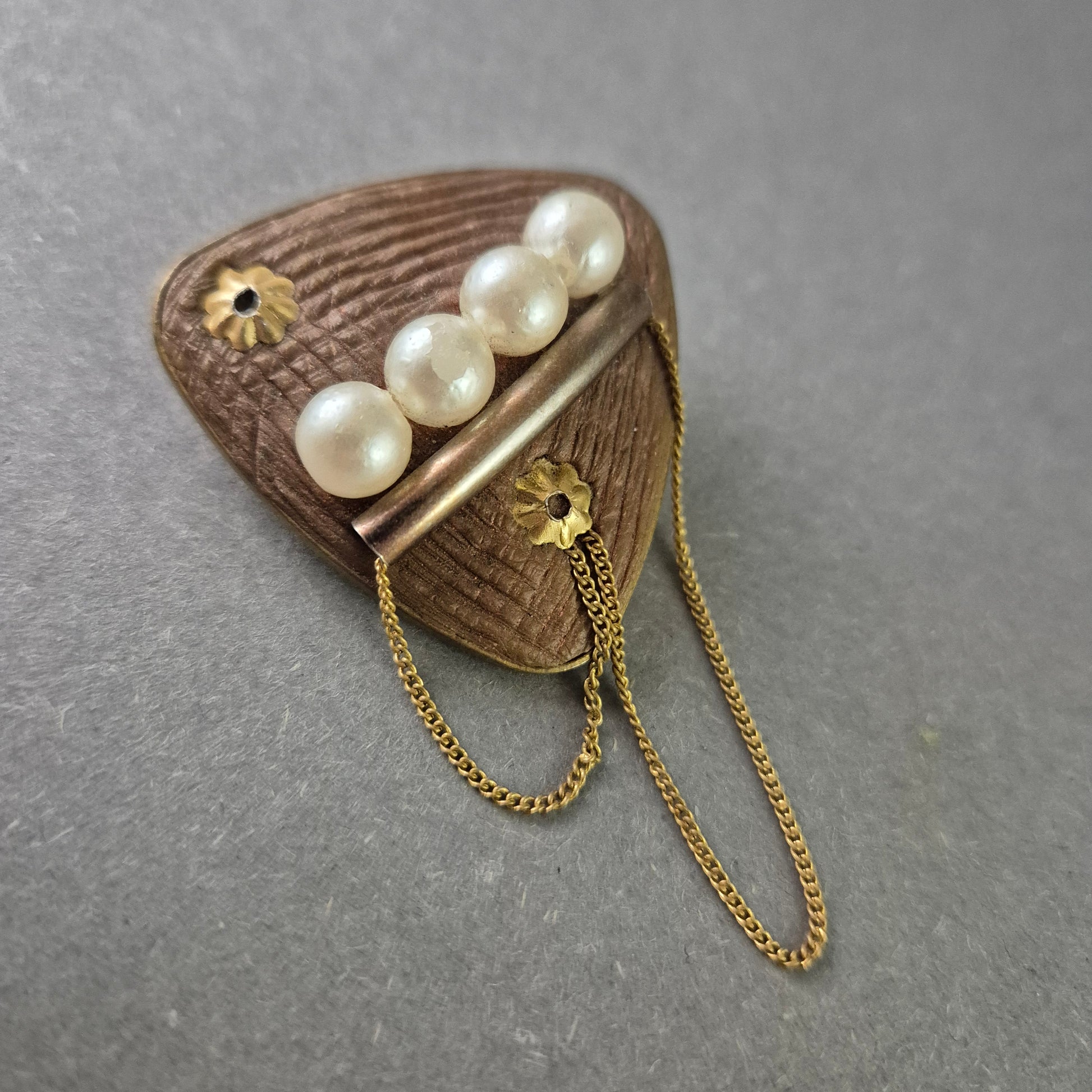 Diese außergewöhnliche Vintage-Brosche überzeugt durch ihr dreieckiges Design mit strukturierter Oberfläche und einer eleganten Perlenreihe. Zwei feine Kettenelemente ergänzen den Look und verleihen der Brosche eine zusätzliche Raffinesse. Ein stilvolles Accessoire, das jedem Outfit einen Hauch von Nostalgie und Eleganz verleiht.