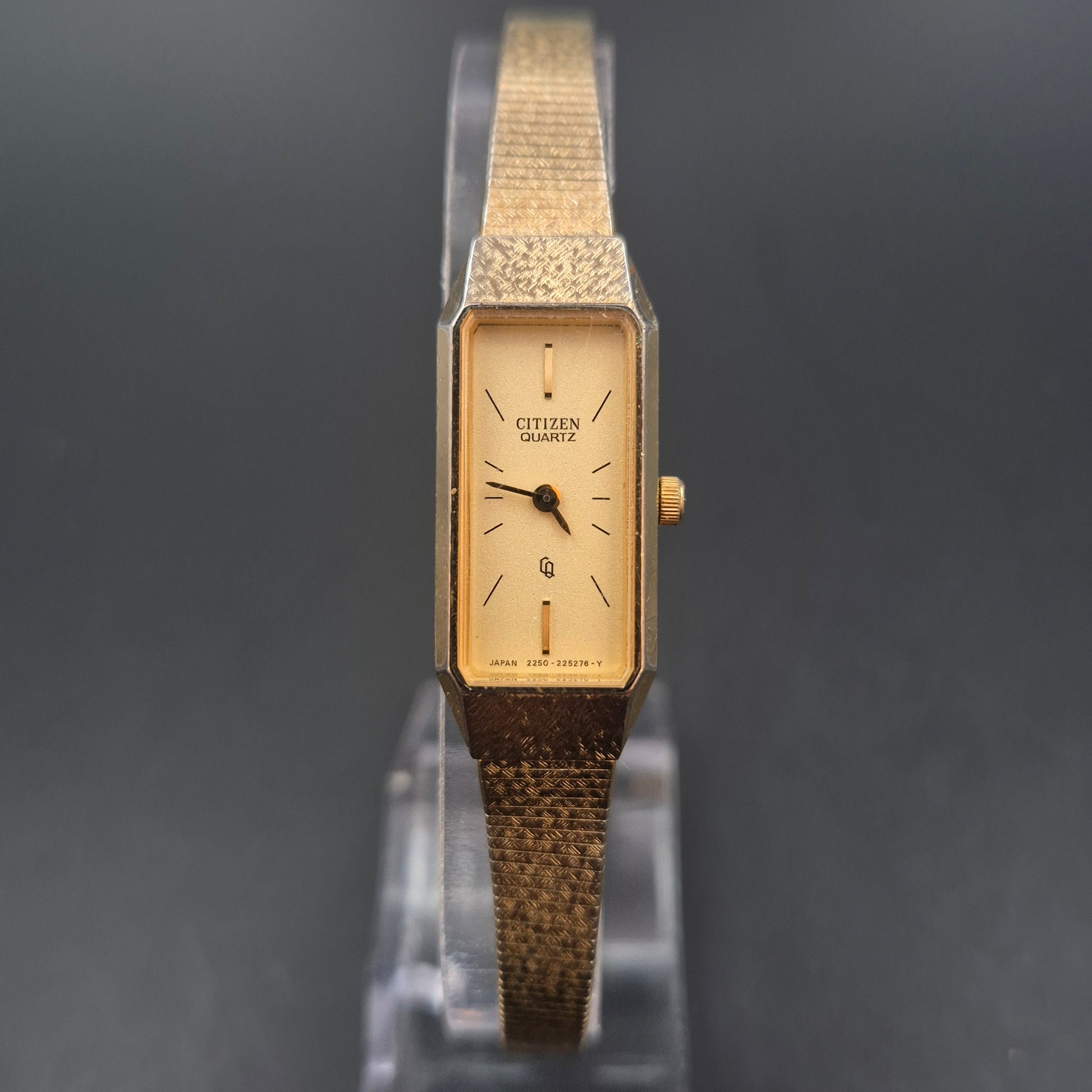 Diese Vintage Citizen Damen Uhr präsentiert sich in einem eleganten, rechteckigen Goldton-Gehäuse mit einem passenden strukturierten Armband. Das schlichte, goldfarbene Zifferblatt mit feinen Indizes unterstreicht den zeitlosen Charakter dieser Uhr. Eine klassische Wahl für Damen, die ein dezentes und stilvolles Accessoire schätzen.