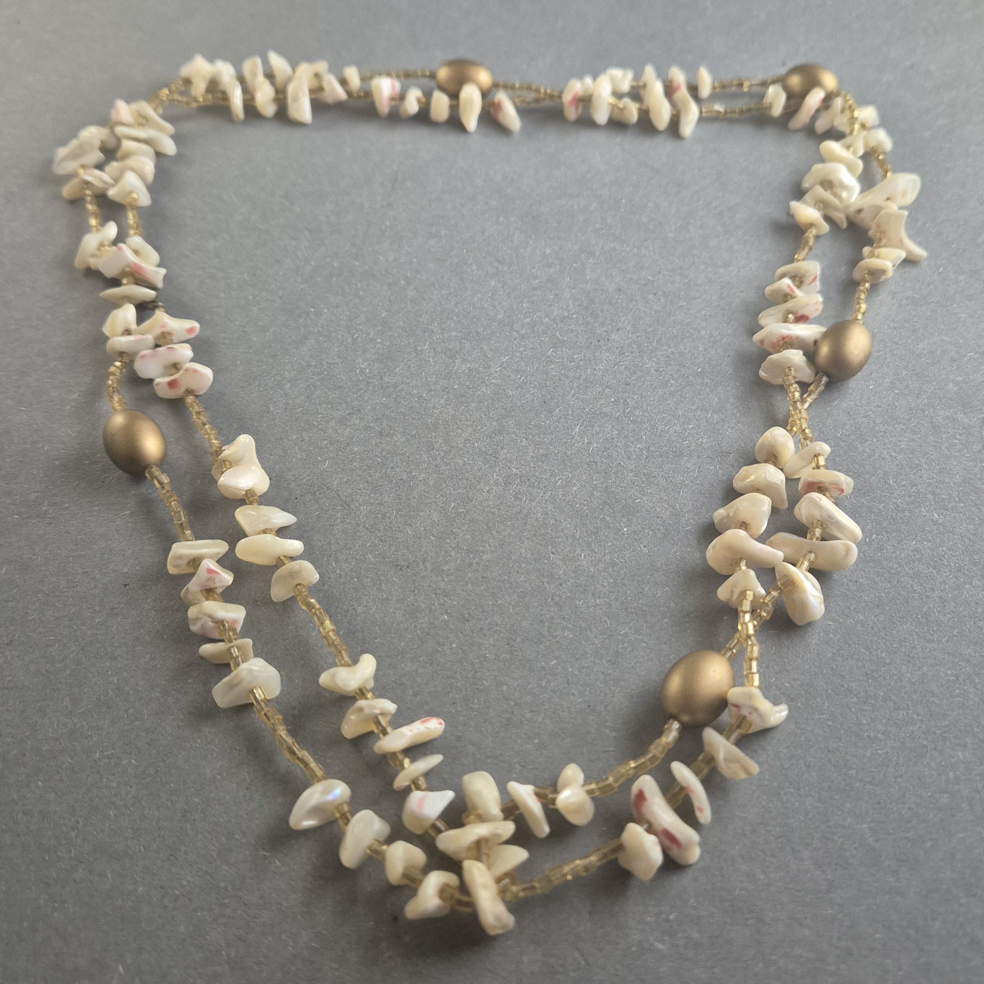 Diese exquisite Vintage-Halskette besticht durch ihre harmonische Kombination aus naturbelassenen Muschelstücken und zarten Glasperlen in goldenen Tönen. Die unregelmäßigen Muschelperlen verleihen der Kette eine organische, maritime Ästhetik, während die glänzenden goldfarbenen Akzente eine edle Note hinzufügen. Ideal für Liebhaber von Natur- und Strandschmuck oder als stilvolles Accessoire für sommerliche Outfits.