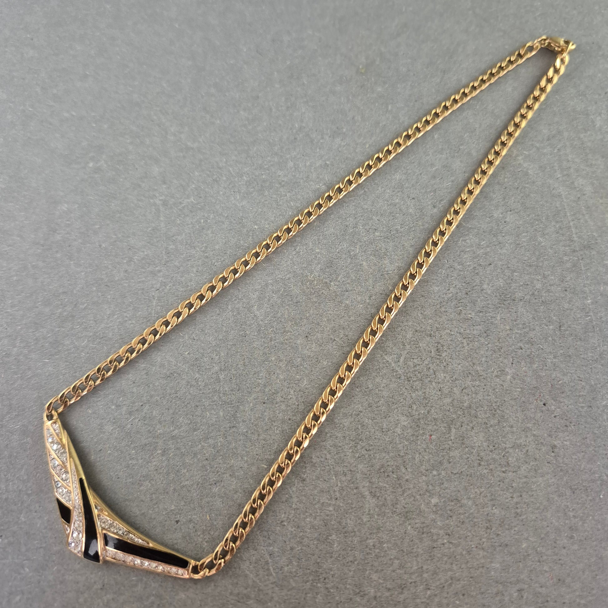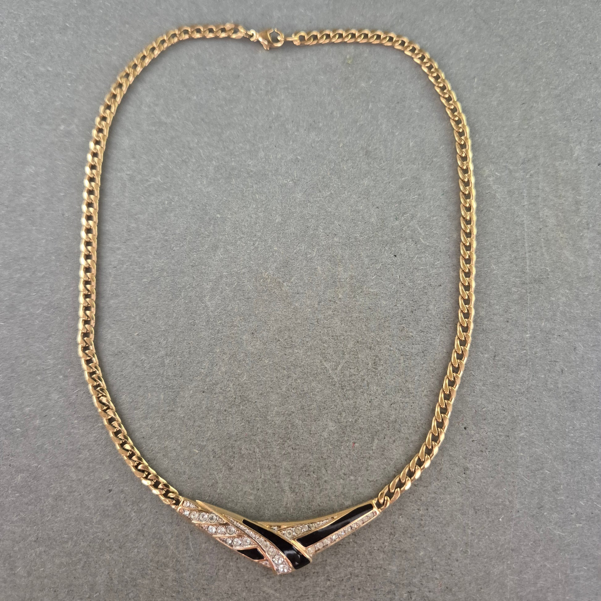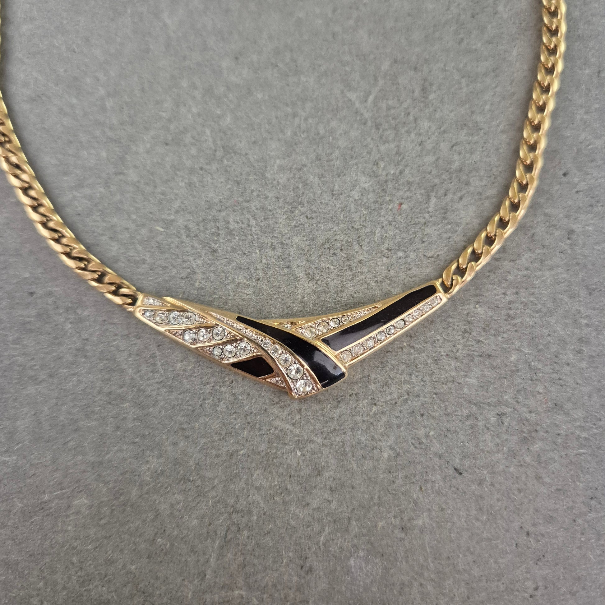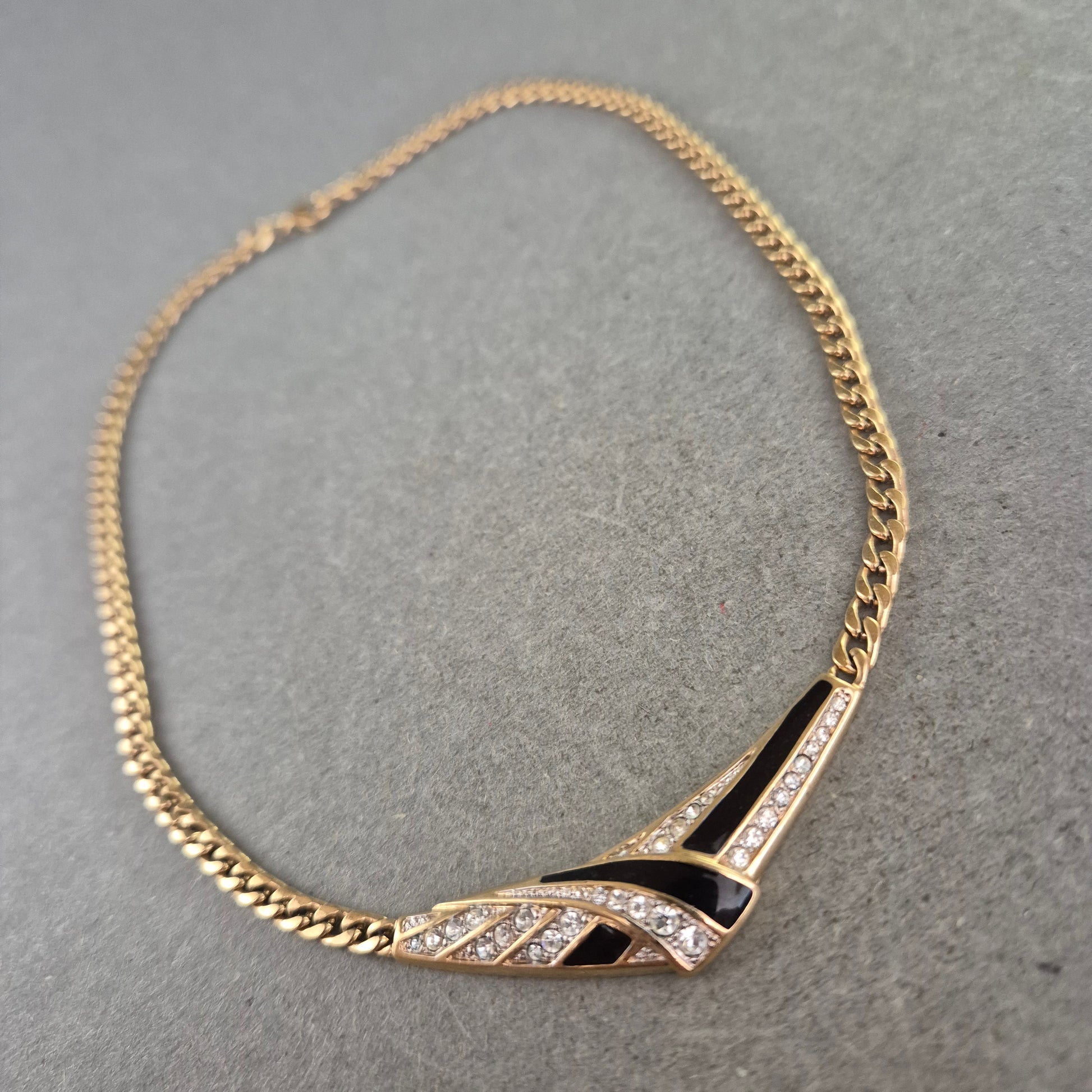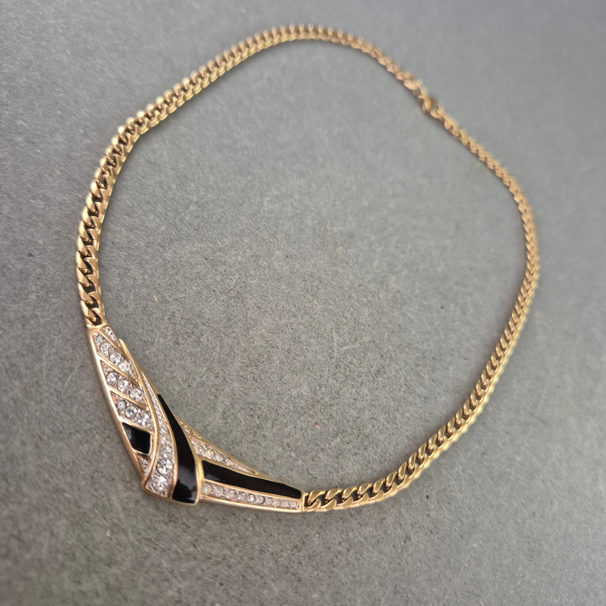 Diese Vintage Kette ist ein stilvoller Blickfang mit ihrem besonderen Mittelstück. Das elegante Design kombiniert schwarze und weiße Akzente, die mit funkelnden Steinen besetzt sind und so eine glamouröse Wirkung entfalten. Durch die massive Gliederkette erhält die Kette zusätzlich einen hochwertigen Charakter. Ein ideales Accessoire für elegante Outfits und besondere Anlässe.