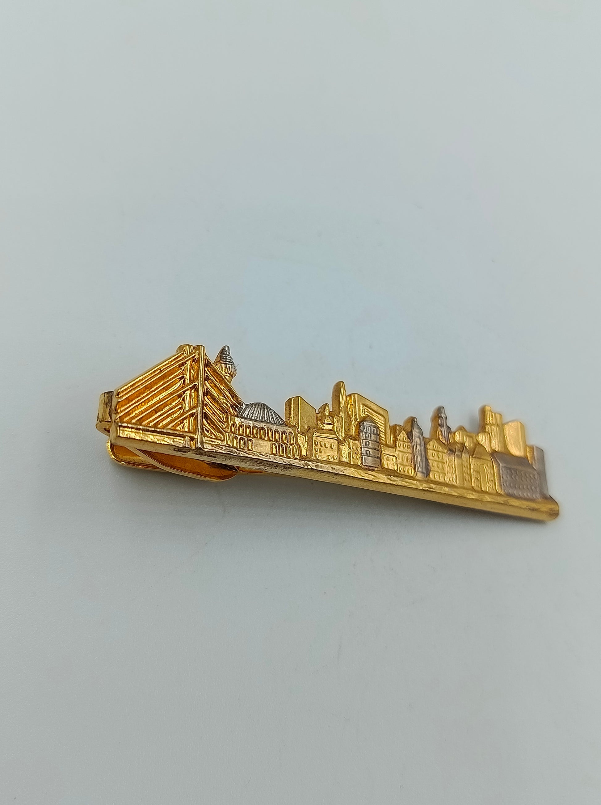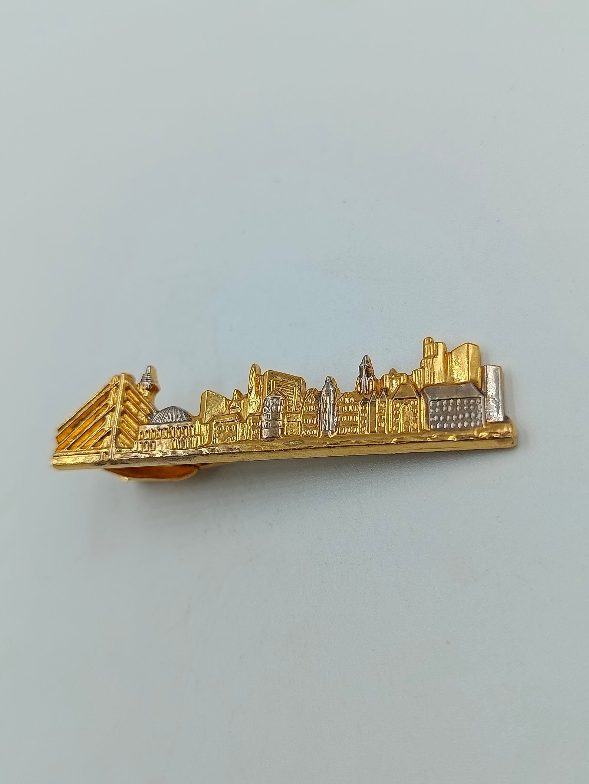 Ausgefallene Krawattenklammer im Vintage-Stil mit detailreicher Darstellung einer Stadtansicht. Das Schmuckstück ist teils vergoldet und versilbert, was den Gebäuden und Konturen einen schönen Kontrast verleiht. Ideal als Sammlerstück oder elegantes Accessoire für besondere Anlässe.